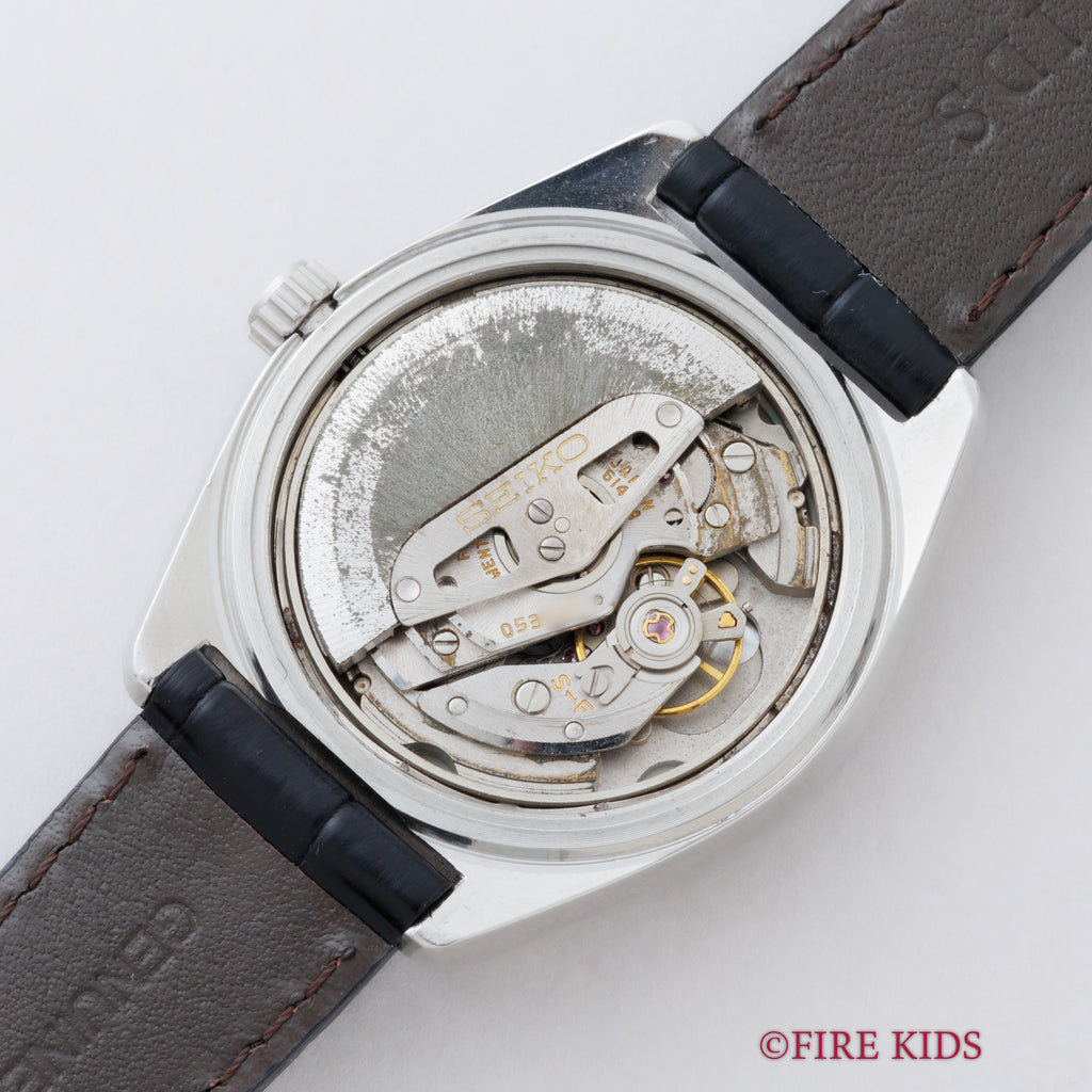 1969年製の61グランドセイコーです。セイコースタイルと呼ばれる独自のケースデザインが魅力的で、それまで海外の高級時計を意識したデザインから独自のデザインに変わり、セイコーの技術がスイス製に負けていないという自信がデザインにも現れている感じがします。こちらは文字盤の縦横にクロスラインが入り、ショートインデックスであることで文字盤事態の立体感とケースのセイコースタイルが調和している1本です。ムーブメントは自動巻き36000振動の6145Aを搭載、カレンダーの早送り付きで実用性もございます。ケースは小傷はございますが大きなダメージはございません。裏ブタのメダリオンもしっかり残っています。手巻きや針回しの操作はスムースです。ベルトはファイアーキッズオリジナルのクロコダイル革ベルトを合わせています。