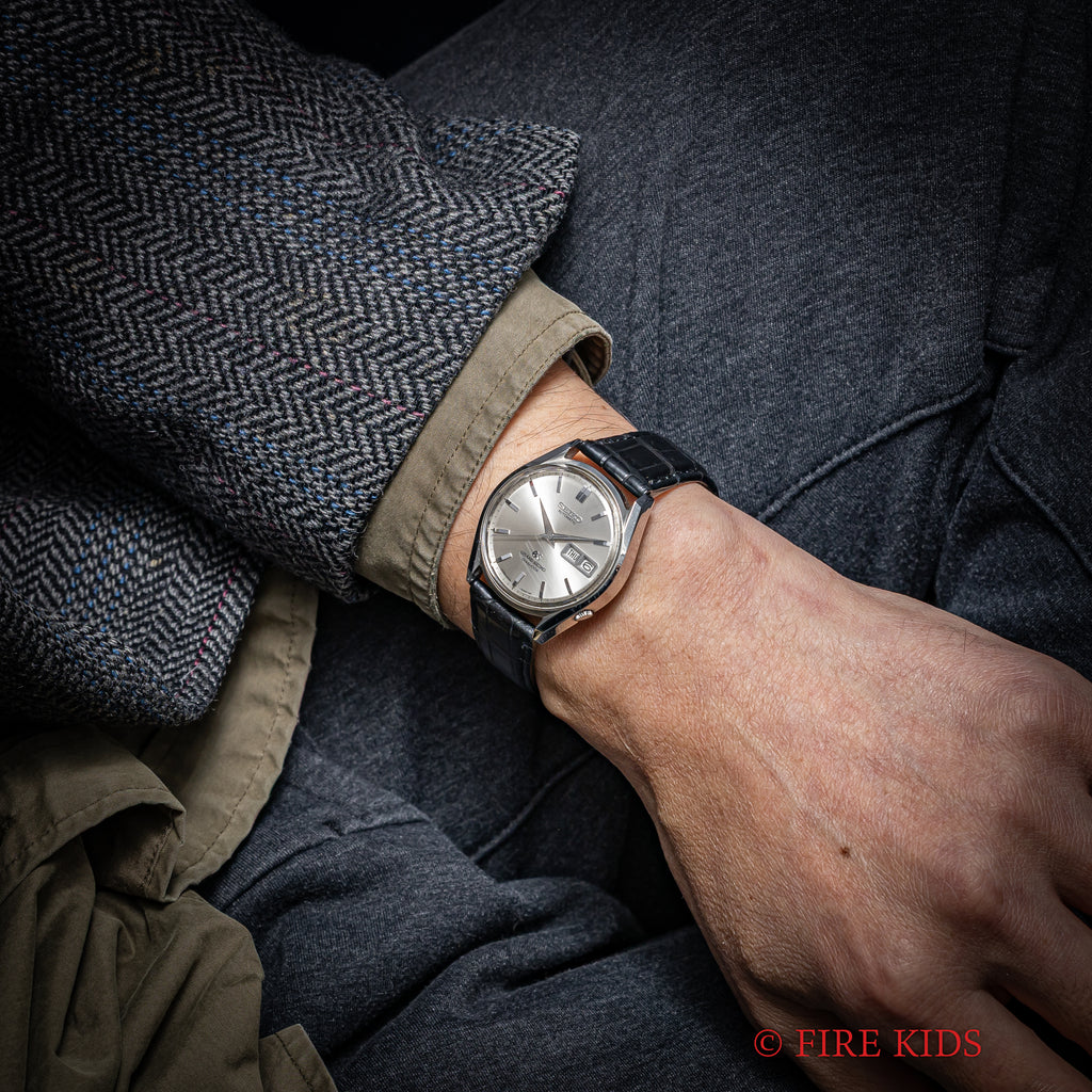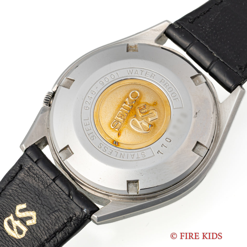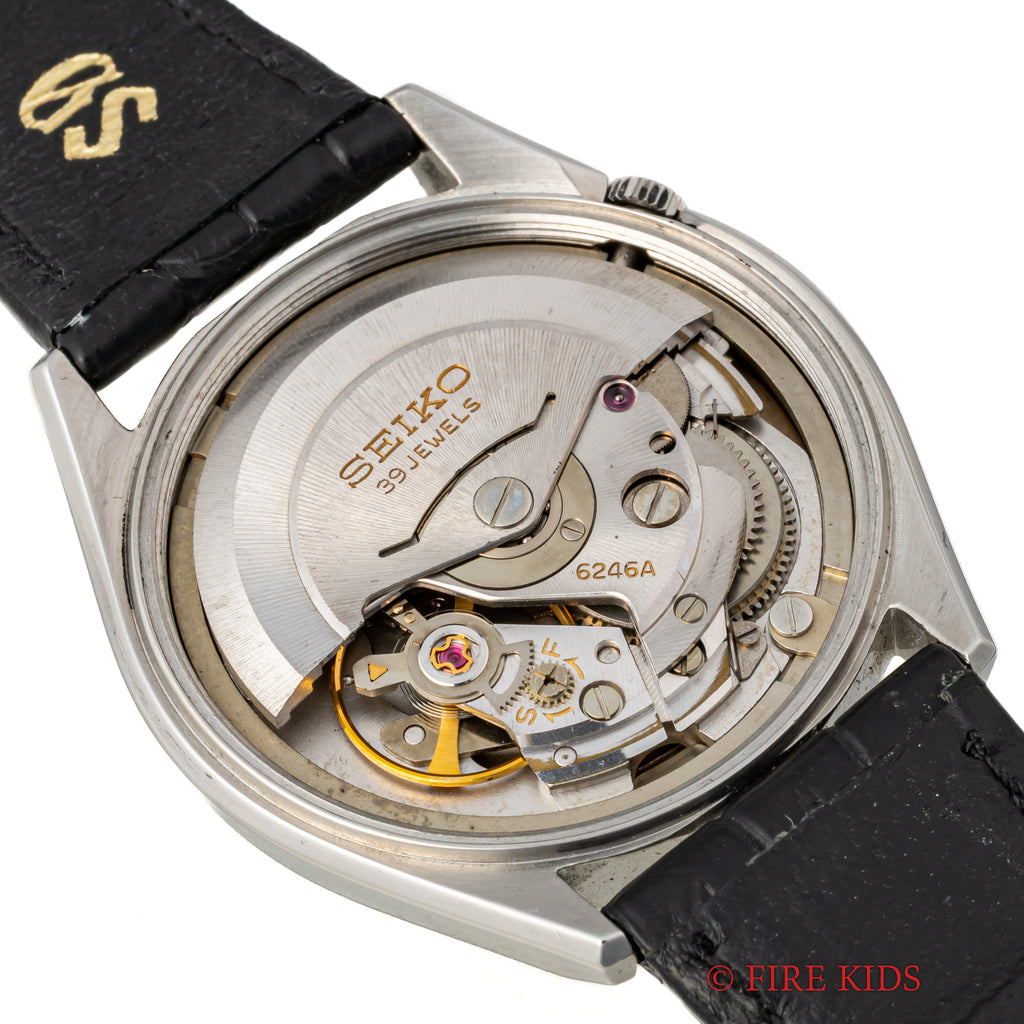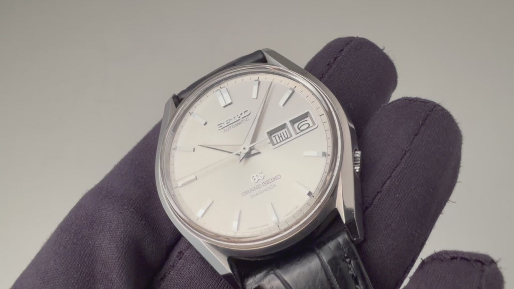 1967年製 グランドセイコー初の自動巻きモデル62GS 6246-9001です。それまでの手巻きグランドセイコーとは全く違うケースデザインですが文字盤の造りはグランドセイコーらしい仕上りです。デイデイト(日付曜日)付きモデルもグランドセイコー初になります。1960年代後半ハイビート化されて行く時代背景もあり約2年間という短い生産期間の為、希少なモデルになります。文字盤、ケース、メダリオンに至ってもかなり良いコンディションです。革ベルトは純正のクロコダイルに純正尾錠が付いています。