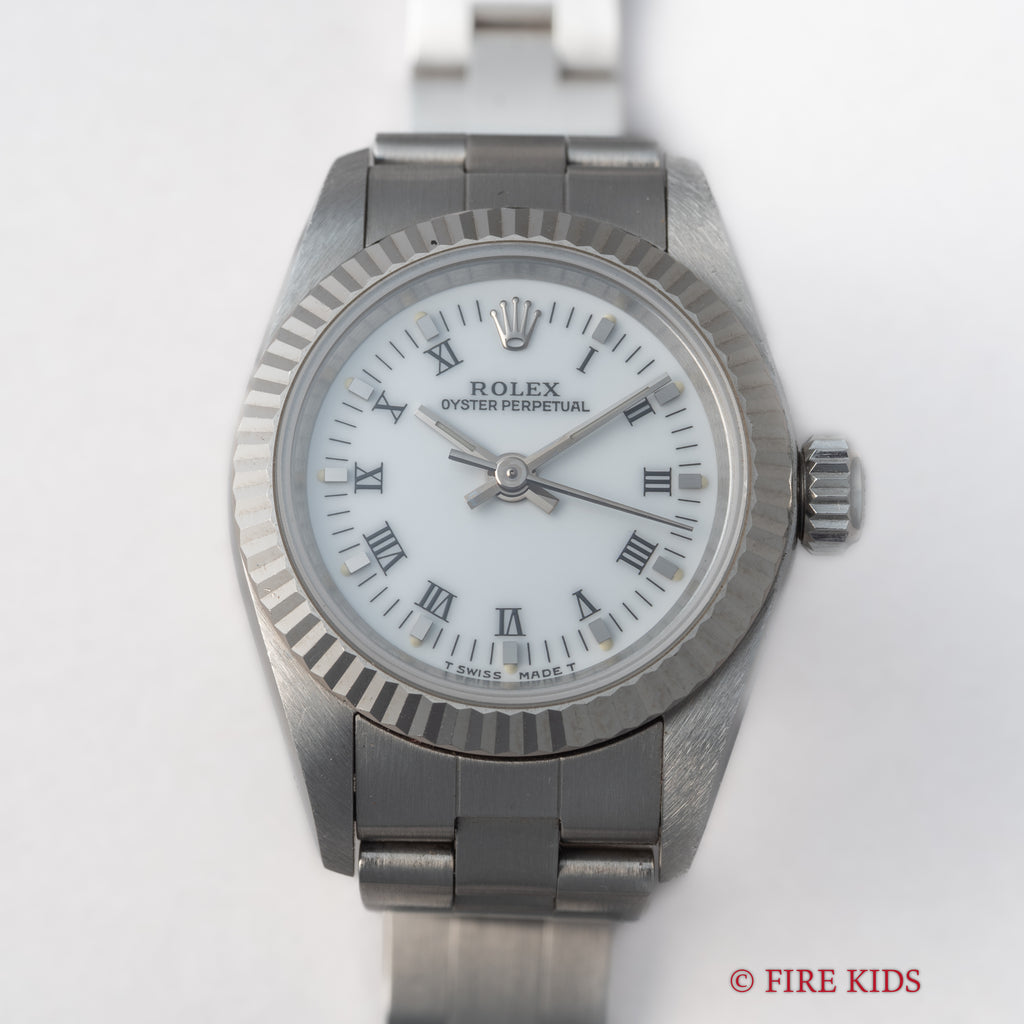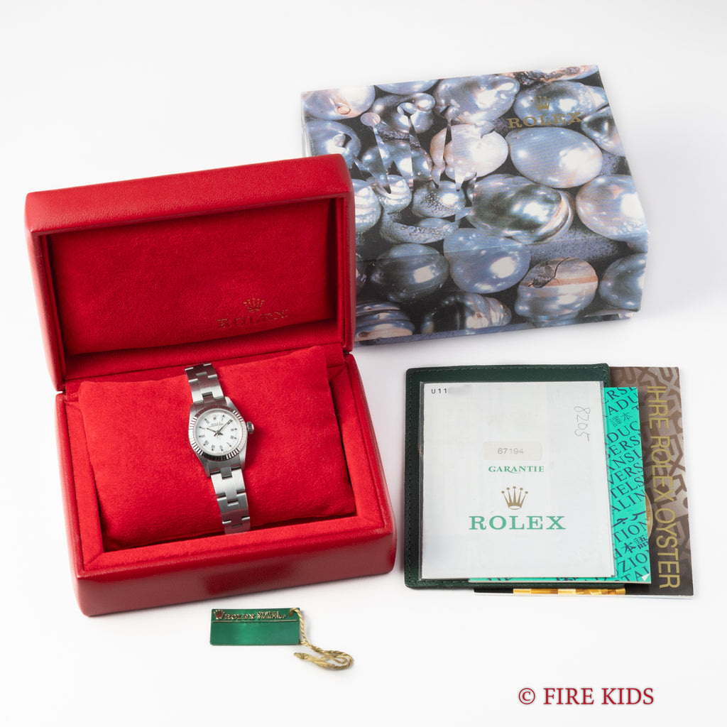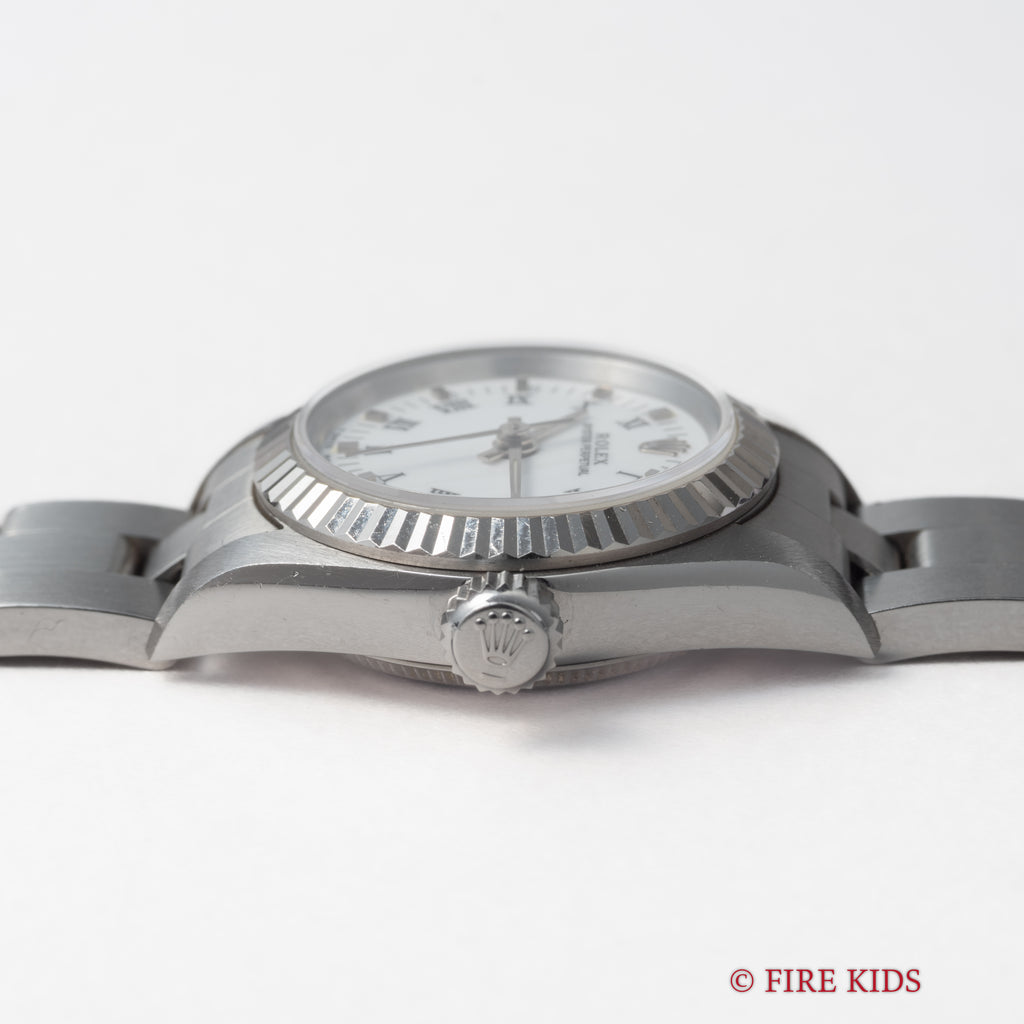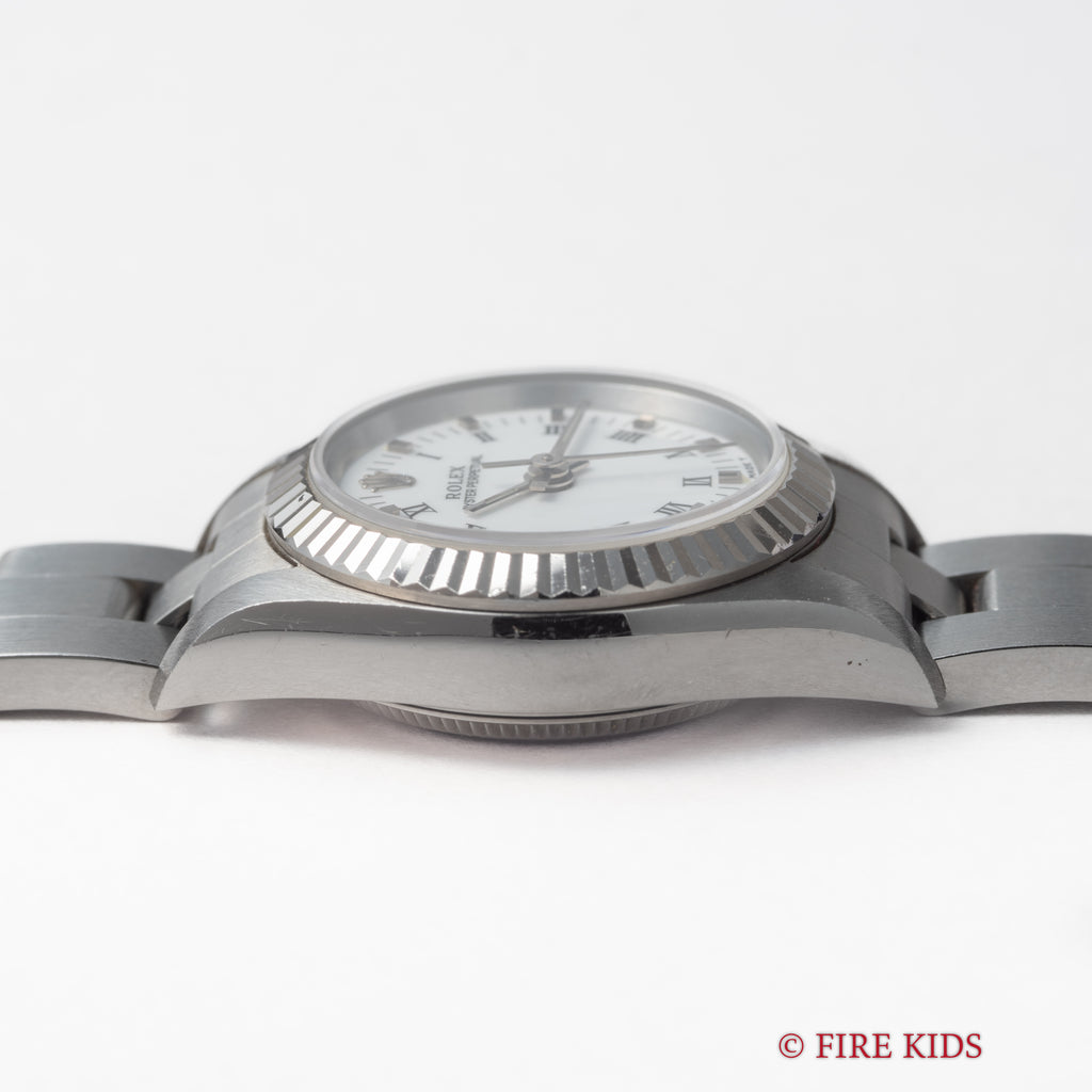 ロレックス Ref.67194 1997年製 ホワイトローマンダイヤル 箱、ギャラ、タグ、冊子付です。ホワイトローマンダイヤルにフルーテッドベゼルのエレガントな組み合わせの一本です。ダイヤル、ケースともに大きなダメージはありません。純正3連オイスターブレス付きです。裏蓋シールも残っています。箱、ギャラ、タグ、冊子付です。