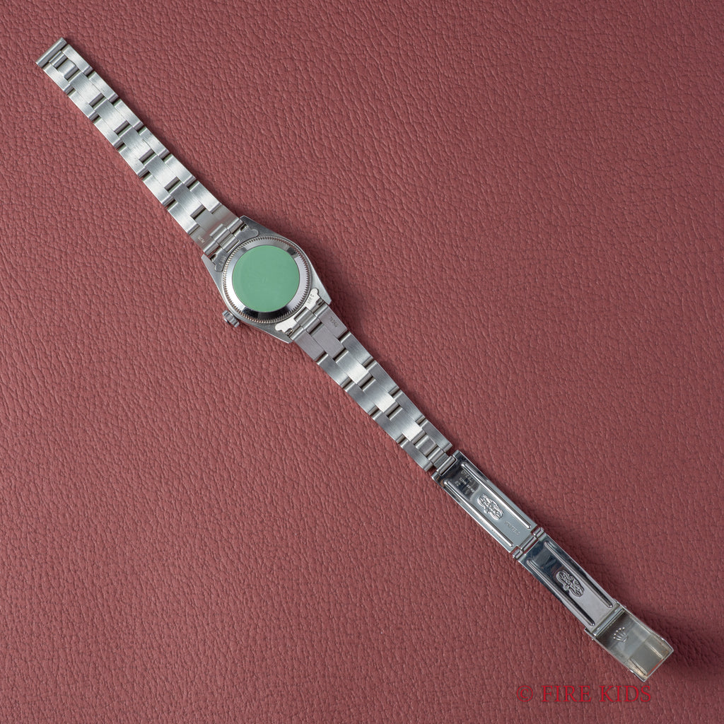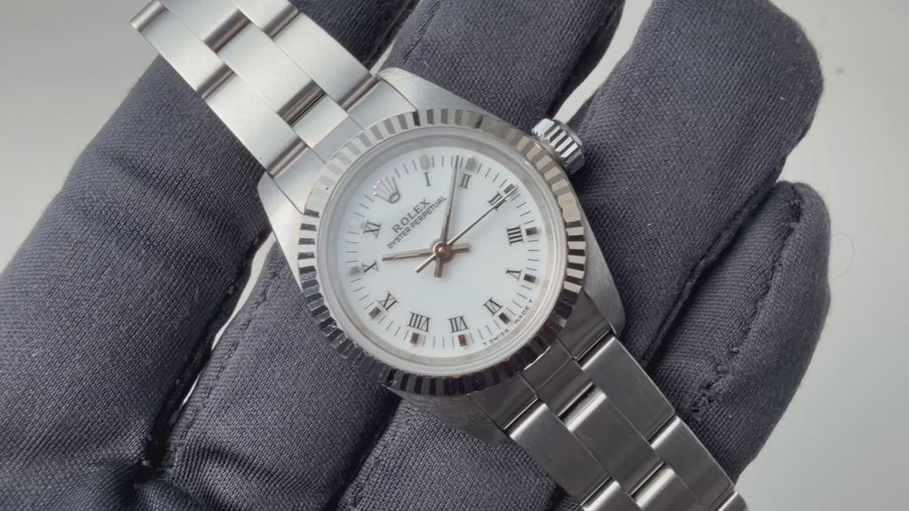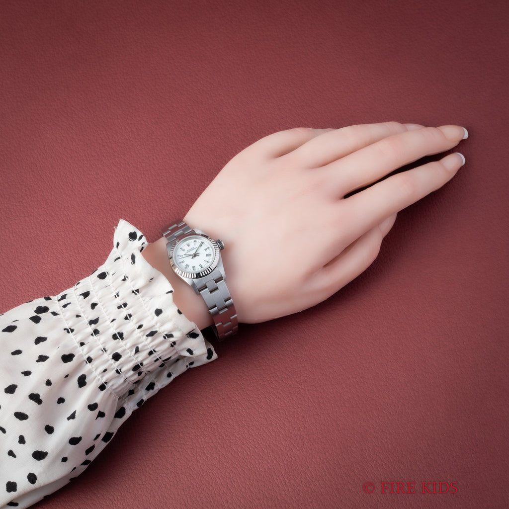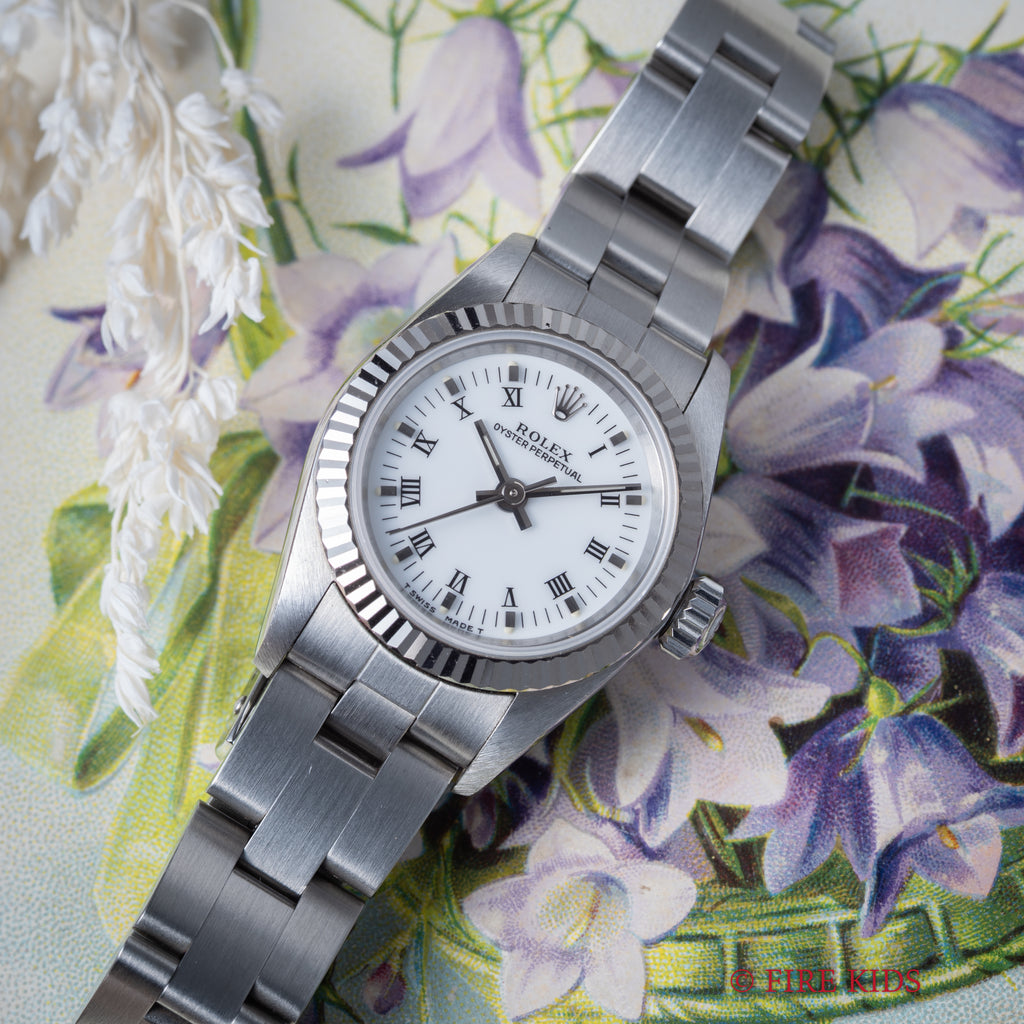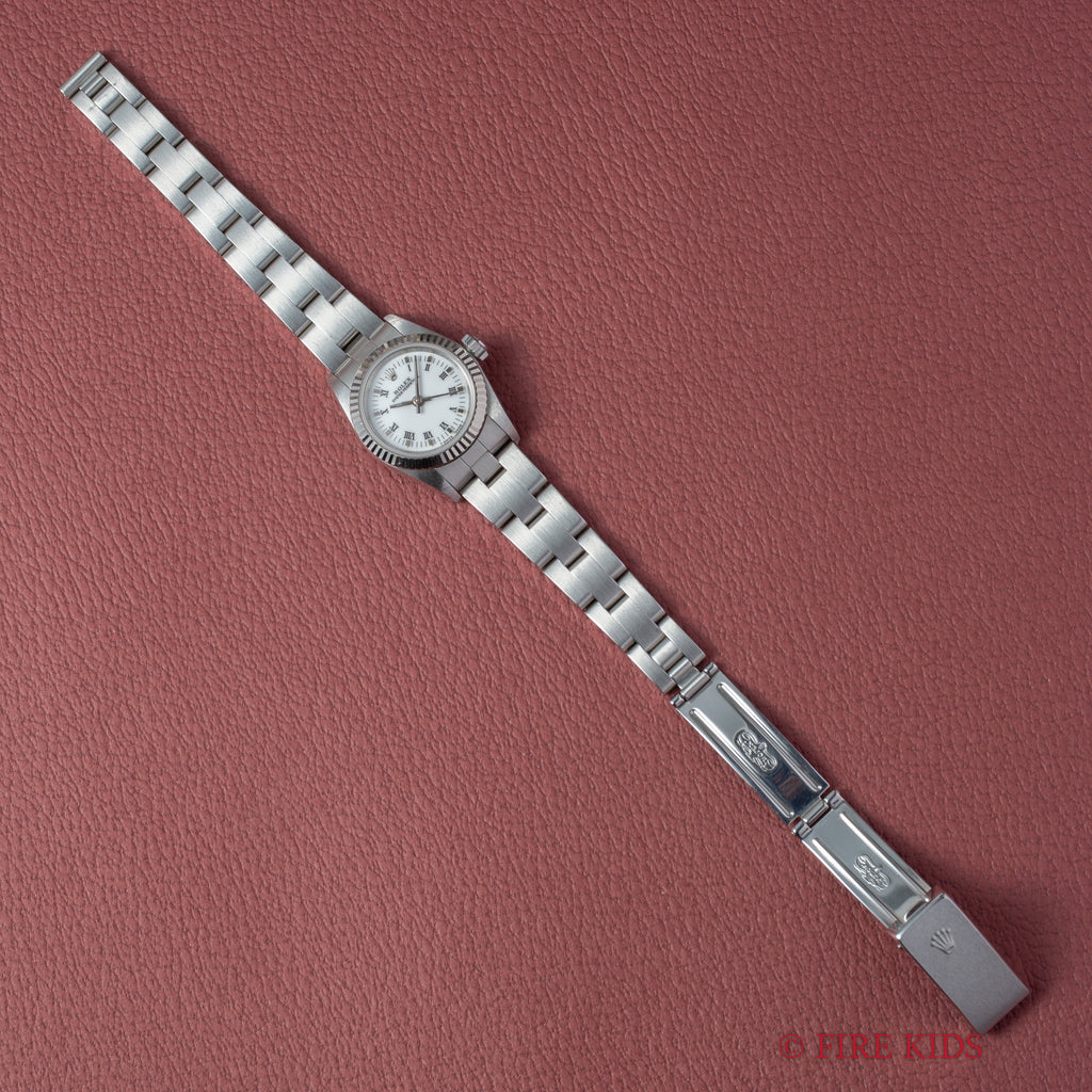 ロレックス Ref.67194 1997年製 ホワイトローマンダイヤル 箱、ギャラ、タグ、冊子付です。ホワイトローマンダイヤルにフルーテッドベゼルのエレガントな組み合わせの一本です。ダイヤル、ケースともに大きなダメージはありません。純正3連オイスターブレス付きです。裏蓋シールも残っています。箱、ギャラ、タグ、冊子付です。