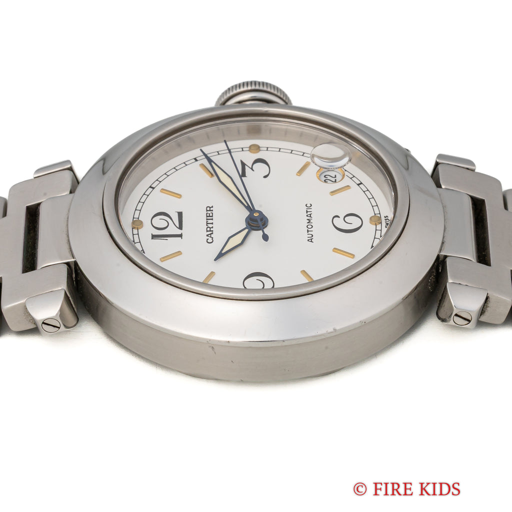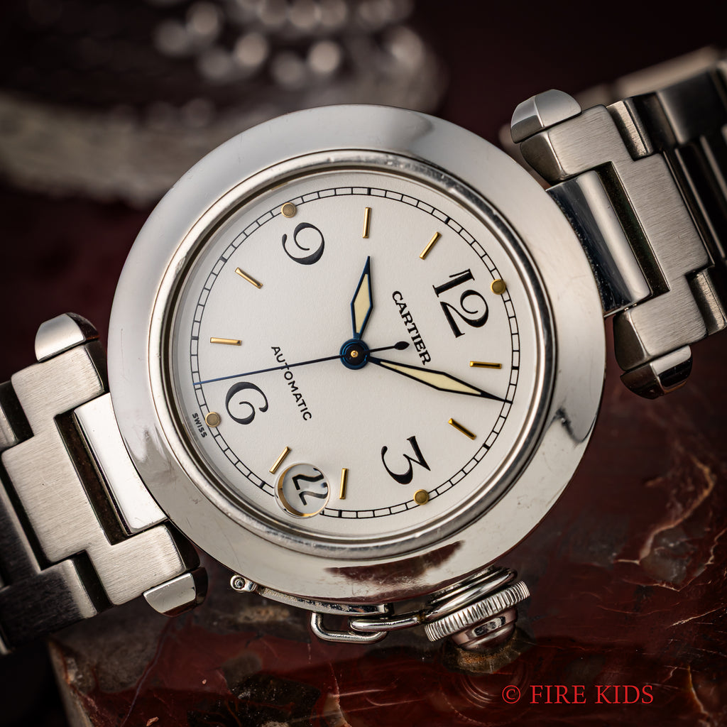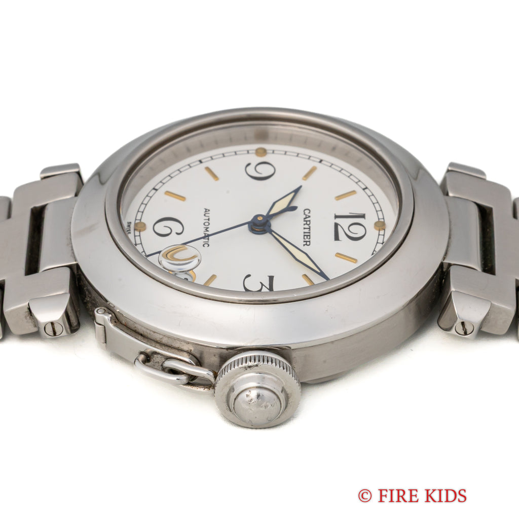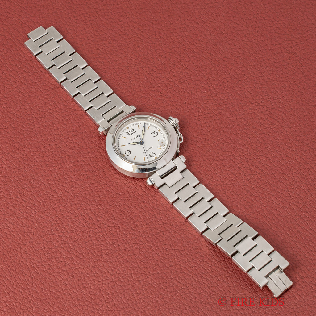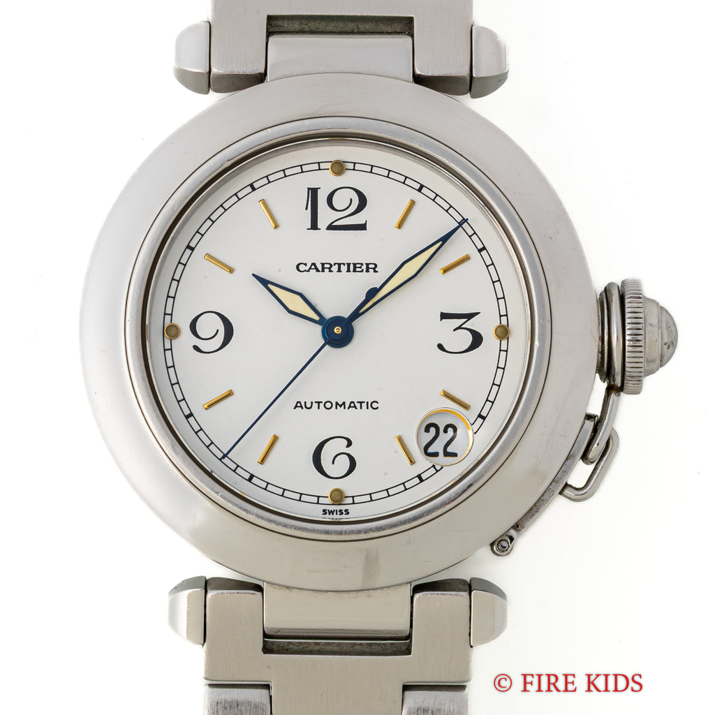 1990年代製のカルティエ「パシャC」です。ラグジュアリースポーツモデルの35㎜サイズで男女を問わず使いやすくてお洒落な1本です。ブルースチールの針とホワイトの文字盤のコントラストも抜群です。ケースは小傷が見られますが大きなダメージはありません。ベルトは純正のステンレスブレスが装着されています。