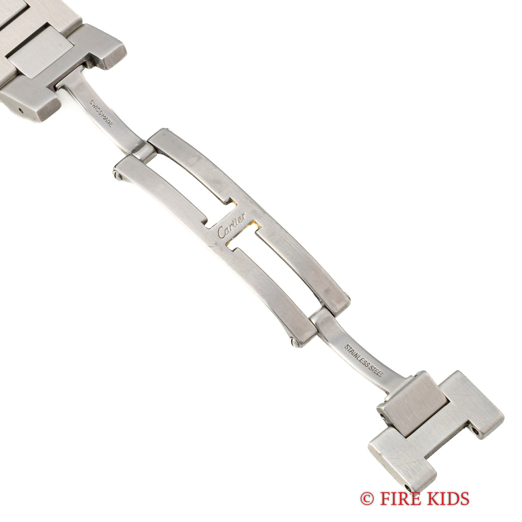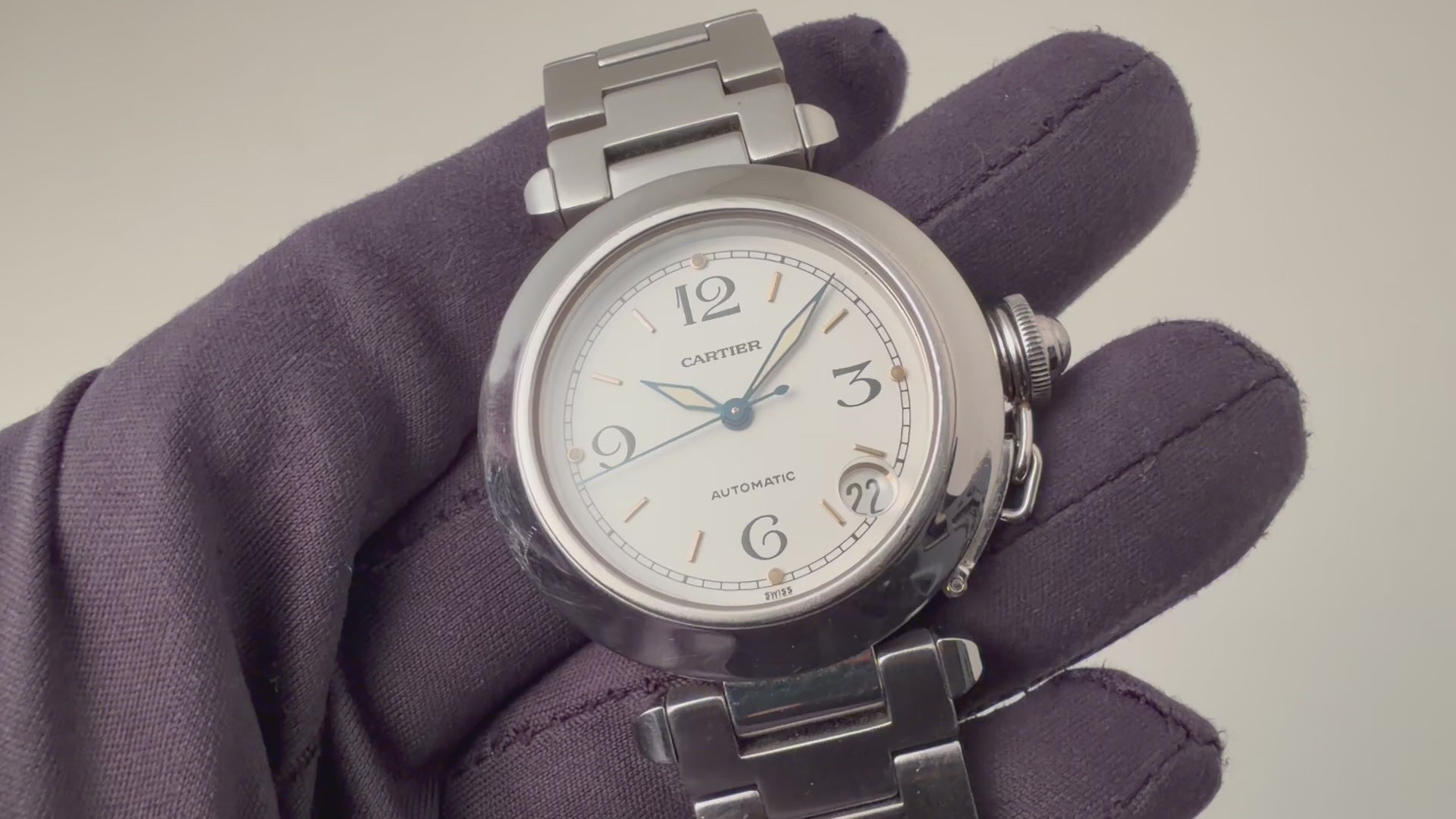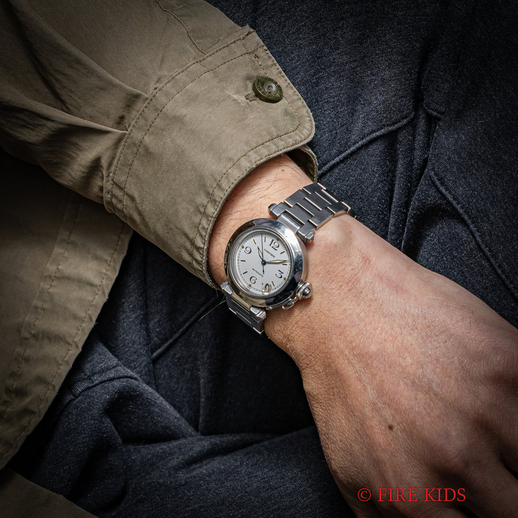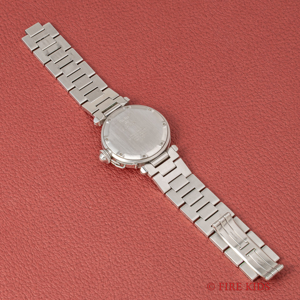 1990年代製のカルティエ「パシャC」です。ラグジュアリースポーツモデルの35㎜サイズで男女を問わず使いやすくてお洒落な1本です。ブルースチールの針とホワイトの文字盤のコントラストも抜群です。ケースは小傷が見られますが大きなダメージはありません。ベルトは純正のステンレスブレスが装着されています。