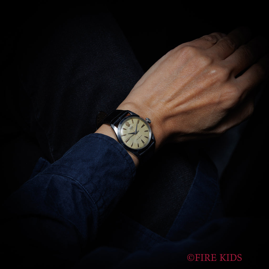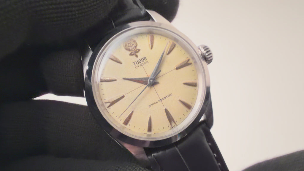 チューダー オイスター デカバラ ノンデイト 1950年代製 Ref.7934 王冠リューズ オリジナルダイヤルの入荷になります。ヴィンテージチューダーの中でも圧倒的な人気を誇るデカ薔薇、12時位置にある立体的な薔薇がとても魅力的です。人気のノンデイトのクロスラインダイヤルで綺麗とは言えませんが希少なオリジナルダイヤルです。ねじ込みリューズと裏蓋にはROLEXのディフュージョンブランドをアピールする王冠マークがあしらわれています。手巻きや針回し、リューズの操作はスムースです。ベルトはファイアーキッズオリジナルのクロコダイル革ベルトが取り付けられています。