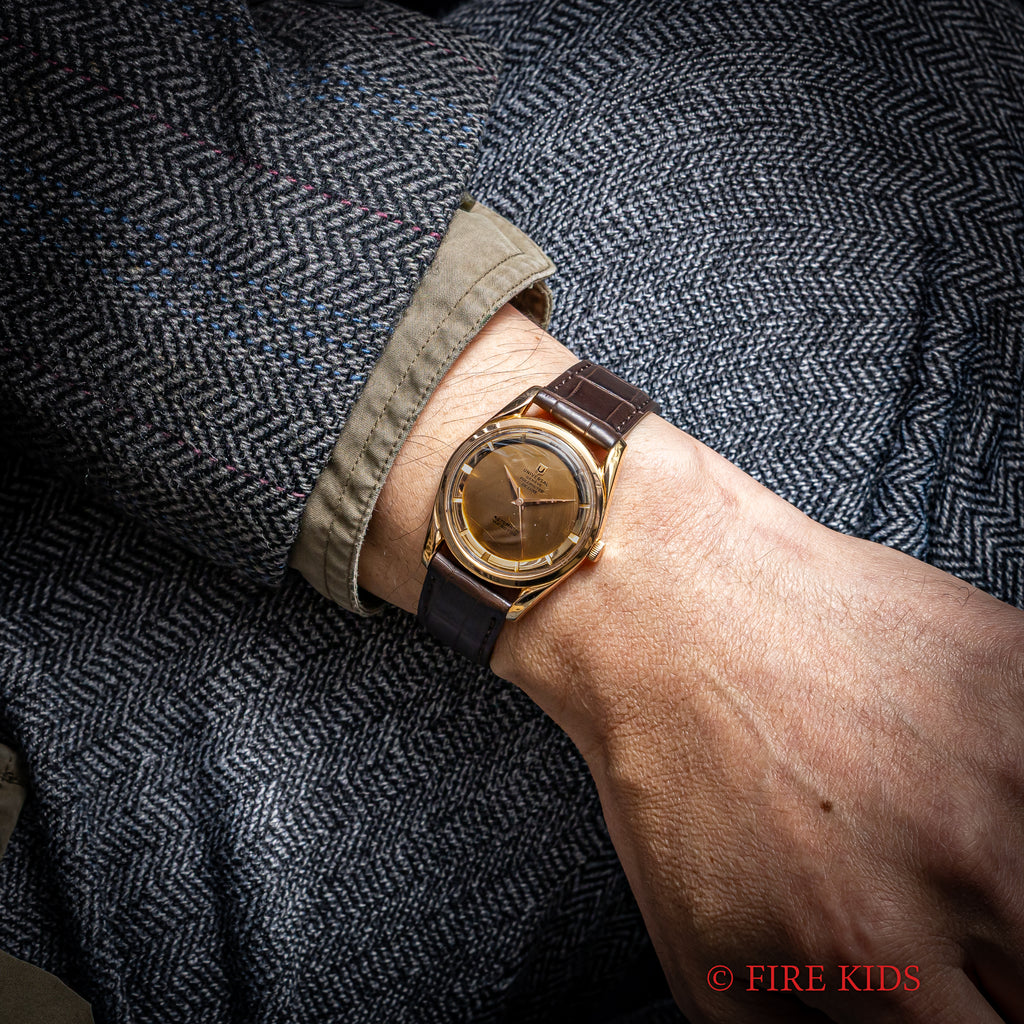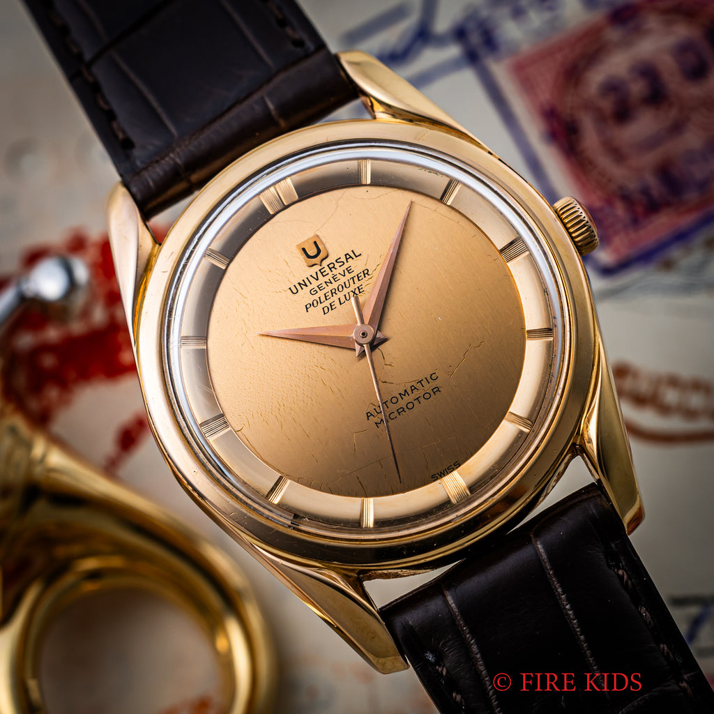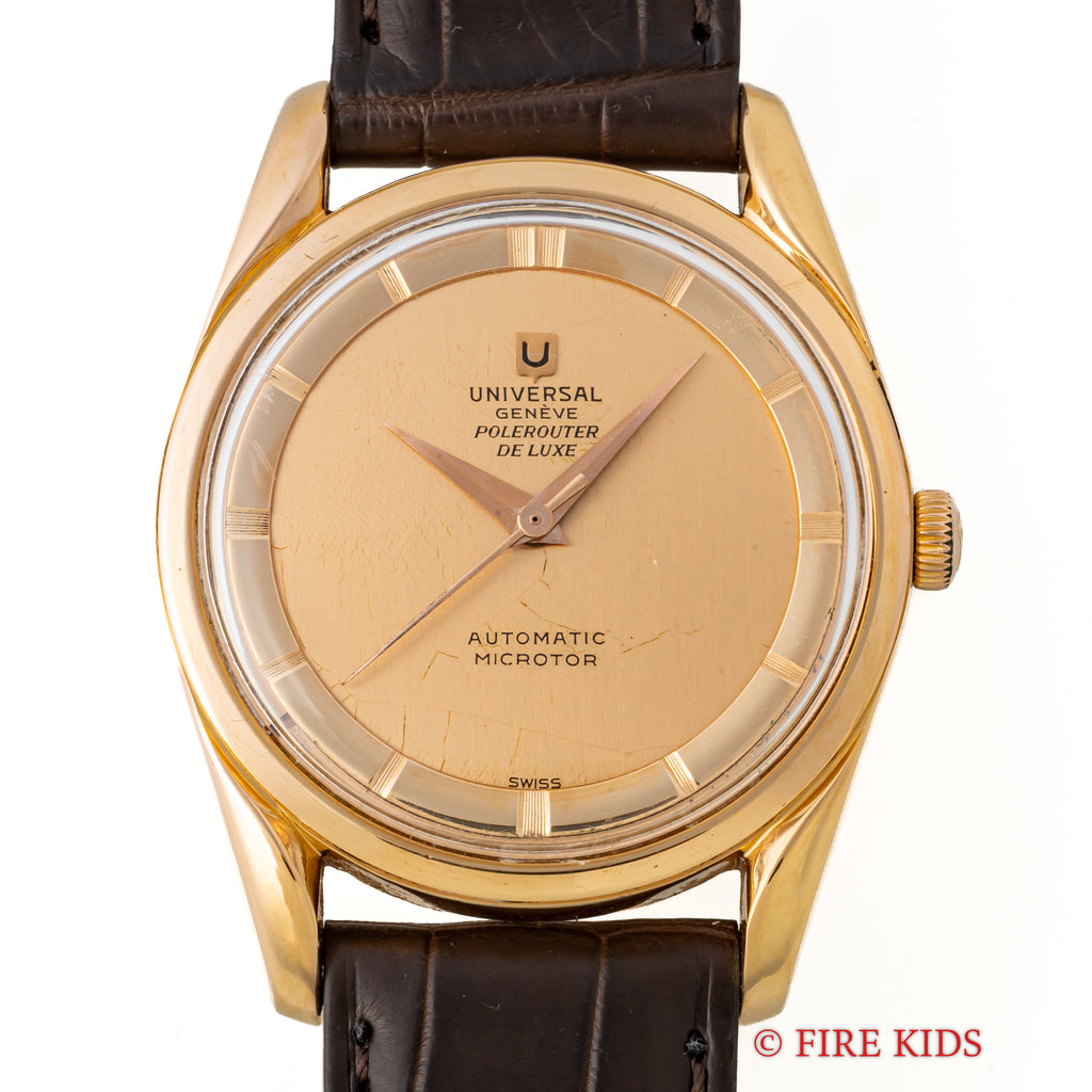 ユニバーサル・ジュネーブ 18金無垢PG ポールルーター デラックス 1957年製 自動巻 Cal.215の入荷になります。巨匠ジェラルド・ジェンタ氏の時計では初めてのデザインとされるポールルーターでも希少な18金無垢ピンクゴールドケース、ノンデイトのタキシードダイヤルです。文字盤はシミ等無く綺麗です。ケースは小傷が見られますが大きなダメージはありません。ムーブメントはマイクロローター自動巻のcal.215を搭載しています。ベルトはファイアーキッズオリジナルのクロコダイル革ベルトが取り付けられています。