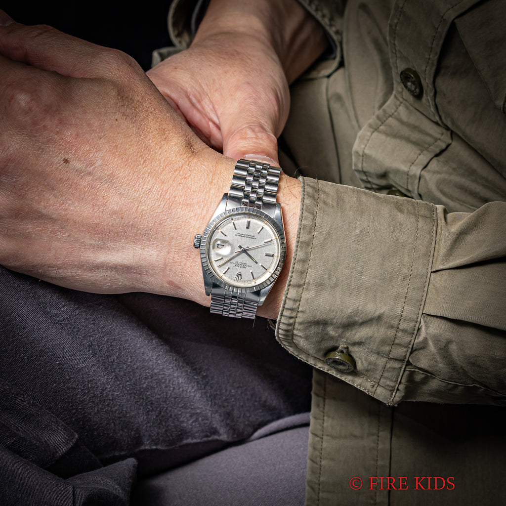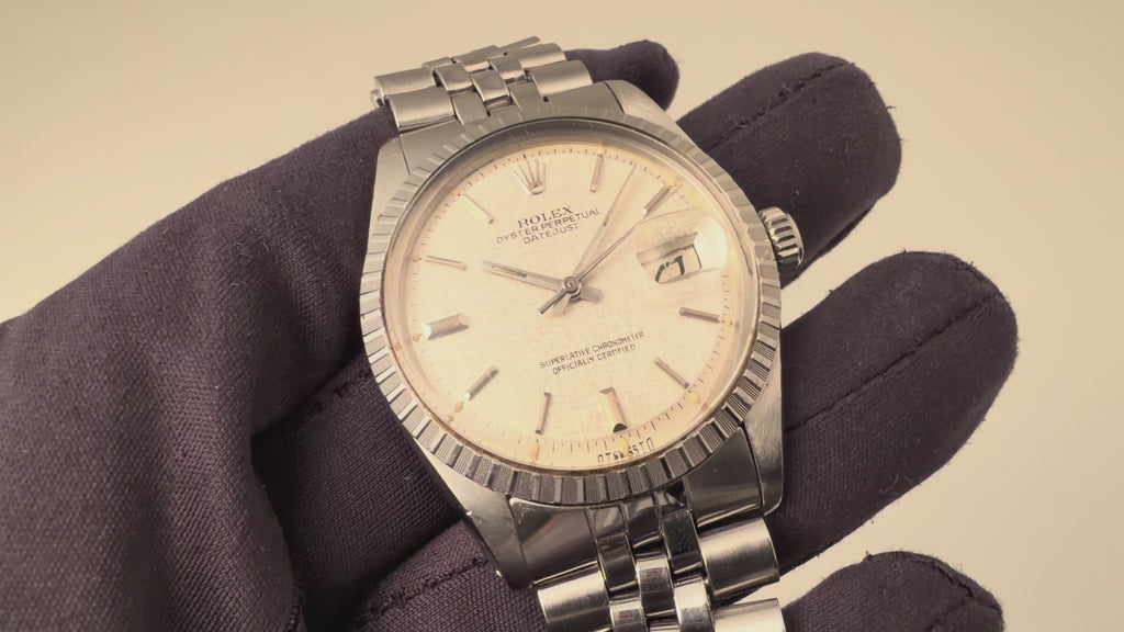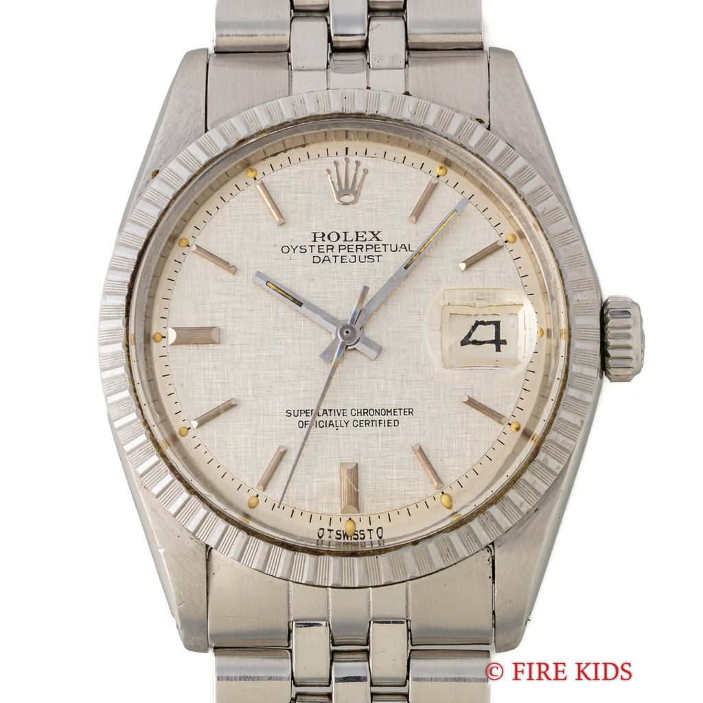 ロレックス 1971年製 デイトジャスト36 Ref.1603 リネンダイヤル 純正ジュビリーブレスの入荷になります。彫刻刀で彫り込んだようなギザギザのエングレーブドベゼルはステンレス製で、Ref.1601のフルーテッドベゼルとはまた違った質感や雰囲気があります。高級感のあるシルバーリネン(絹目)ダイヤルは状態も良く、モザイクダイヤルとも呼ばれています。ムーブメントは名機のCal.1570を搭載、ハック付きです。ケースは小傷程度で大きなダメージはありません。手巻きや針回し、ねじ込みリューズの操作はスムースです。ベルトは純正ステンレスブレス6251H/FF55が取り付けてあります。