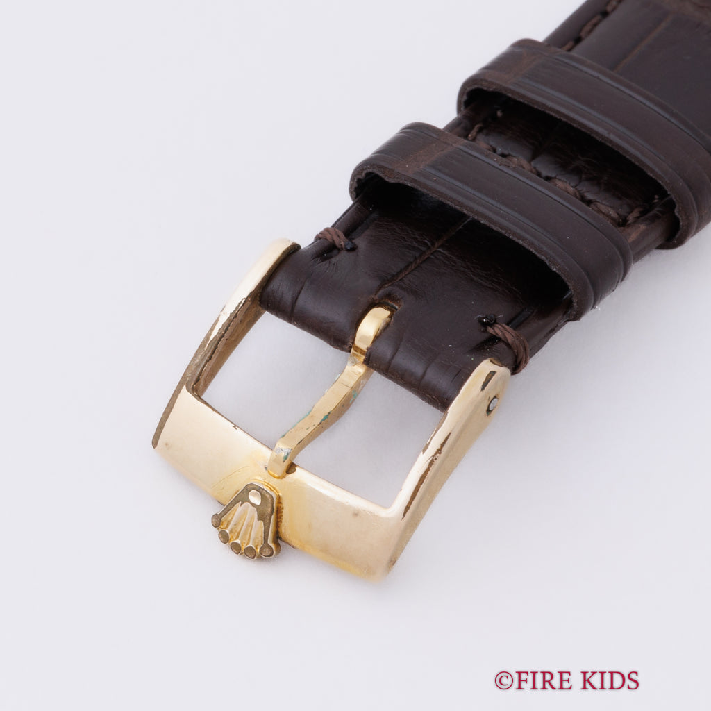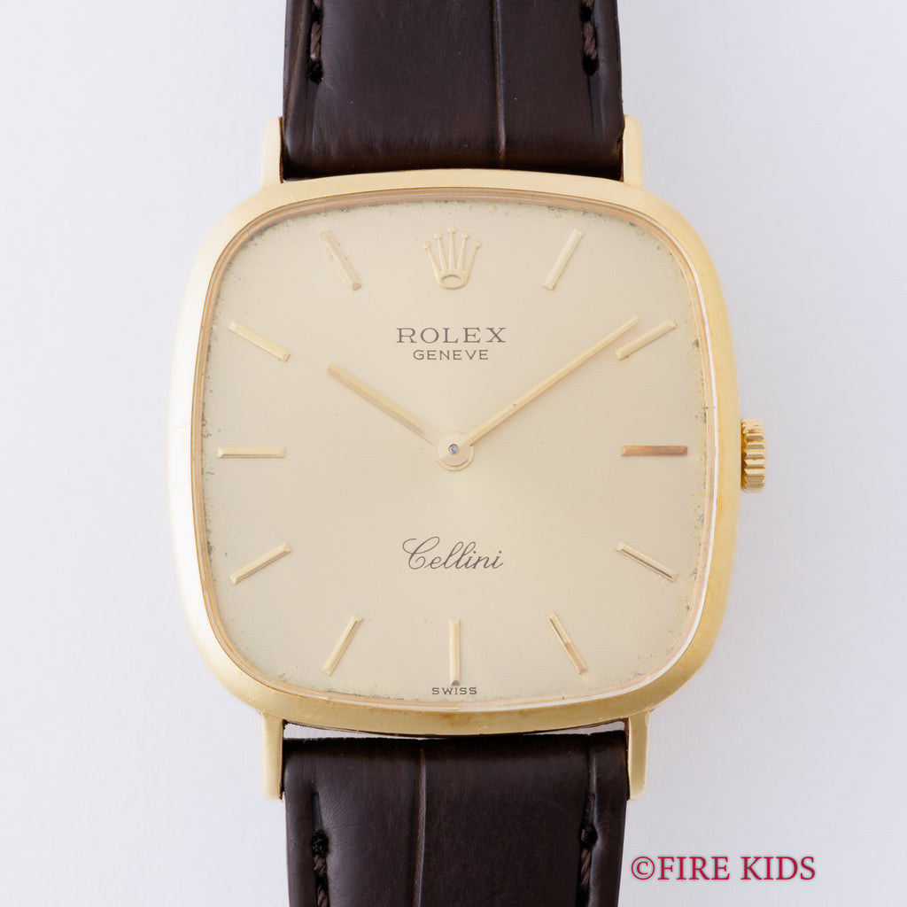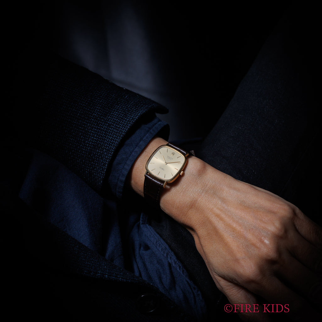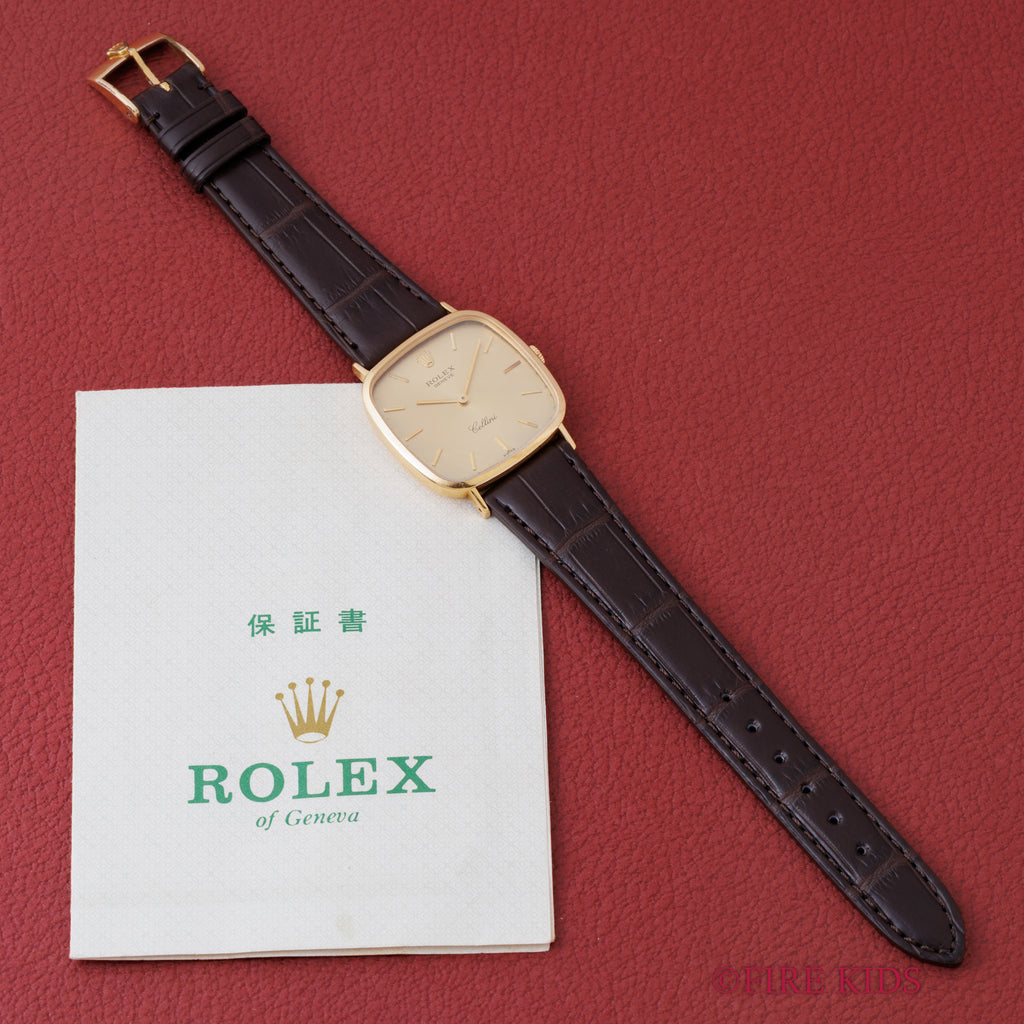 ロレックス チェリーニ スクエア Ref.4114 18金イエローゴールド 純正尾錠付き ギャラ付きです。チェリーニの中でも珍しいTVスクリーン型の一本。文字盤は外周に多少の経年はありますが、大きなダメージはありません。ケースも小傷程度です。ファイアーキッズオリジナルのクロコダイル革ベルトに純正GP尾錠付きです。ギャランティーが付属します。