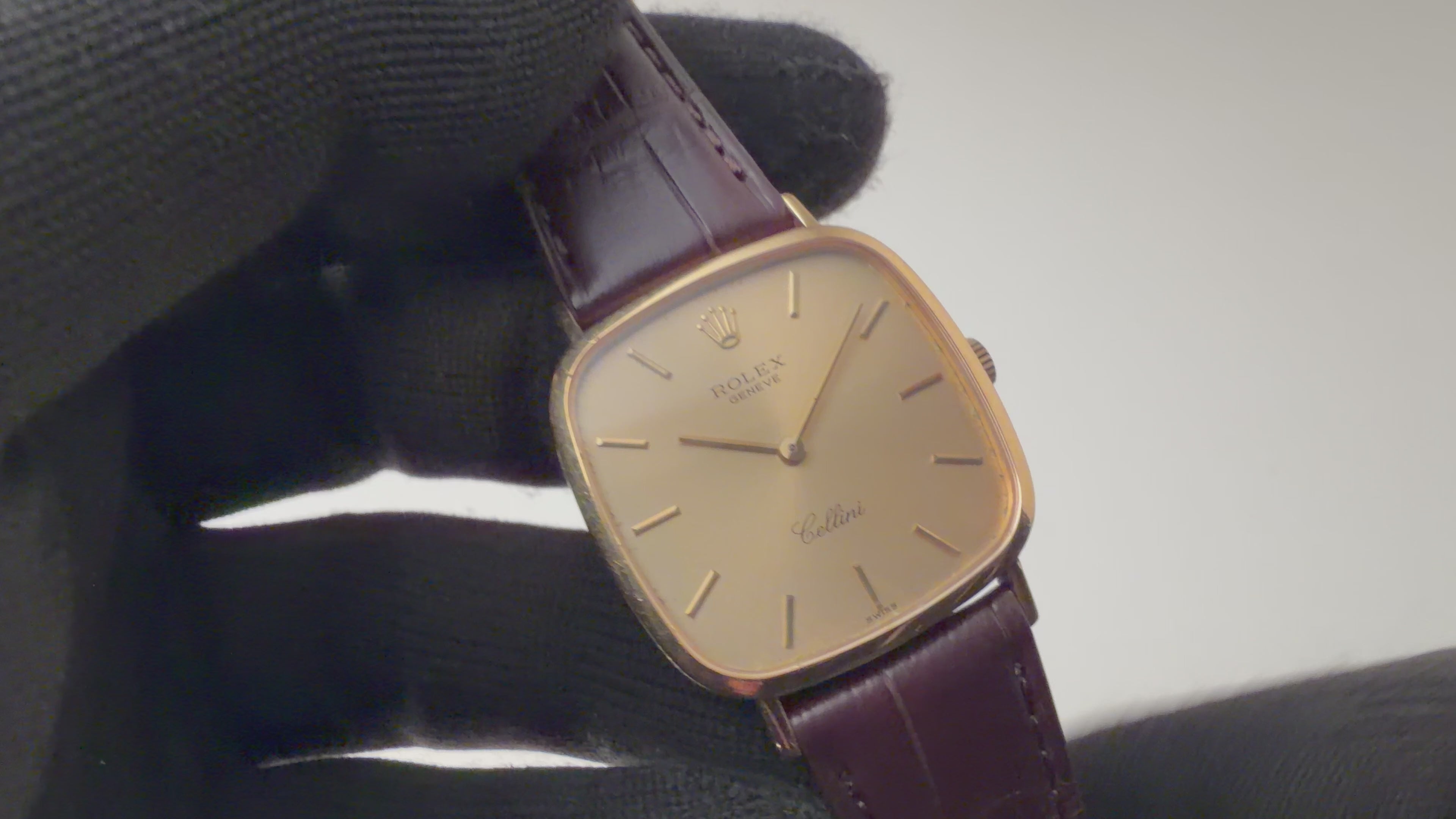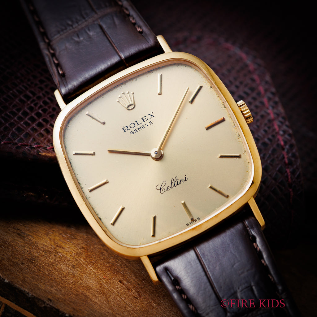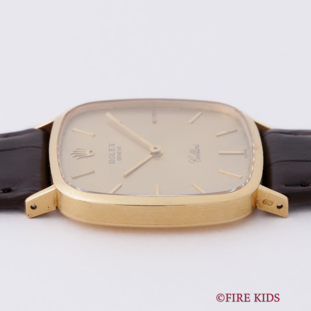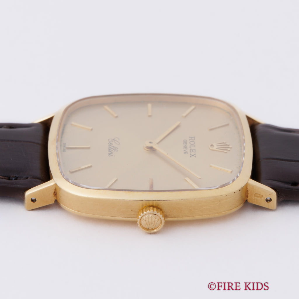 ロレックス チェリーニ スクエア Ref.4114 18金イエローゴールド 純正尾錠付き ギャラ付きです。チェリーニの中でも珍しいTVスクリーン型の一本。文字盤は外周に多少の経年はありますが、大きなダメージはありません。ケースも小傷程度です。ファイアーキッズオリジナルのクロコダイル革ベルトに純正GP尾錠付きです。ギャランティーが付属します。