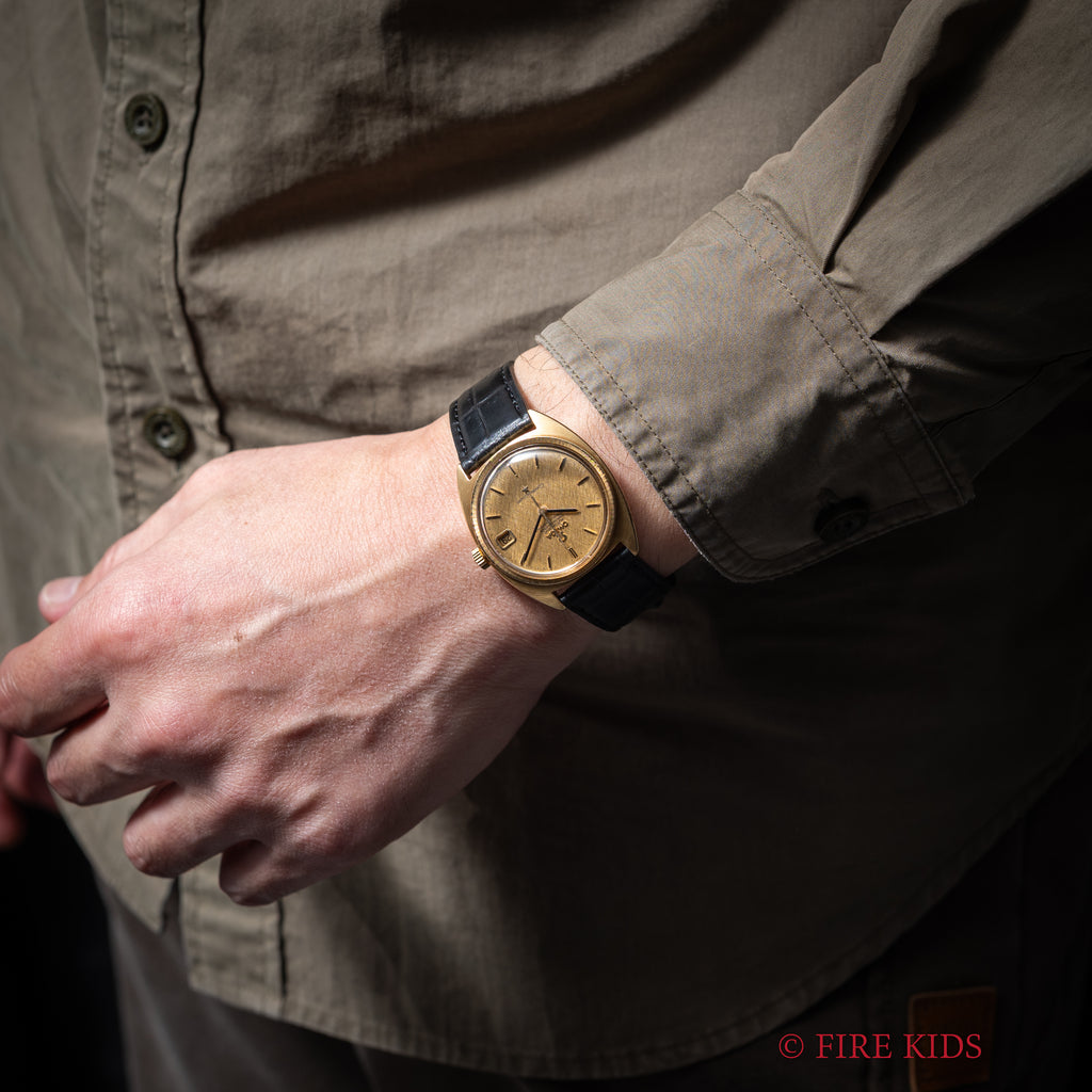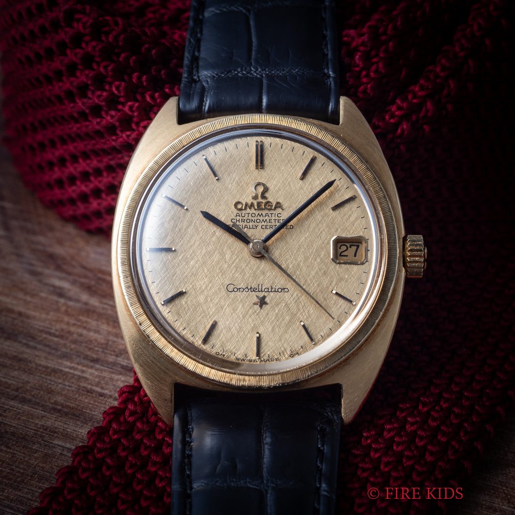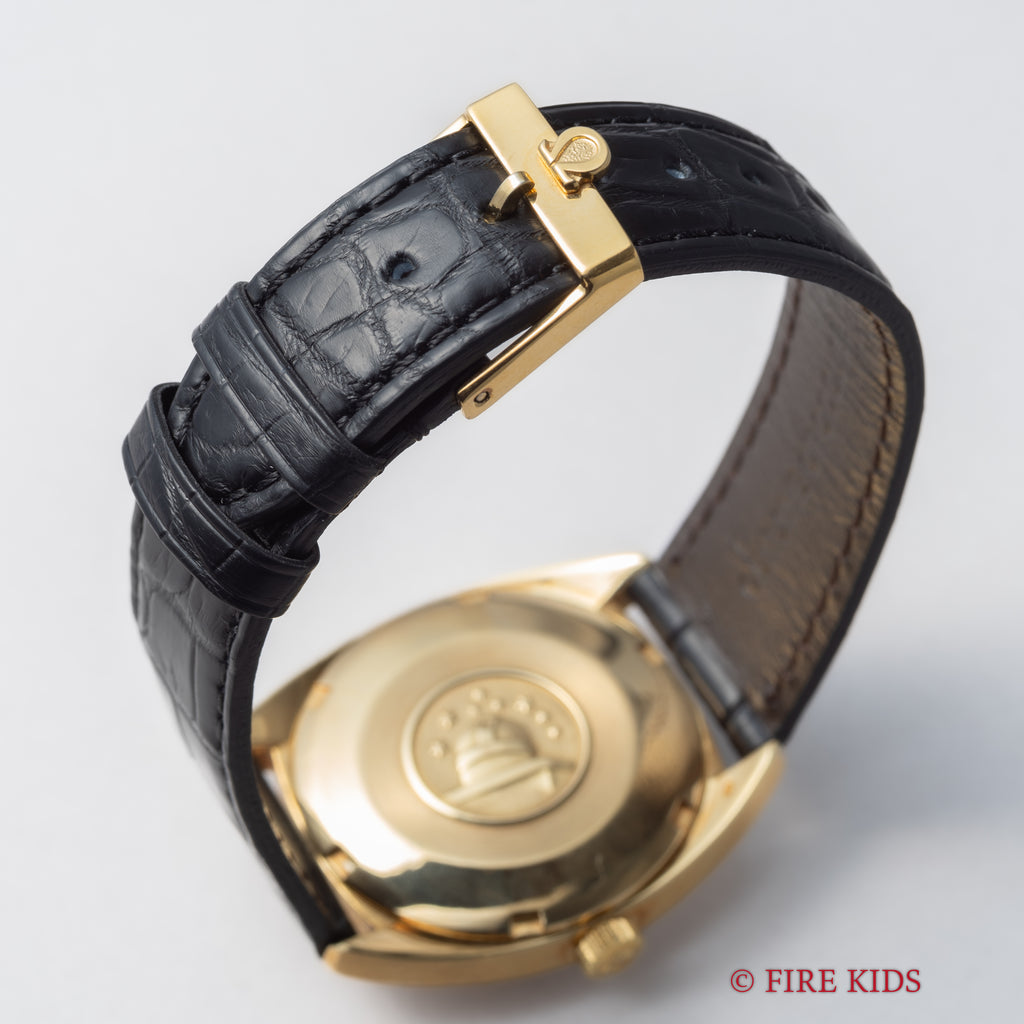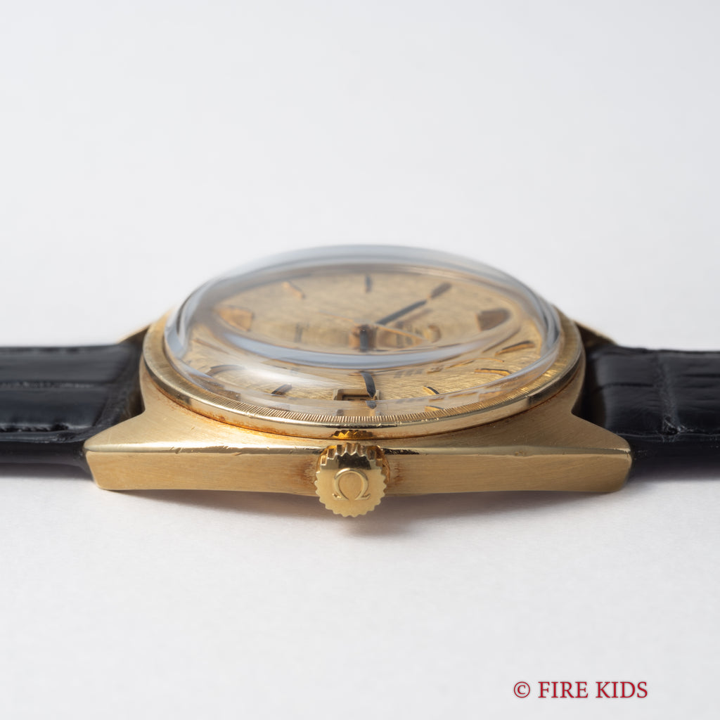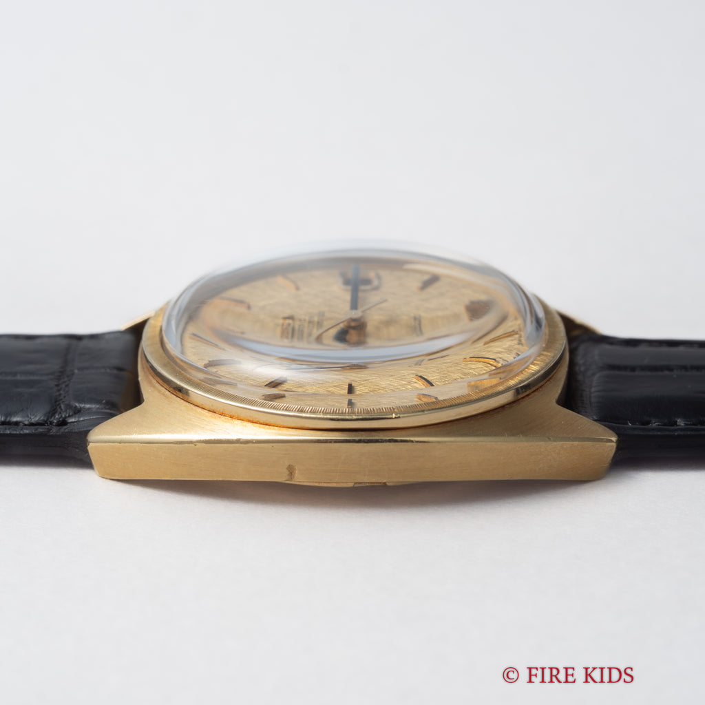 1969年製のオメガ コンステレーションCライン 18金無垢イエローゴールド Ref.168.009が入荷しました。世界一の時計デザイナーと呼ばれるジェラルド・ジェンタ氏のデザインの代表作の一つです。18金無垢製のケースにシャンパンゴールドのリネンダイヤルの非常に高級感のある仕上がりで、当時のハイグレードモデルであったことは想像に難くありません。コンディションも年代なりの使用傷は多少ありますが金無垢にありがちな痩せ感や大きな打痕は無く、良好な状態を維持しています。機械はクロノメーターのCal.564を搭載し、ファンクションも問題ありません。リューズ二段引きで日付の早送りが可能です。ファイアーキッズオリジナルのクロコダイル革ベルトに純正尾錠付きです。