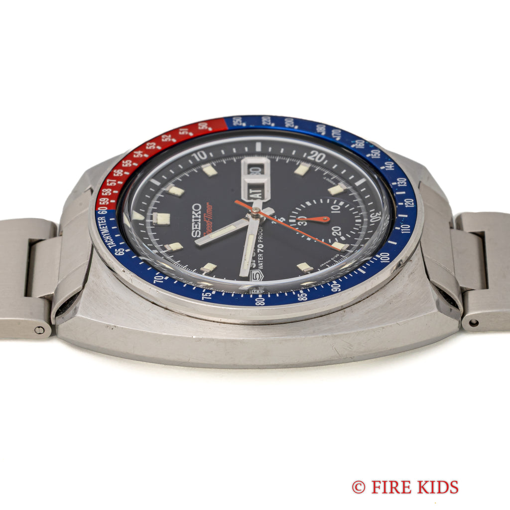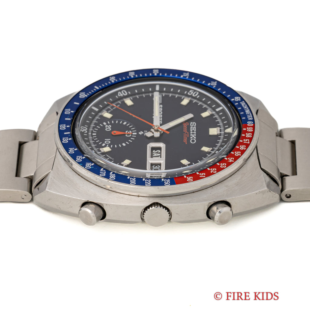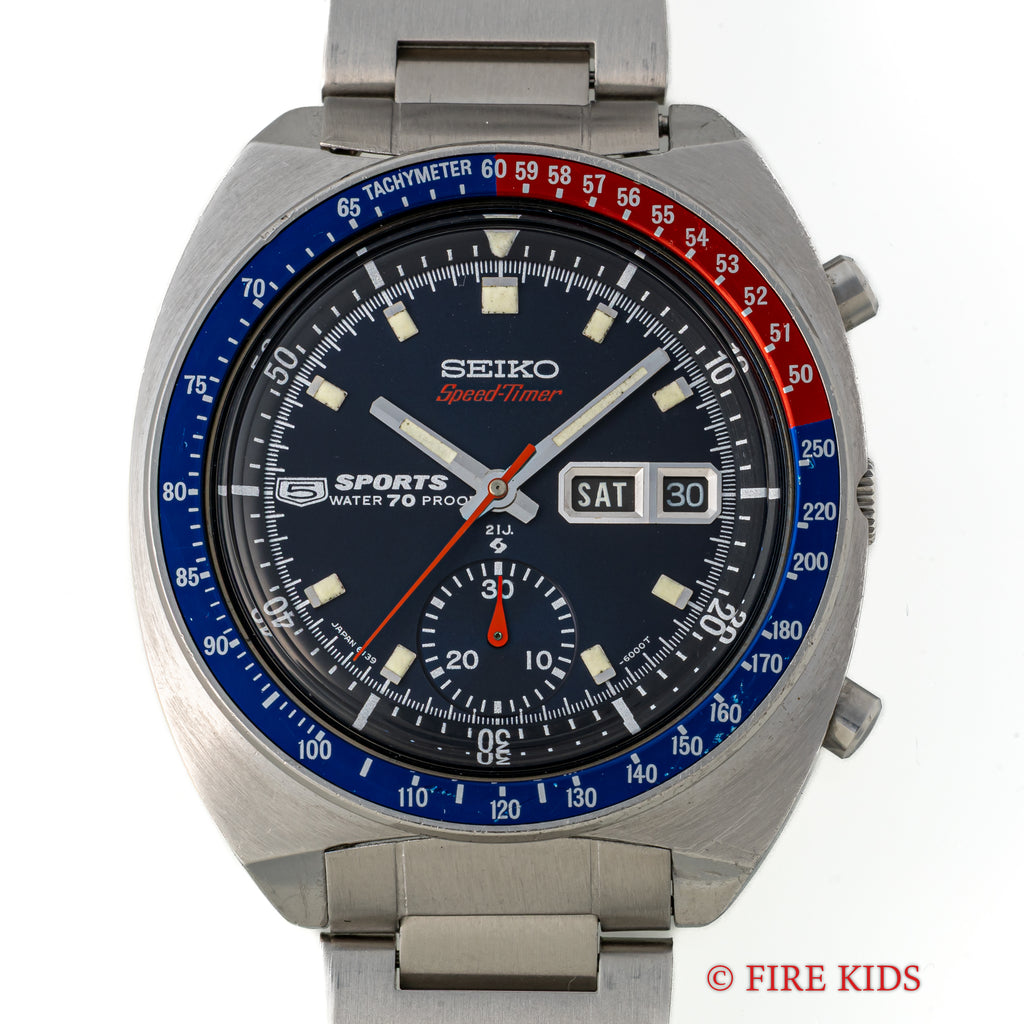 セイコー 1969年製 5スポーツ スピードタイマー Ref.6139-6000 クロノグラフ 箱、タグ、取扱説明書付きです。1969年に発売された国産初の自動巻きクロノグラフであり、NASAの宇宙飛行士ウィリアム・ポーグに愛用され宇宙空間で実際に着けたこともある時計と同じ型の時計です。手巻き機構が搭載されておらず、クロノグラフの複雑機構と自動巻きの巻き上げ効率を両立したという自信の表れが感じて取れます。セイコーロゴ入りブレスが付いています。箱、タグ、取扱説明書付きです。