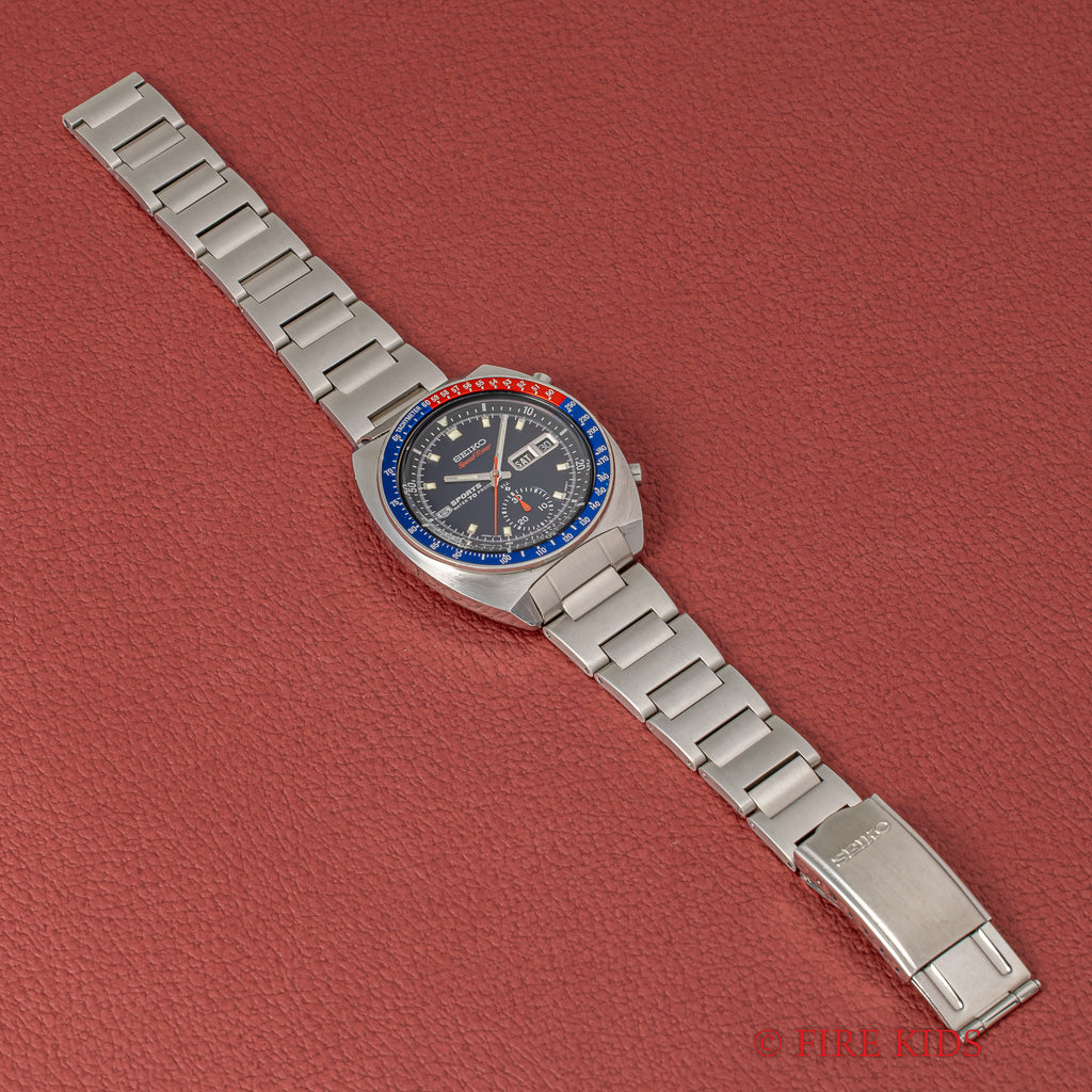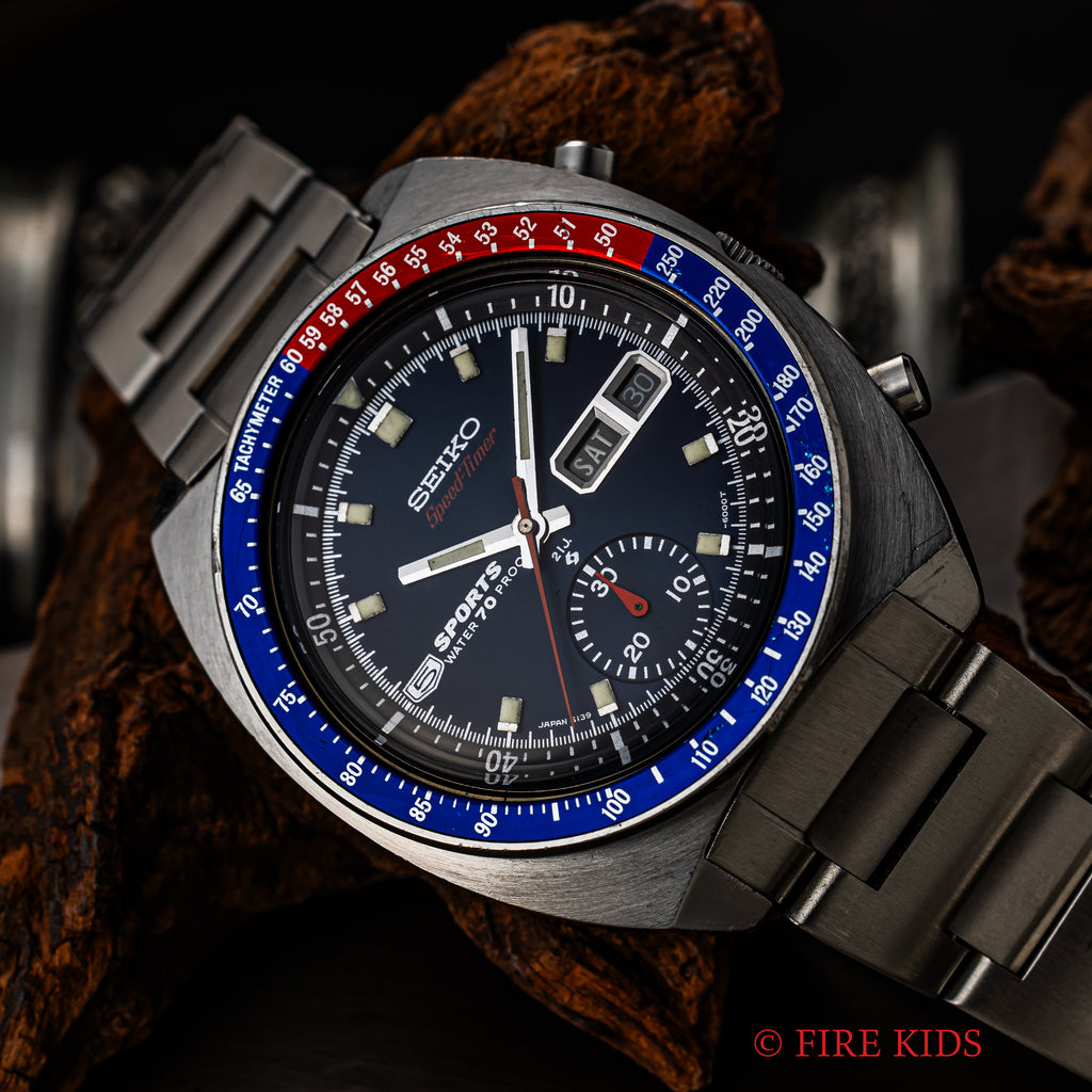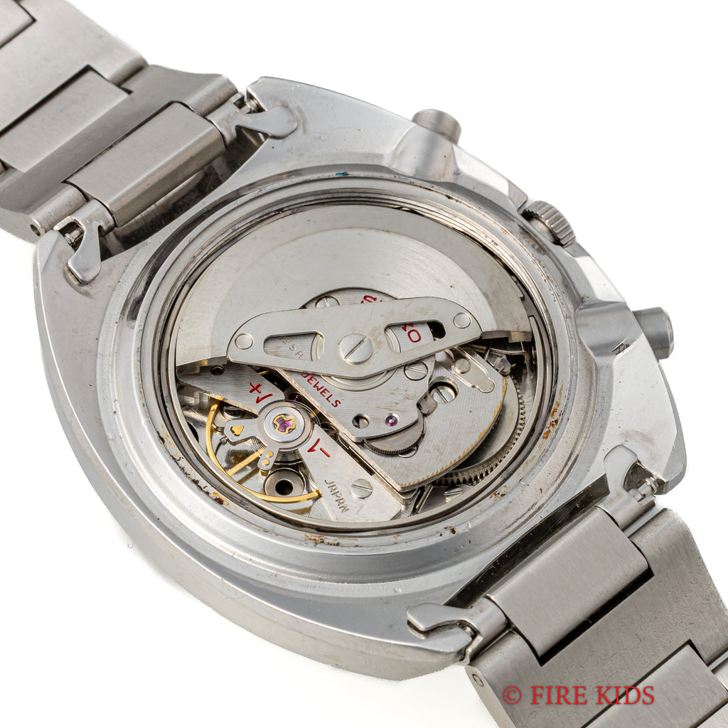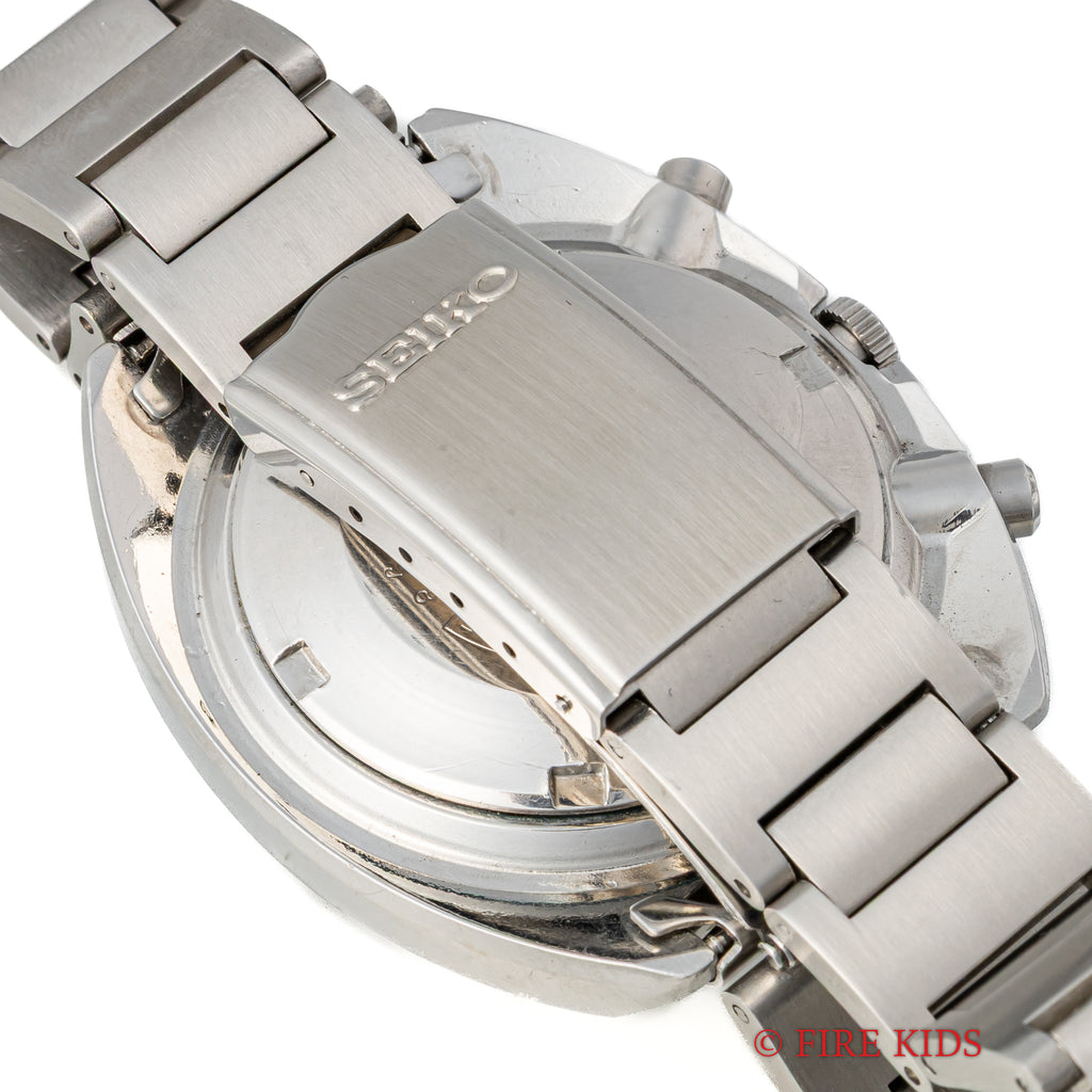 セイコー 1969年製 5スポーツ スピードタイマー Ref.6139-6000 クロノグラフ 箱、タグ、取扱説明書付きです。1969年に発売された国産初の自動巻きクロノグラフであり、NASAの宇宙飛行士ウィリアム・ポーグに愛用され宇宙空間で実際に着けたこともある時計と同じ型の時計です。手巻き機構が搭載されておらず、クロノグラフの複雑機構と自動巻きの巻き上げ効率を両立したという自信の表れが感じて取れます。セイコーロゴ入りブレスが付いています。箱、タグ、取扱説明書付きです。