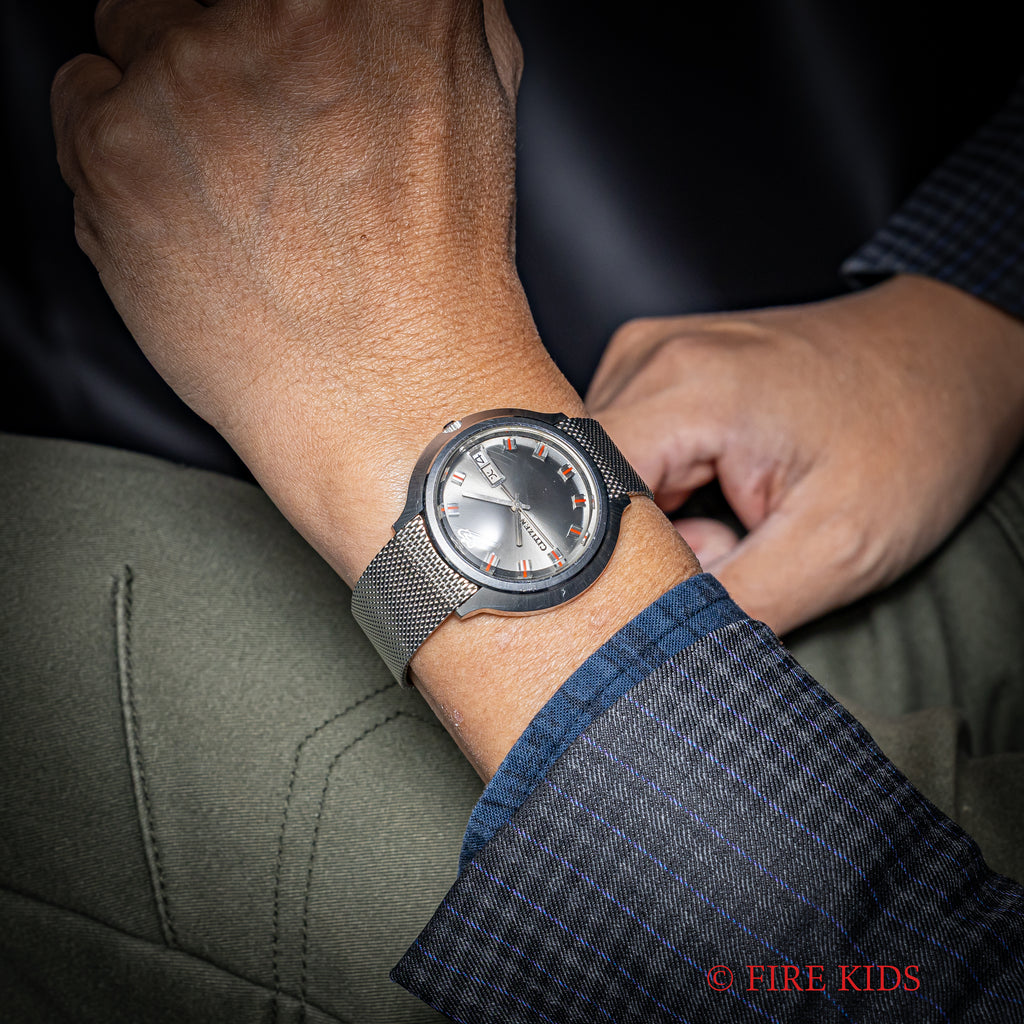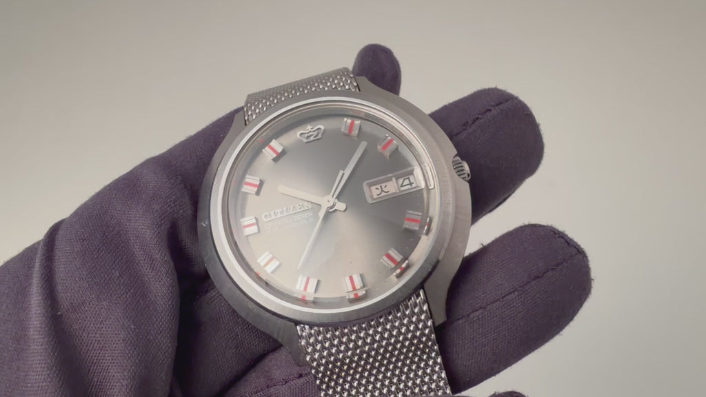 シチズン クリスタルセブン ナイアガラ 1968年製 自動巻 純正ブレス付きの入荷になります。セイコー5に対抗して作られたシチズン7シリーズはセイコーにはないガラスを採用と手巻き機能が追加されています。シルバーグレーの文字盤にオレンジのインデックス、針が印象的ですが、こちらは通称「ナイアガラ」と呼ばれ文字盤やインデックスにカラーデザインをシチズンでは初めて導入したモデル。2010年頃に復刻もされ人気となっています。ムーブメントは自動巻き30石の機械で同じクリスタルセブンでも上位機種になります。カレンダーはデイデイト表記で日付のクイックチェンジ付き、曜日はレトロな日本語表記です。使用頻度は少なめで大きなダメージはなく、当時のフォルムをキープしています。ベルトは純正のメッシュステンレスブレスが取り付けてあります。