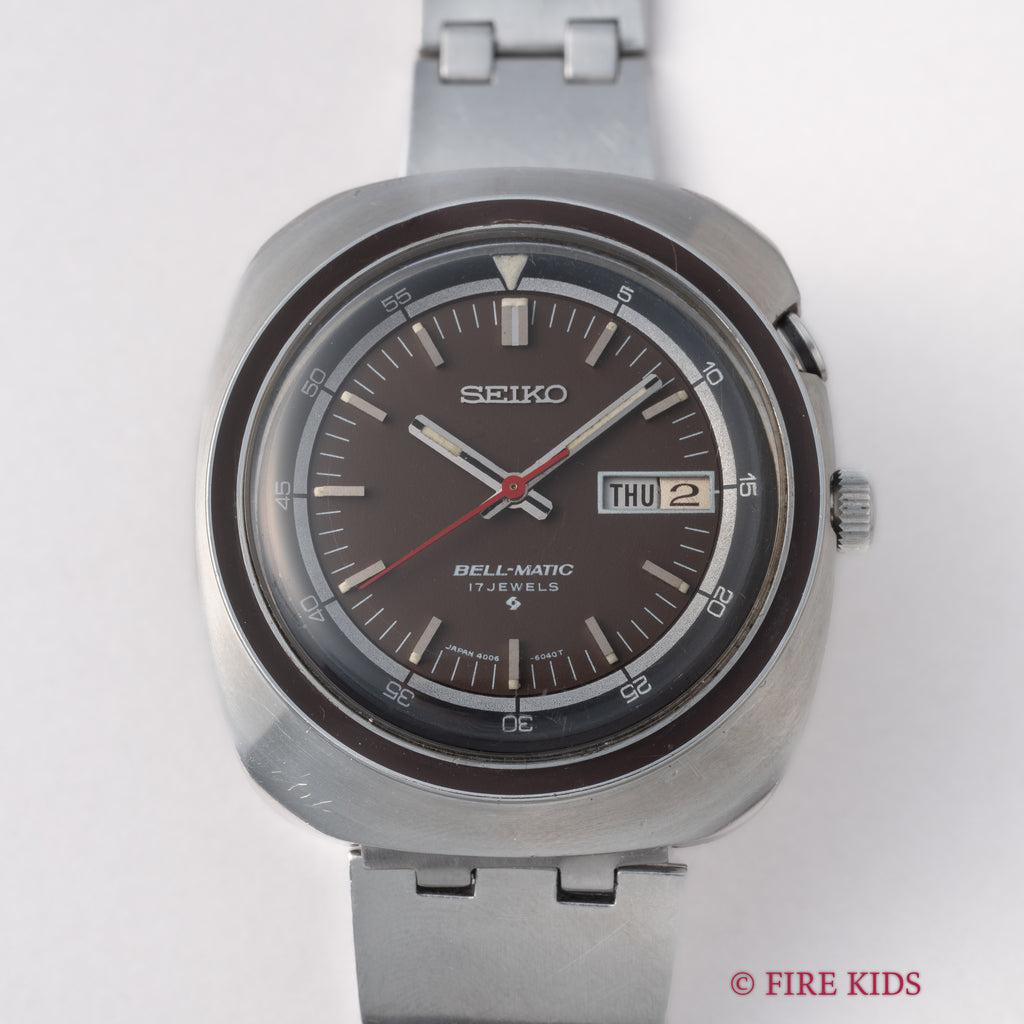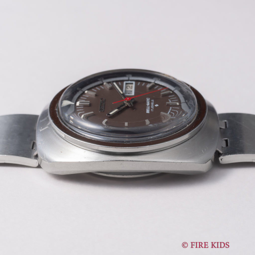 セイコー ベルマチック 1971年製 ブラウンダイヤルベゼル 自動巻 リストアラーム 純正ブレスの入荷になります。非常に珍しいブラウンの文字盤とベゼルです。1967年に発売されたセイコーのアラームウォッチ。アラームと自動巻き機構からベルマチックと名付け。スイスと一線を引こうと思っていたセイコーのプライドを感じるネーミング。2時位置のボタンでアラーム機能のオンオフを切り替える仕様。リュウズでの巻き上げはアラーム用。自動巻き機構で時計は巻き上げ。2時位置のボタンの押し込みでカレンダー早送りです。ケースは小傷が見られますが、大きなダメージはありません。純正ステンレスブレス付きです。