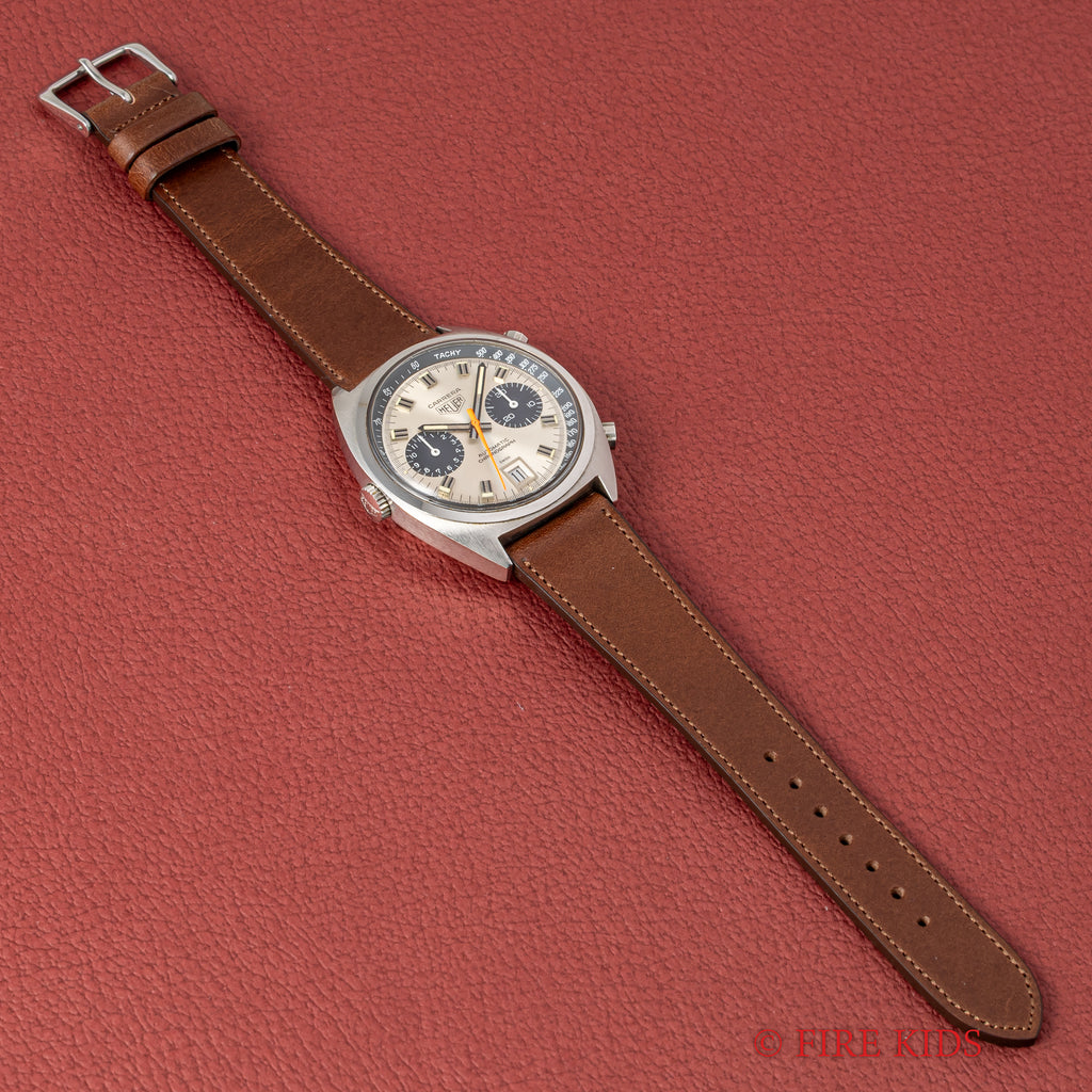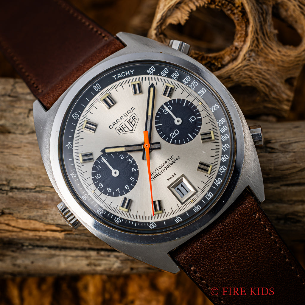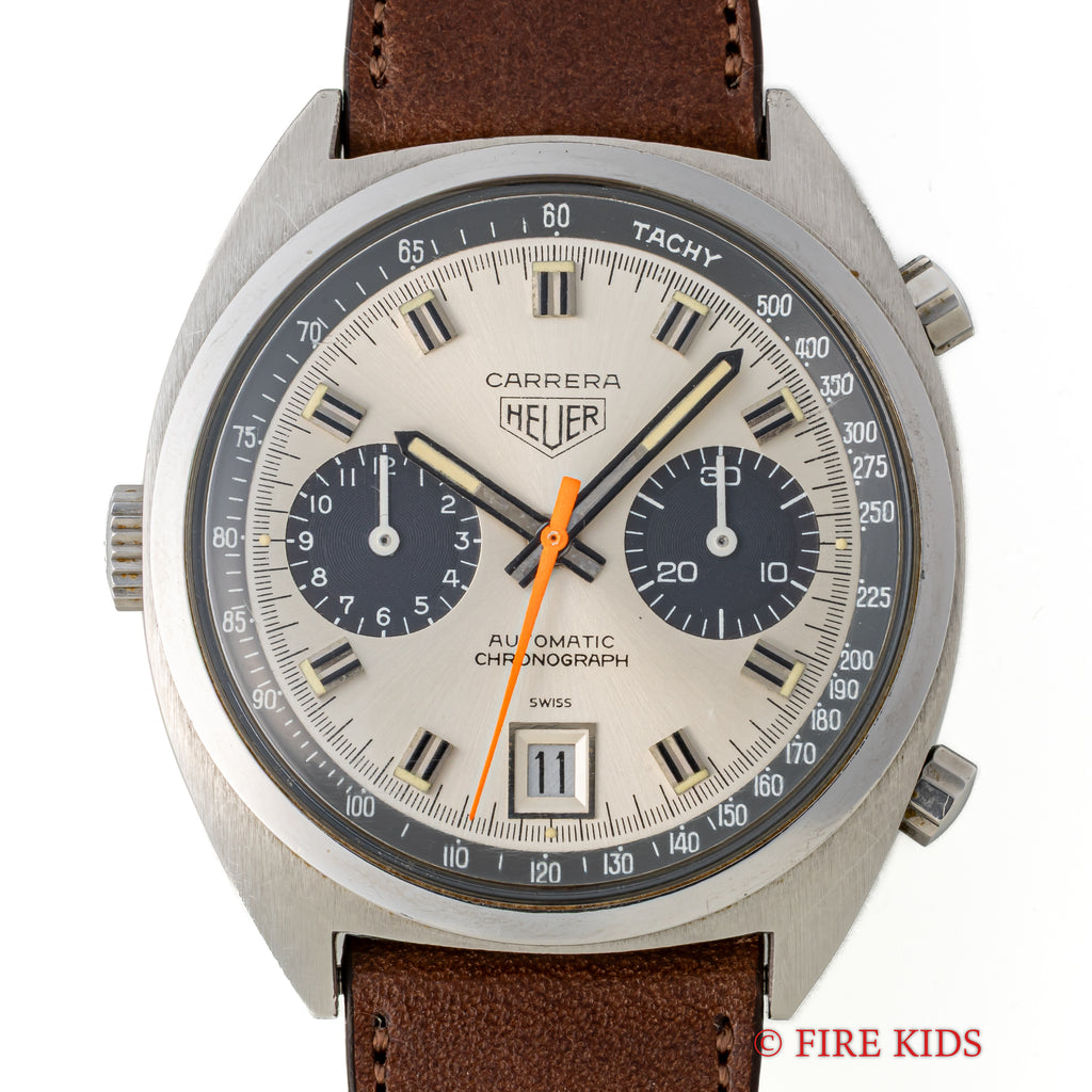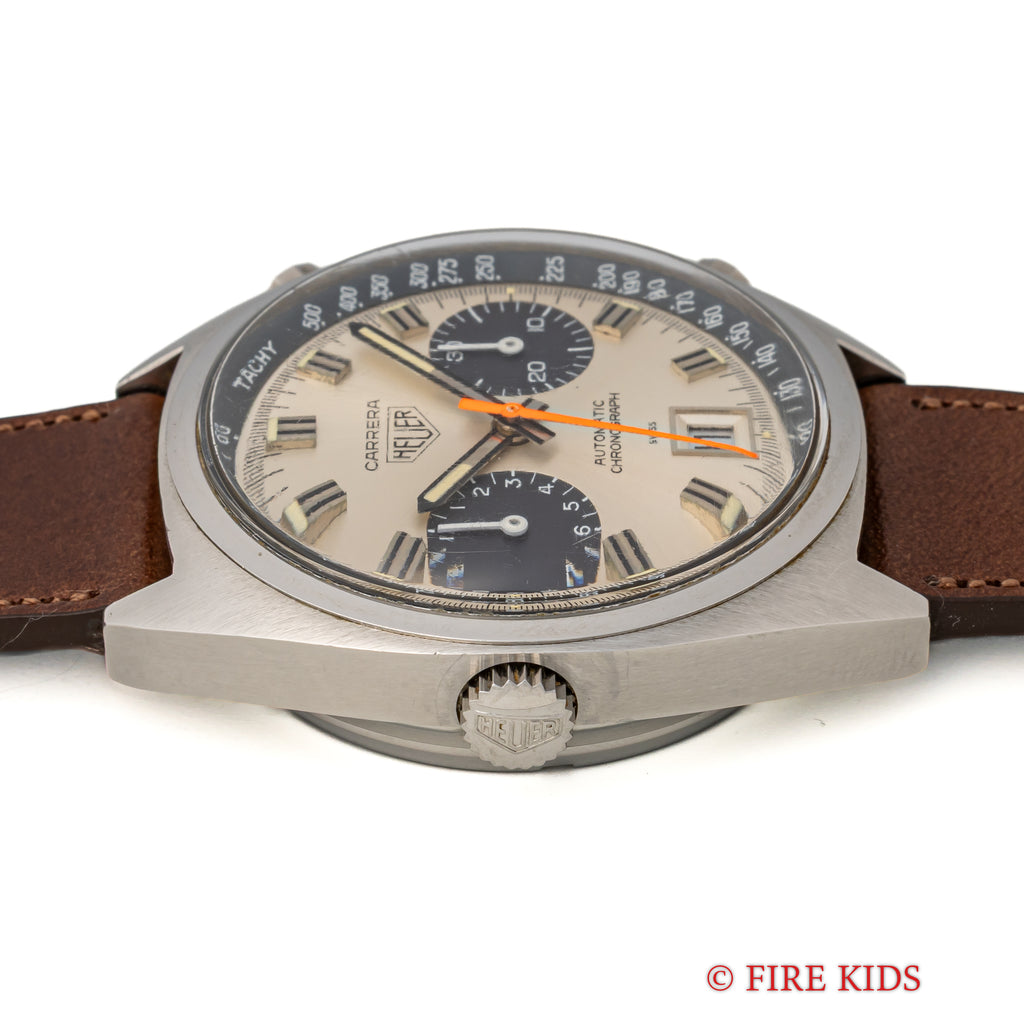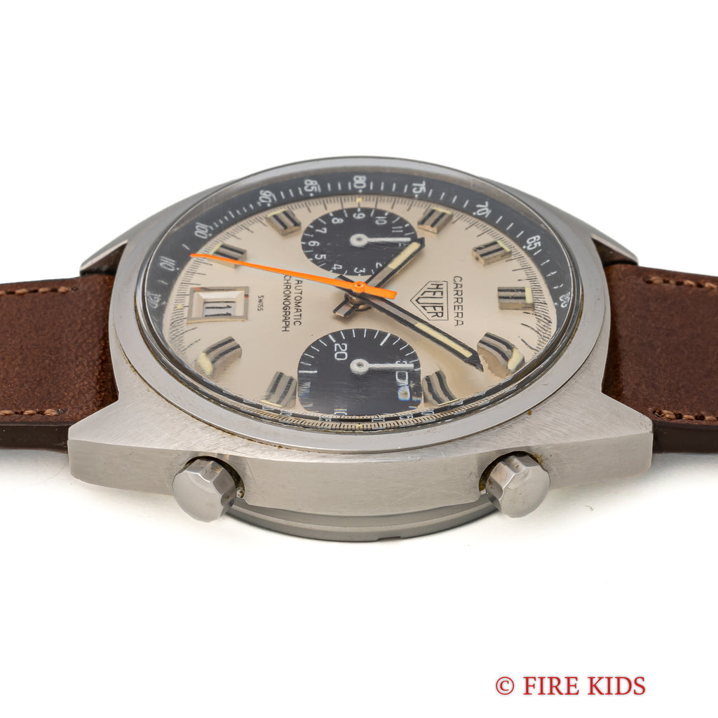 ホイヤー カレラ クロノマチック 1970年代製 自動巻クロノグラフ Cal.12 Ref.1153です。世界初の自動巻クロノグラフCal.11を改良したCal.12を搭載したホイヤーの人気モデル「カレラ」Ref.1153です。オレンジのクロノグラフ秒針が良いアクセントになっています。ケースは小傷が見られますが大きなダメージはありません。手巻きや針回しの操作はスムースです。ファイアーキッズオリジナルのブッテーロカーフレザーを合わせています。