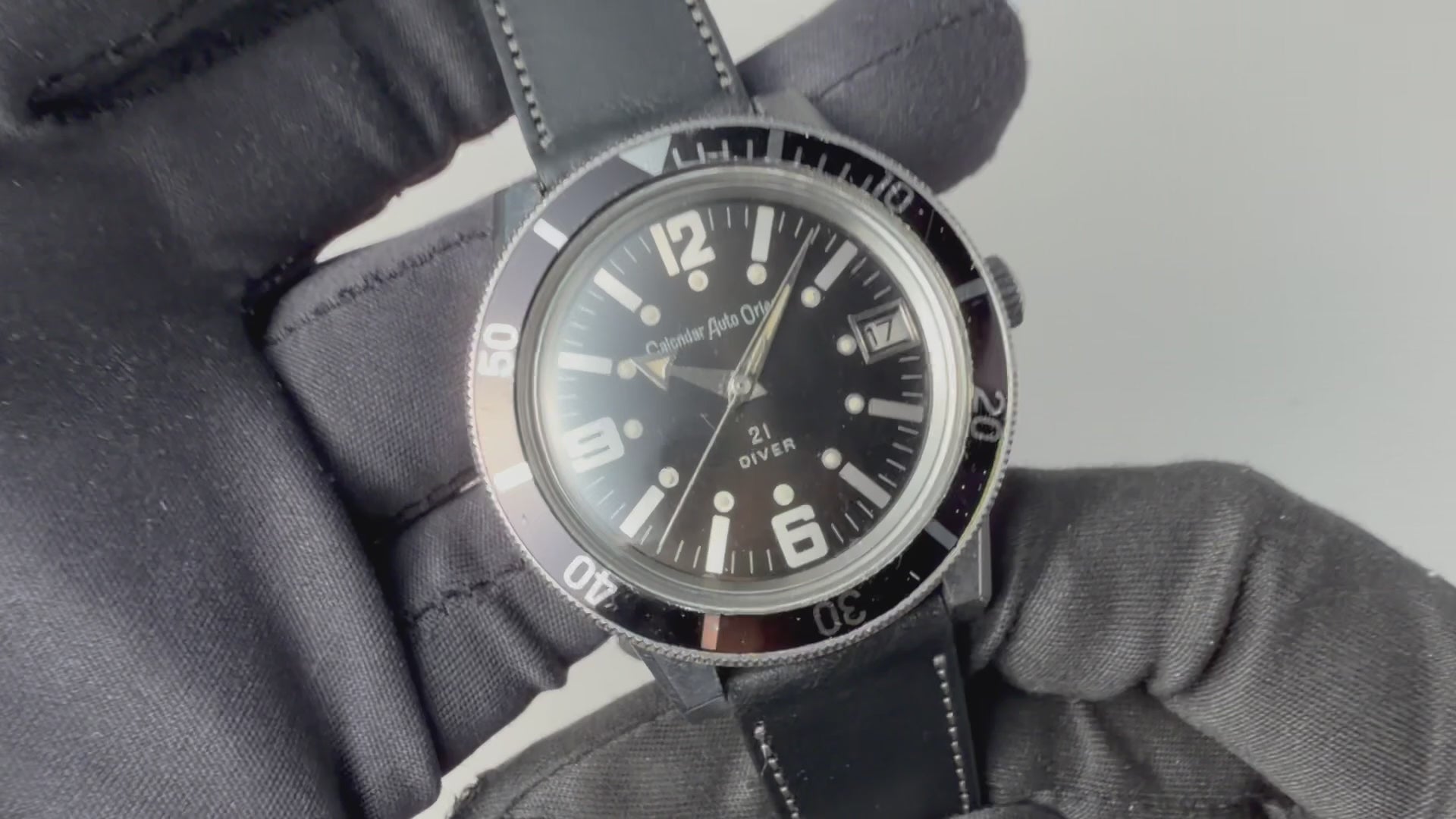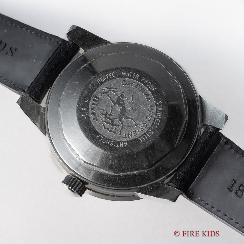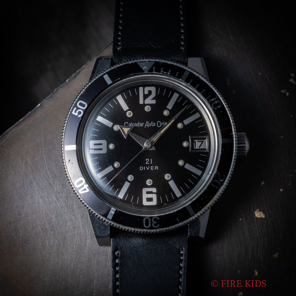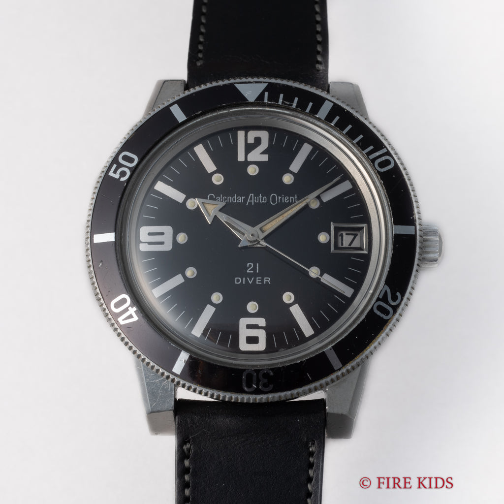オリエント カレンダー オートオリエント 1960年代製 アローハンド 21ダイバー 自動巻きです。40mm径の迫力あるケースを搭載したヴィンテージオリエントの中でも人気のモデルです。21石を積んだムーブメントの為21ダイバーと呼ばれています。艶有のブラックダイヤルにアローハンドの組み合わせでカッコいいです。状態もダイバーとしてはかなり良く、文字盤もケースも整っています。ファイアーキッズオリジナルのブッテーロカーフレザーを合わせています。