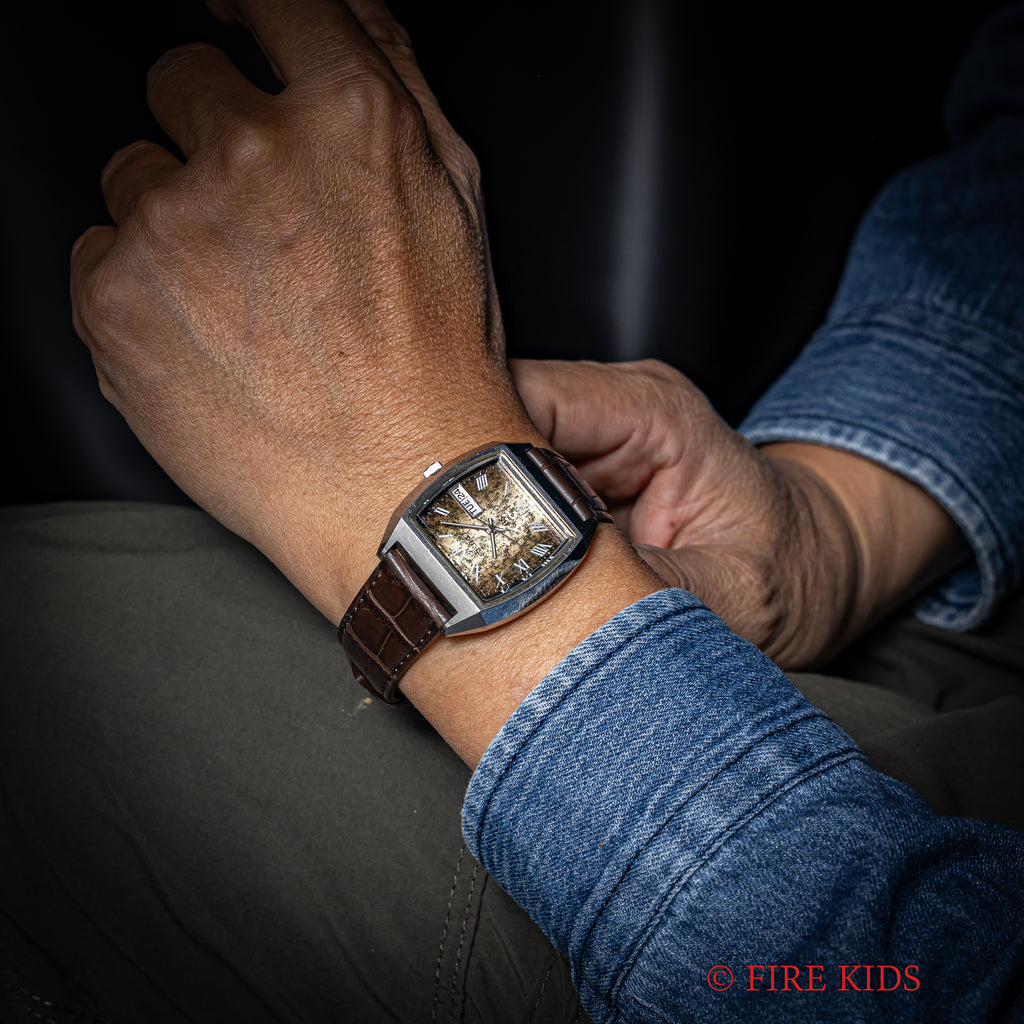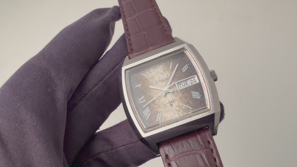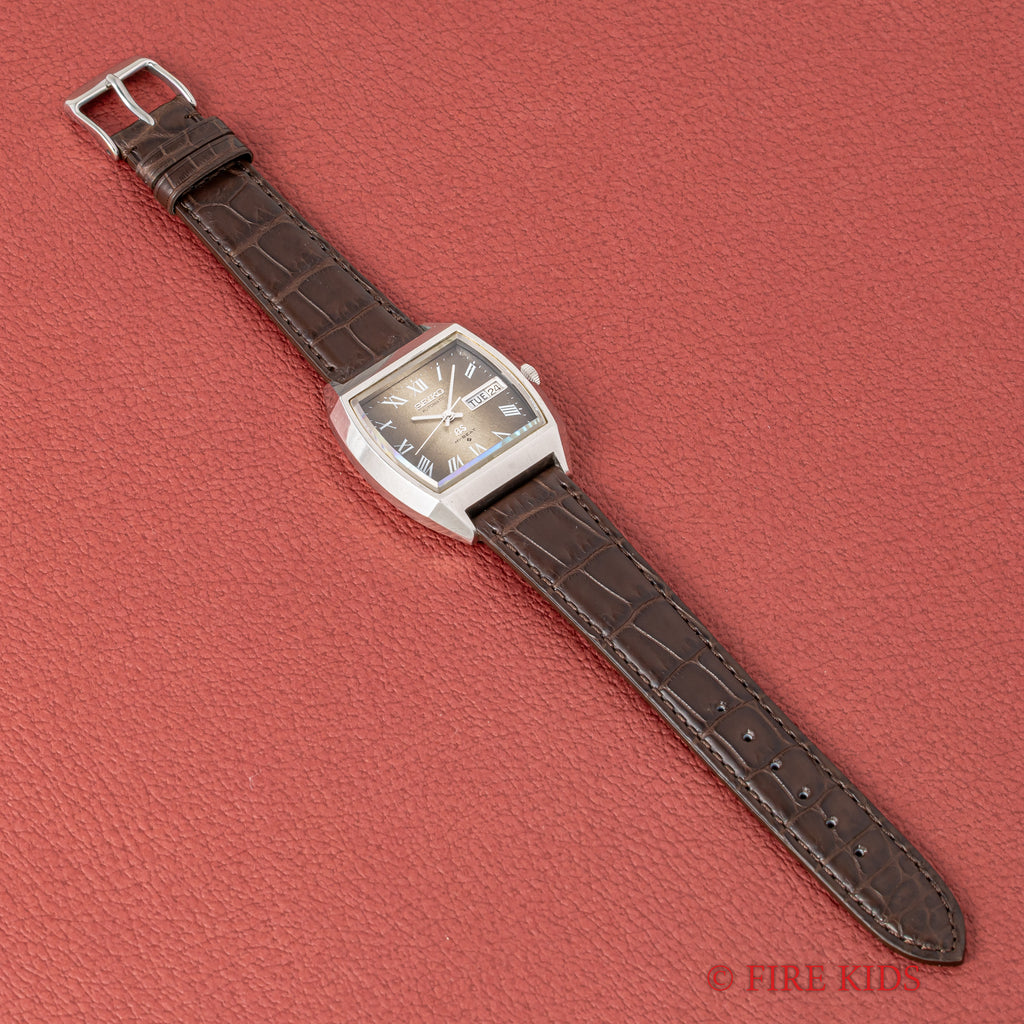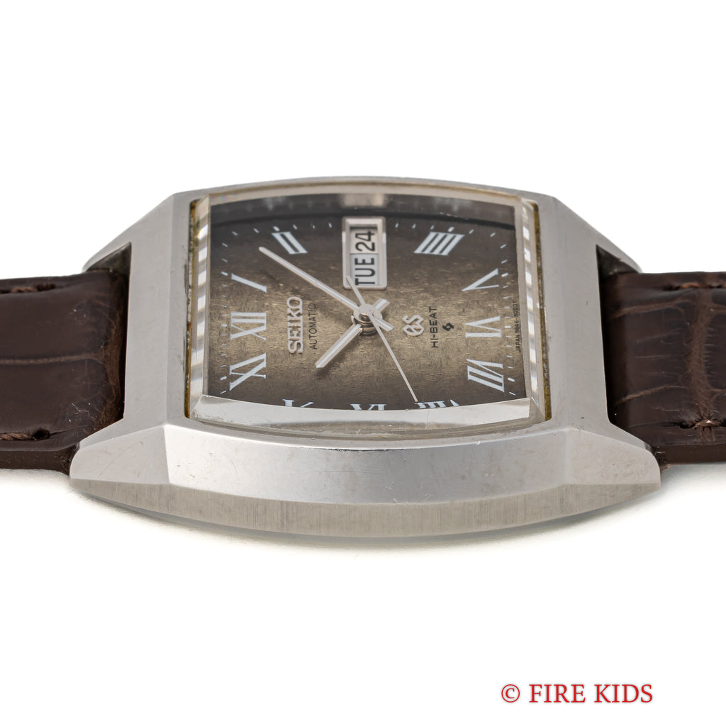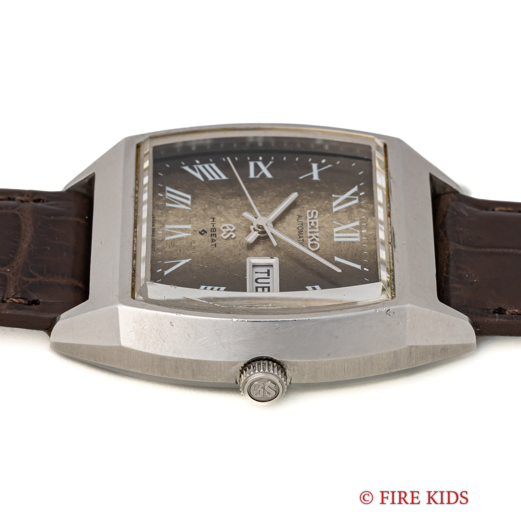 グランドセイコーのレアモデルRef.5646-5010です。トノー型ケースにローマングラデーション文字盤というGSらしくない個性的でレアな1本です。文字盤は特筆するダメージは無く、きれいな状態です。ケースはあたり傷、小傷が見られますがオリジナルのエッジが残り大きなダメージはありません。手巻きや針回し、カレンダーの操作はスムーズです。ベルトはファイアーキッズオリジナルのクロコ革ベルトが取り付けてあります。