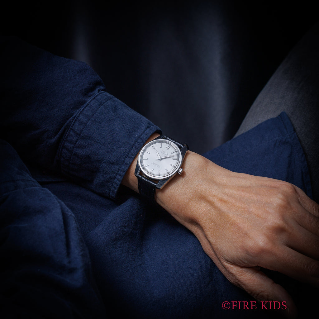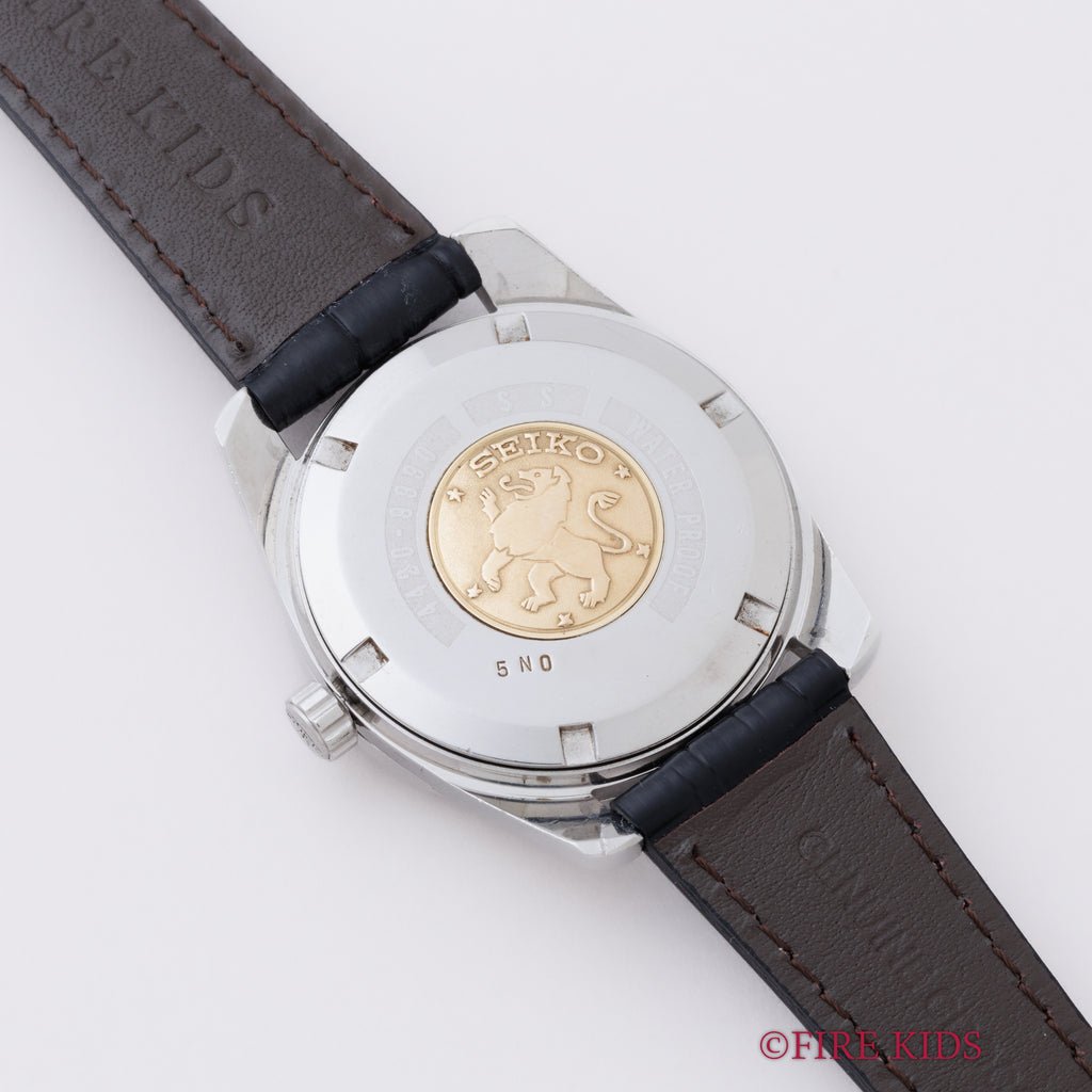 キングセイコー クロノメーター 後期 1965年製 Ref.4420-9990 獅子メダル ロービート手巻の入荷になります。44セイコーキングクロノメーターは製造期間がわずか2年間のレアモデルです。こちらは「CHRONOMETER」表記がブロック体の後期型になります。ムーブメントは手巻き27石でクロノメーター仕様のCal.4420Aが搭載されています。ケースは小傷はありますが大きなダメージはありません。裏ブタのライオンメダリオンは綺麗に残っています。ベルトはファイアーキッズオリジナルのクロコダイル革ベルトが取り付けられています。