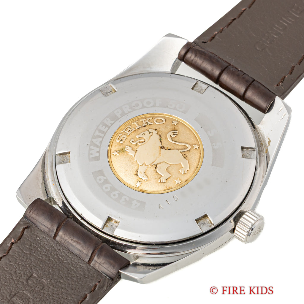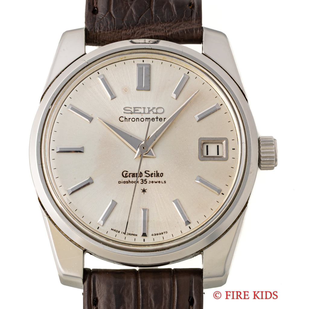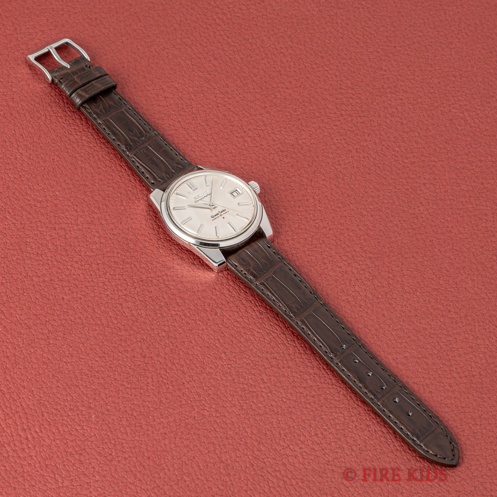 グランドセイコー セルフデーター 1964年製 Ref.43999 GS2nd 初期 ライオンメダル ロービート手巻です。グランドセイコーの第2世代セルフデーター前期型になります。ステンレスケースにスクリューバック、日付早送り機能の搭載など実用性がアップしたモデルです。文字盤はほんのりヤケが入っています。裏蓋は磨きが入っているものの、ライオンメダルは状態が良いです。ムーブメントは手巻き35石のCal.430を搭載。ベルトはファイアーキッズオリジナルのクロコダイル革ベルトが取り付けられています。