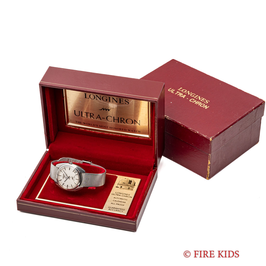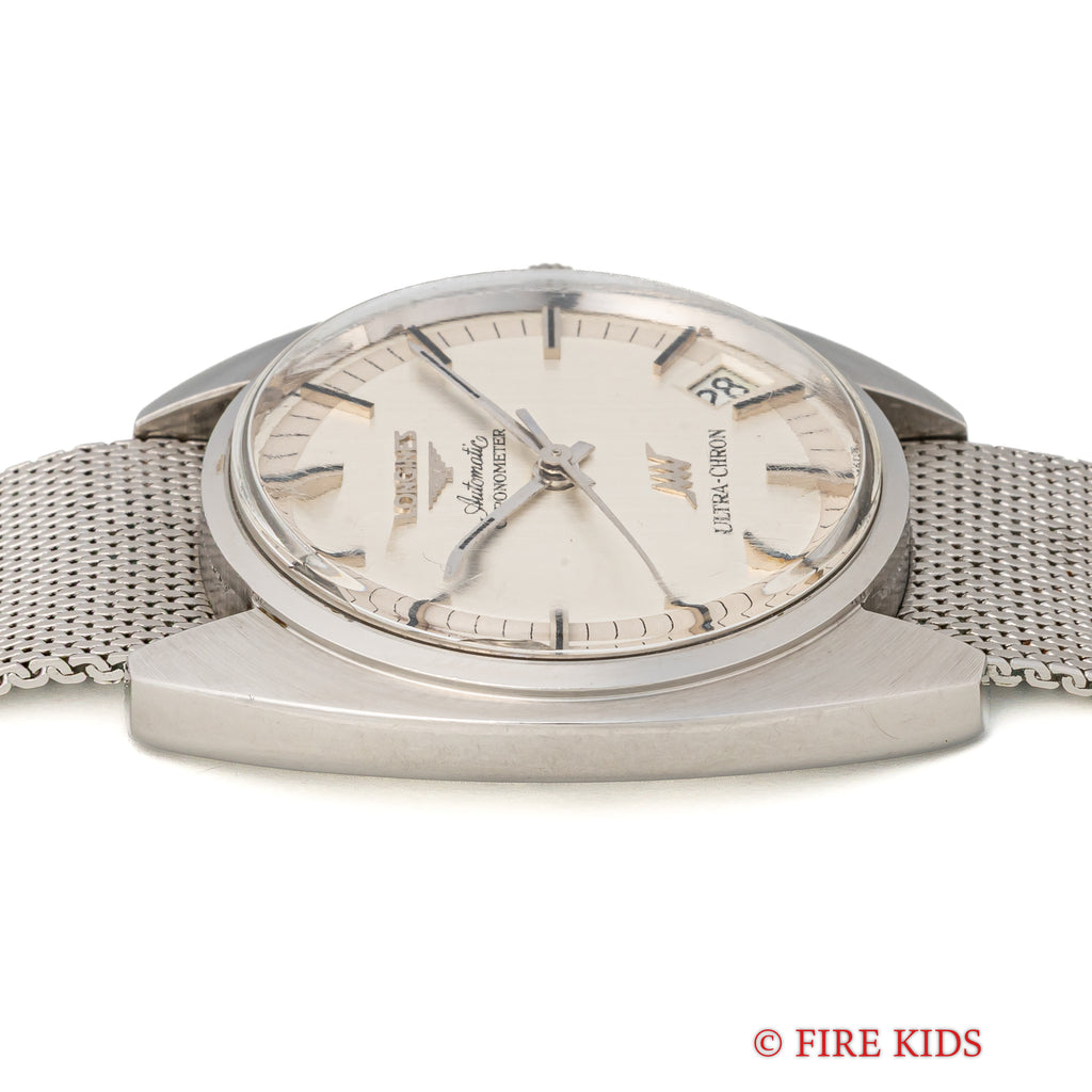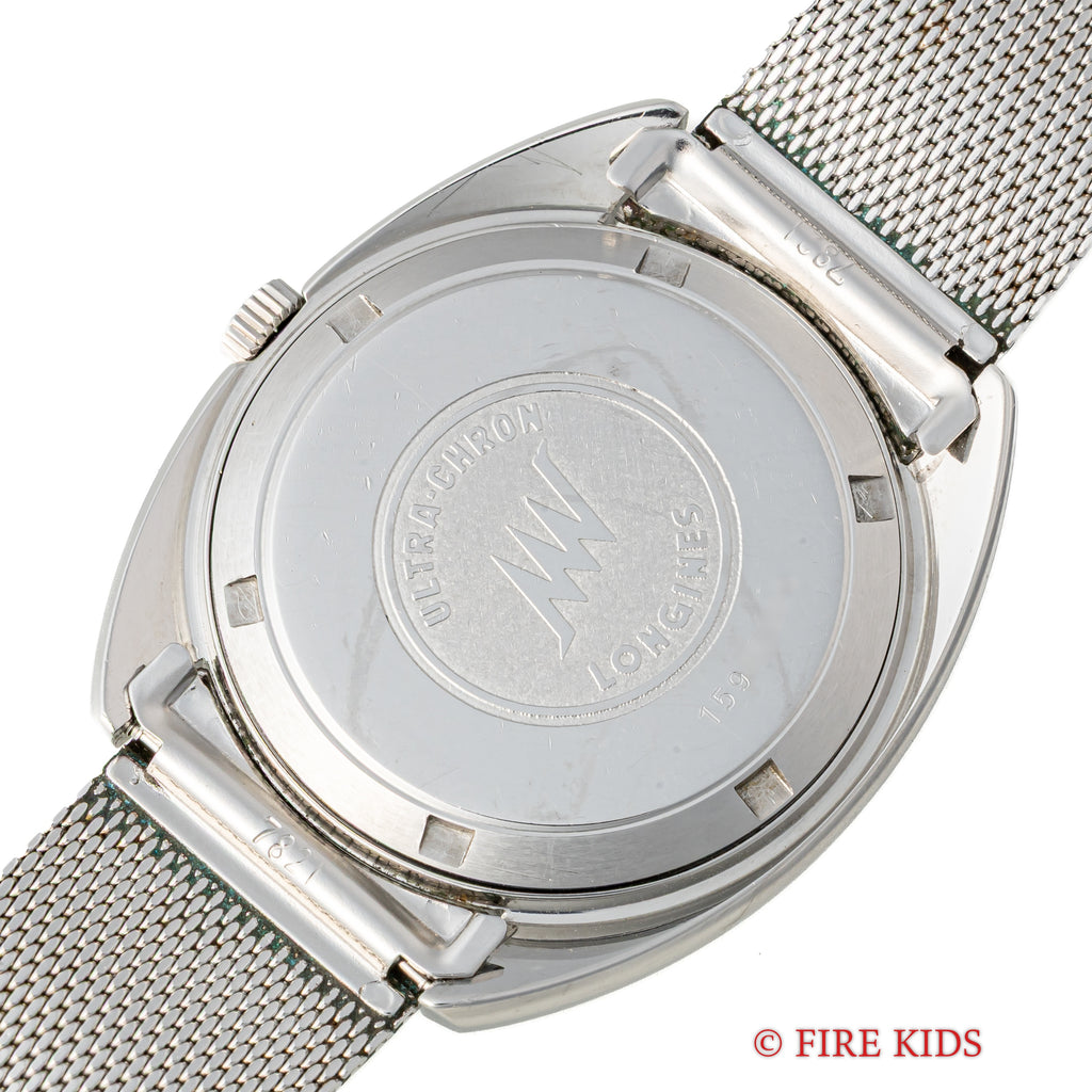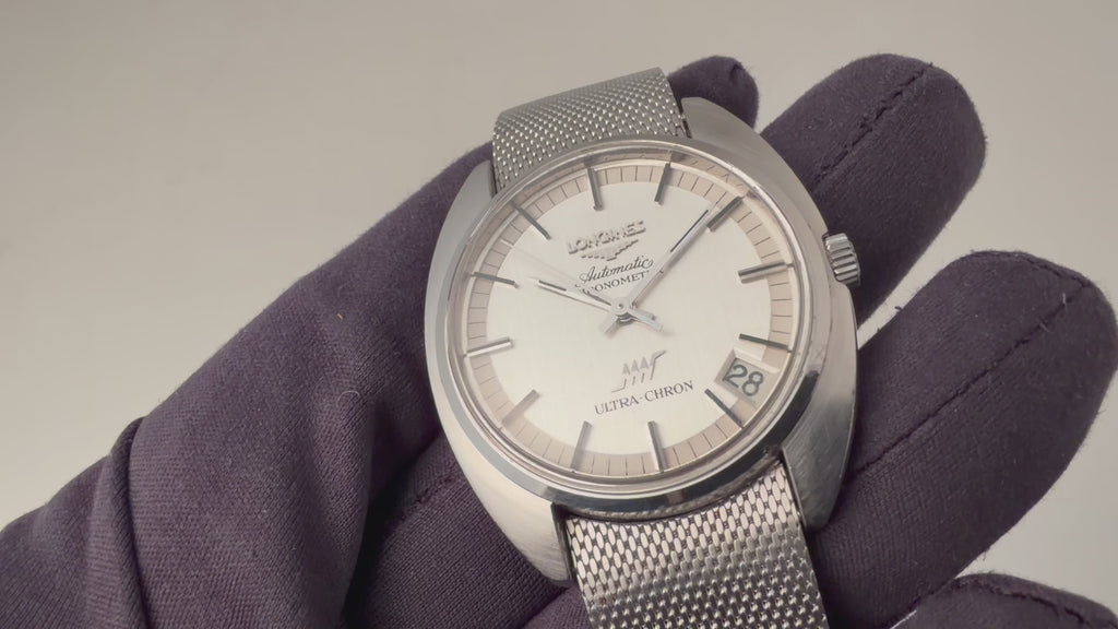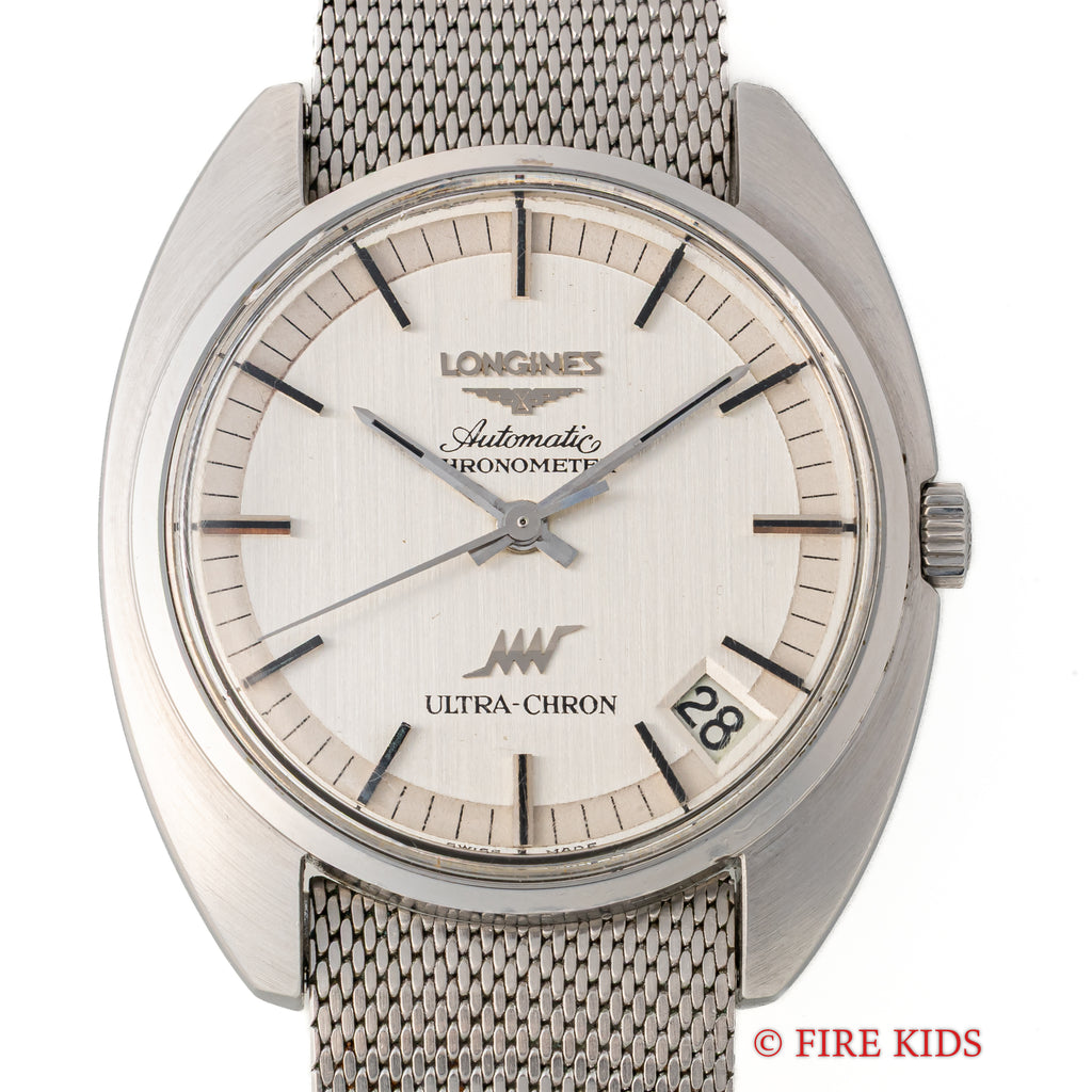 ロンジン ウルトラクロン クロノメーター 1969年製 10振動自動巻 Cal.431 Ref.8355 純正ブレス 箱付の入荷になります。10振動のハイビート自動巻ムーブメントを搭載したウルトラクロンで非常に珍しいクロノメーターです。キャリバーはノンクロノメーター同様のCal.431ですが、ローターにCHRONOMETERの刻印があります。文字盤はシミ等無く綺麗です。ケースは小傷が見られますが大きなダメージはありません。手巻きや針回しの操作はスムースです。ベルトは純正のステンレスメッシュブレスが取り付けられています。箱付きになります。