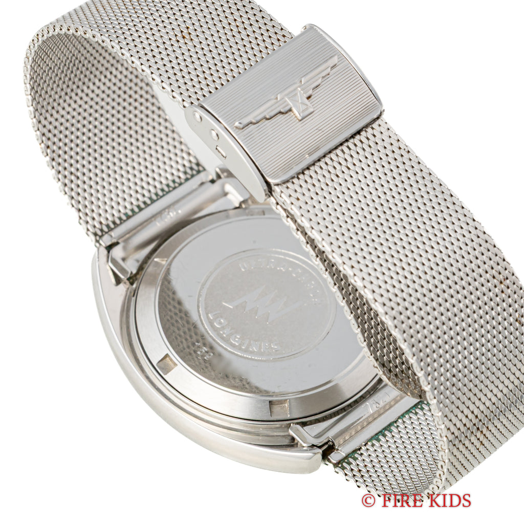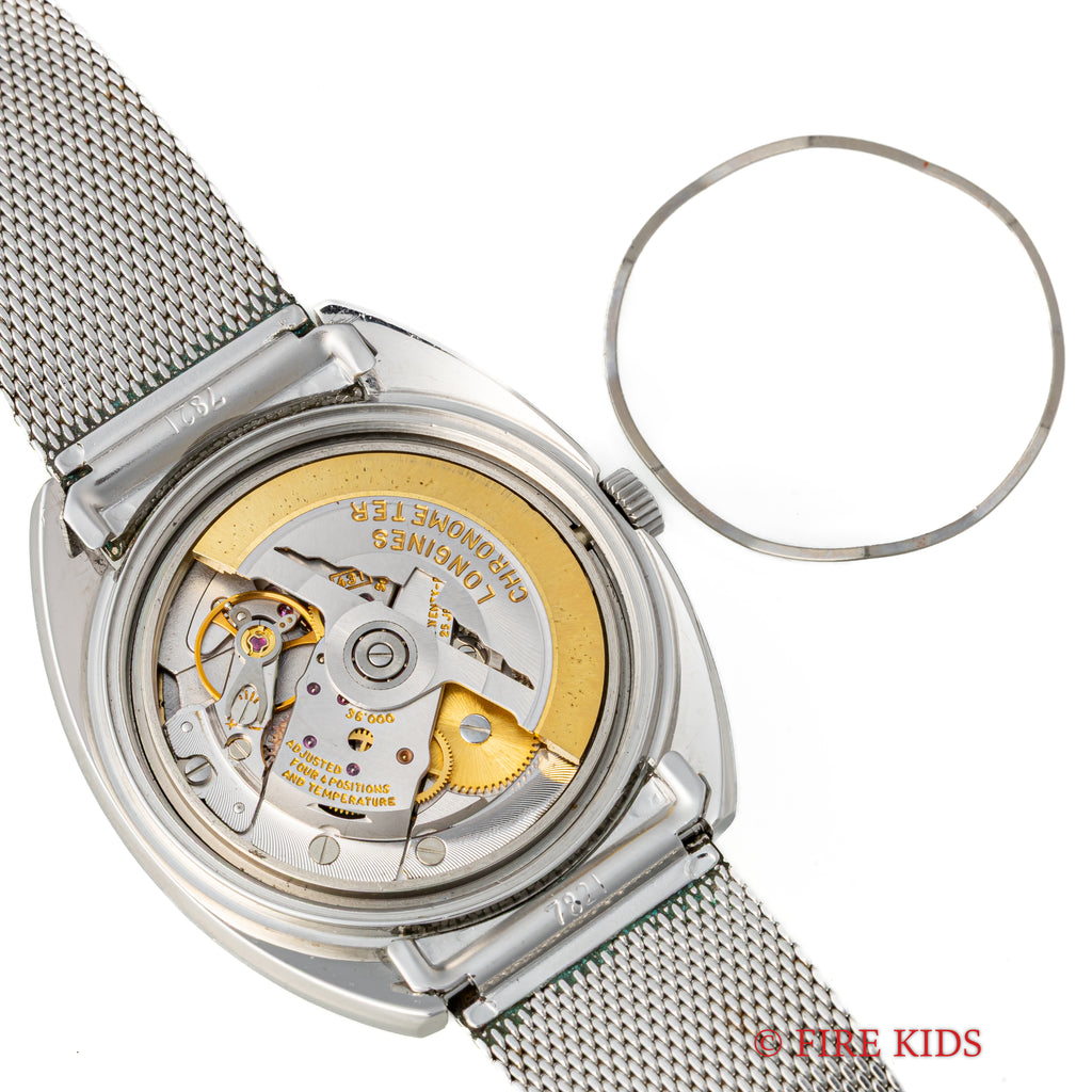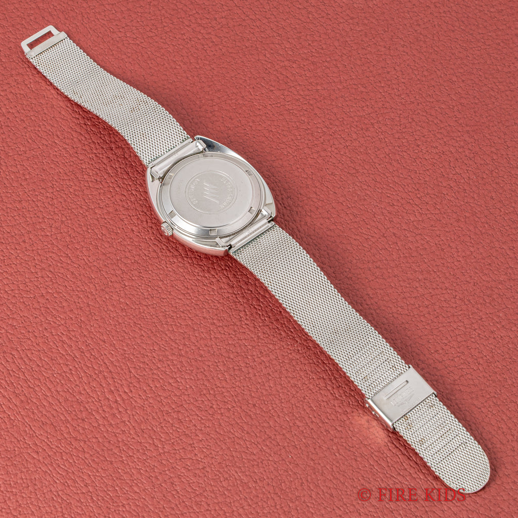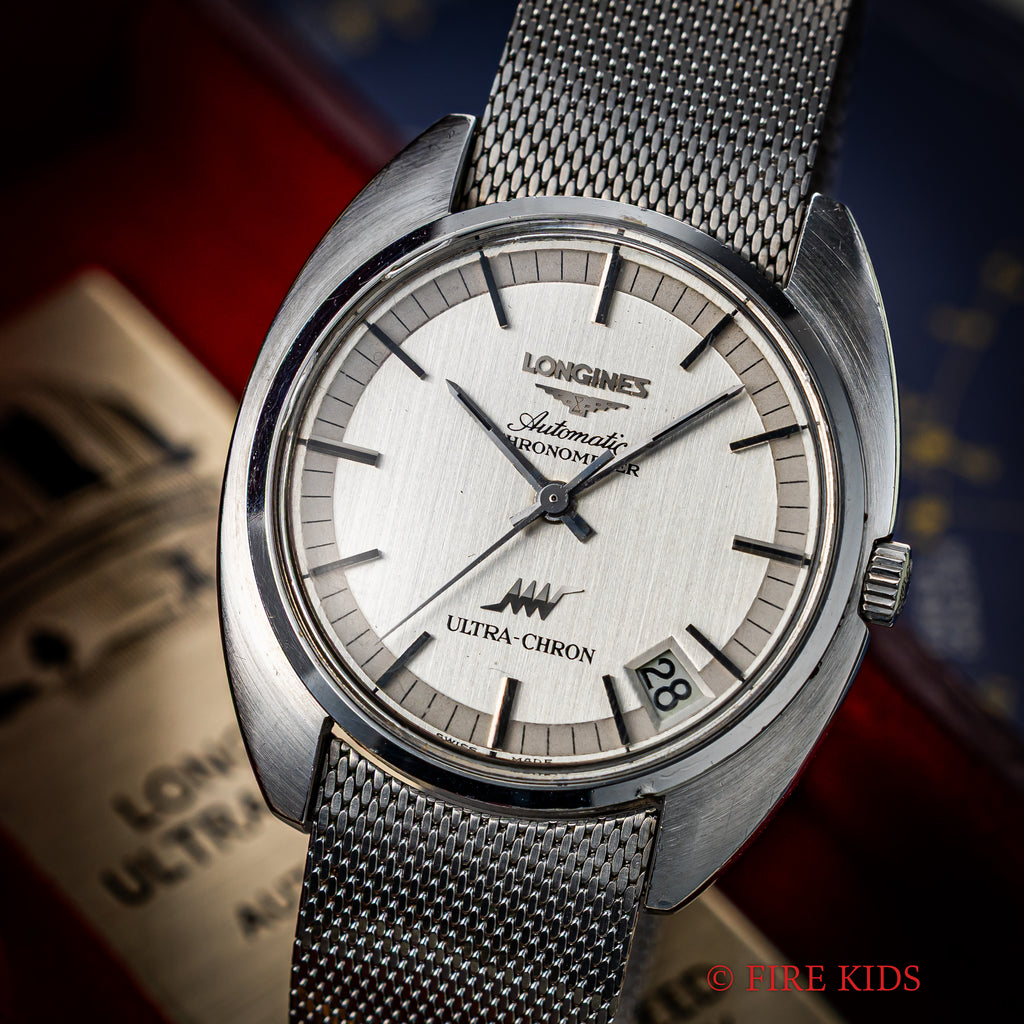 ロンジン ウルトラクロン クロノメーター 1969年製 10振動自動巻 Cal.431 Ref.8355 純正ブレス 箱付の入荷になります。10振動のハイビート自動巻ムーブメントを搭載したウルトラクロンで非常に珍しいクロノメーターです。キャリバーはノンクロノメーター同様のCal.431ですが、ローターにCHRONOMETERの刻印があります。文字盤はシミ等無く綺麗です。ケースは小傷が見られますが大きなダメージはありません。手巻きや針回しの操作はスムースです。ベルトは純正のステンレスメッシュブレスが取り付けられています。箱付きになります。