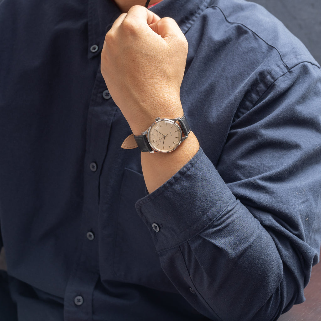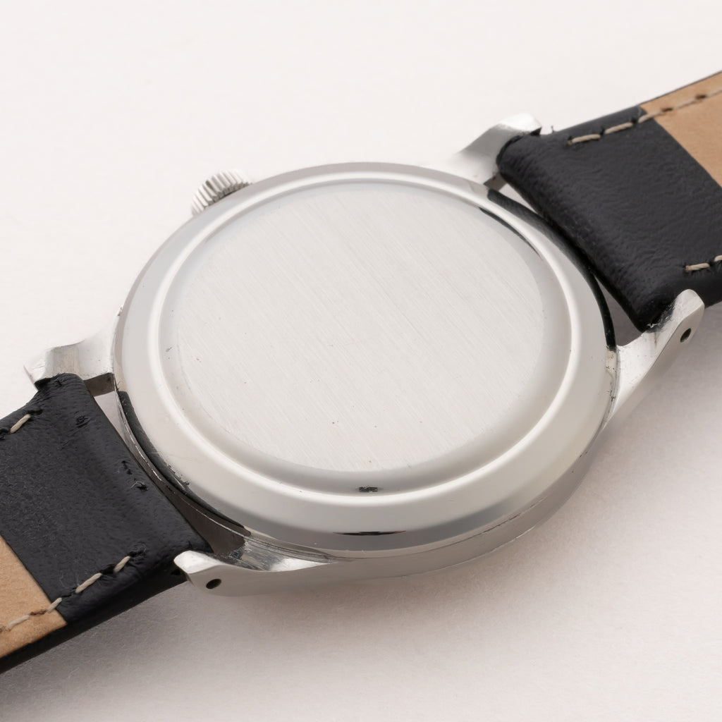1965年製のインターナショナル筆記体ロゴです。奇をてらわないシンプルなデザインはインターナショナルの代名詞でもあり、真摯な時計作りはビギナーからマニアまで幅広い人気があります。シルバーの文字盤も程よい焼け具合で雰囲気も良いです。ムーブメントは自動巻きのCal.853を搭載。ケースは小傷はございますが大きなダメージはございません。手巻きや針回しの操作はスムースです。