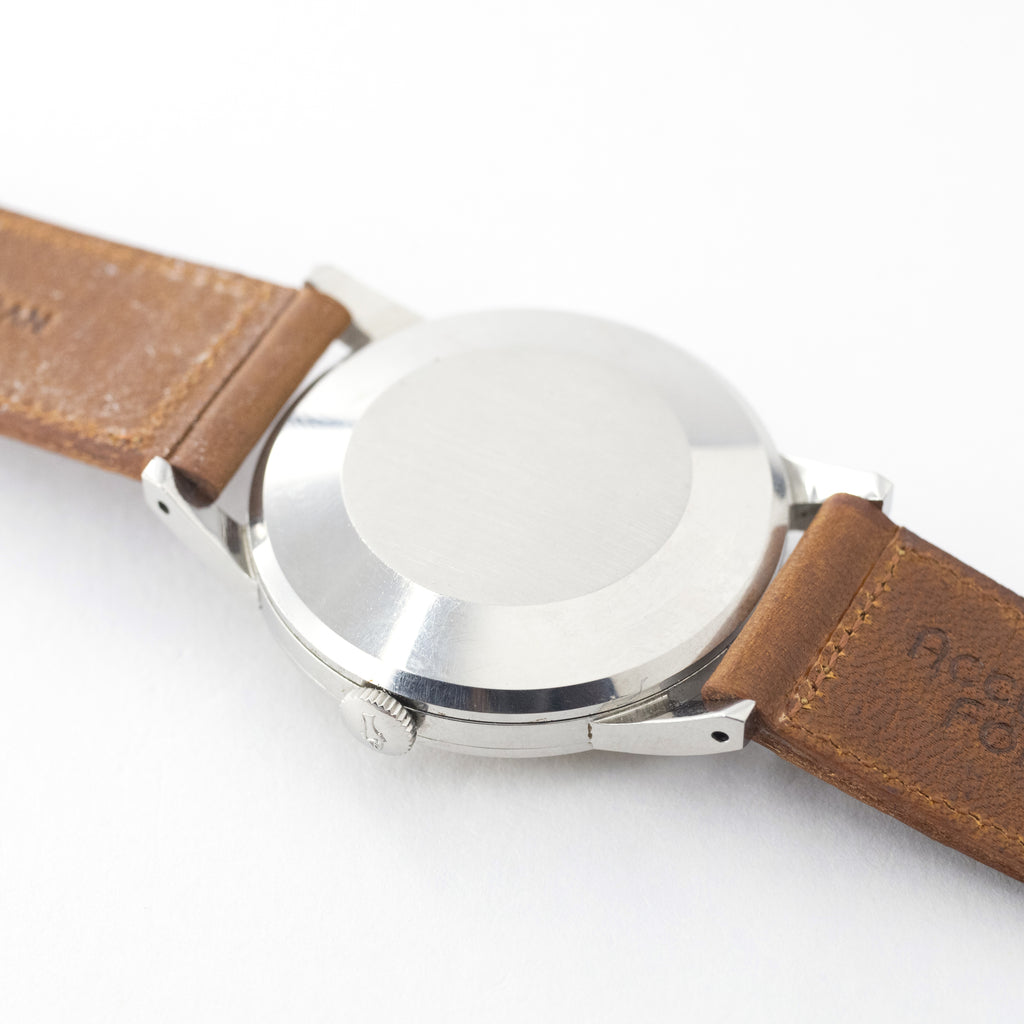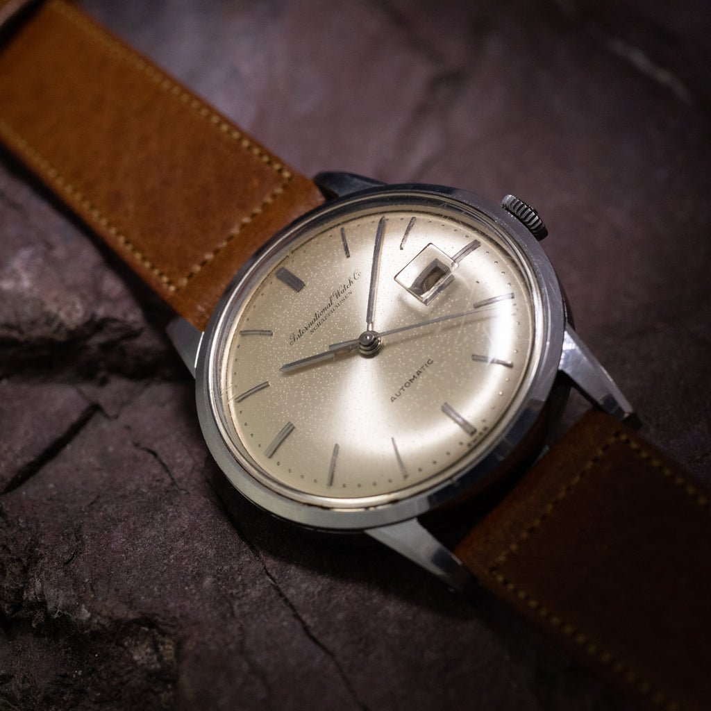 1962年製のIWCオートマチックモデルです。通称「寄り目」と呼ばれるカレンダーがやや中央に寄っているモデルでムーブメントは自社キャリバーのペラトン式自動巻きのCal.8531を搭載しています。リューズは旧タイプのお魚リューズです。文字盤にはポツポツとしたシミが確認できます。手巻きや針回しの操作はスムースです。ヴィンテージモデルに相性抜群な「Accurate Form(アキュレイトフォルム)」のレザーベルトを装着しています。こちらはオーバーホール済みです。