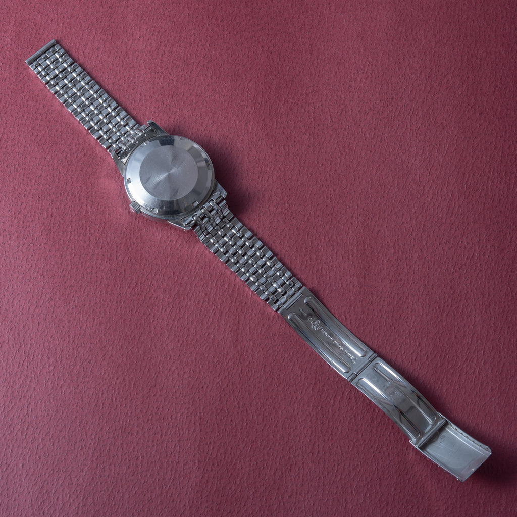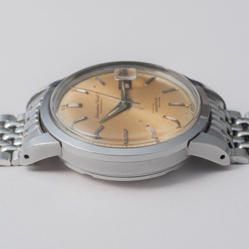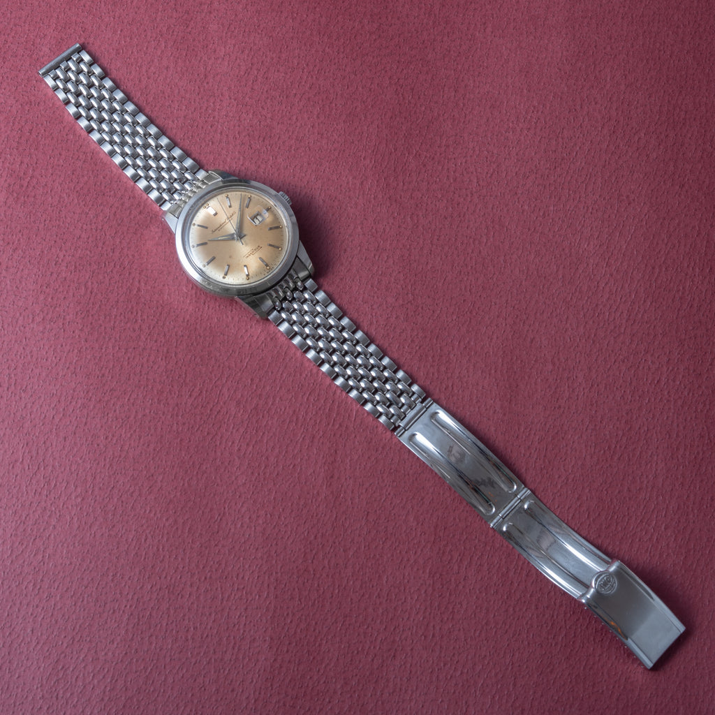 1963年製、IWCのインヂュニアRef.666AD純正ステンレスブレス付きです。ムーブメントを軟鉄製耐磁ケースで覆うことで耐磁性能を高めているモデルです。純正の風防が付いたダイヤルは全体的に強めの経年変化で飴色っぽくなっております。二重ケースになっていますので重量感、厚みがしっかりして腕に装着した時の存在感が違います。キャリバーはペラトン式自動巻きCal.8531で寄り目の日付が特徴です。ケースは小傷があるものの大きなダメージはなく、良いコンディションを保っております。ゲイフレアー社の純正ステンレスブレスが付いております。