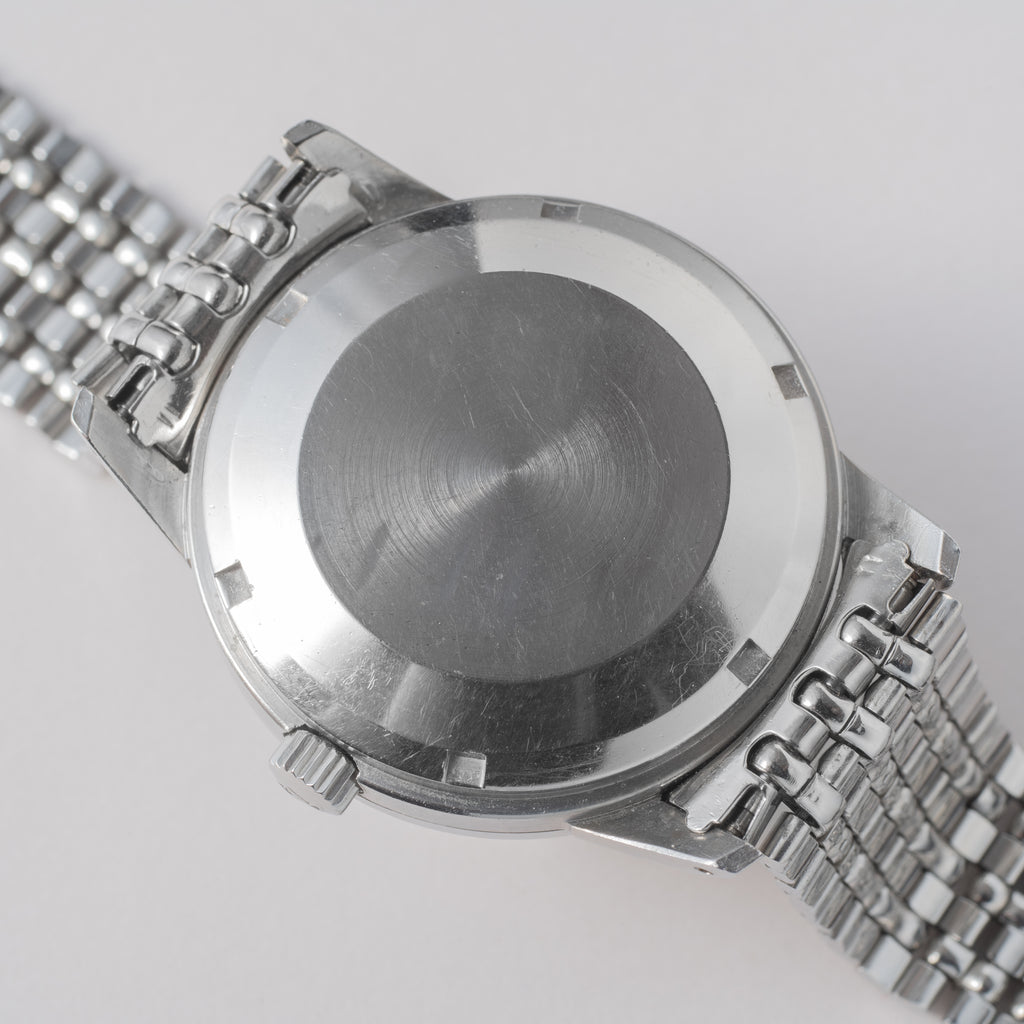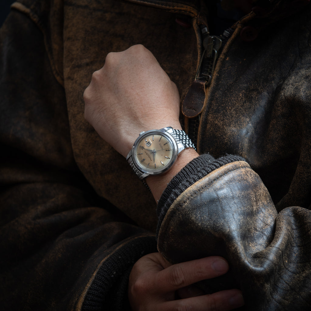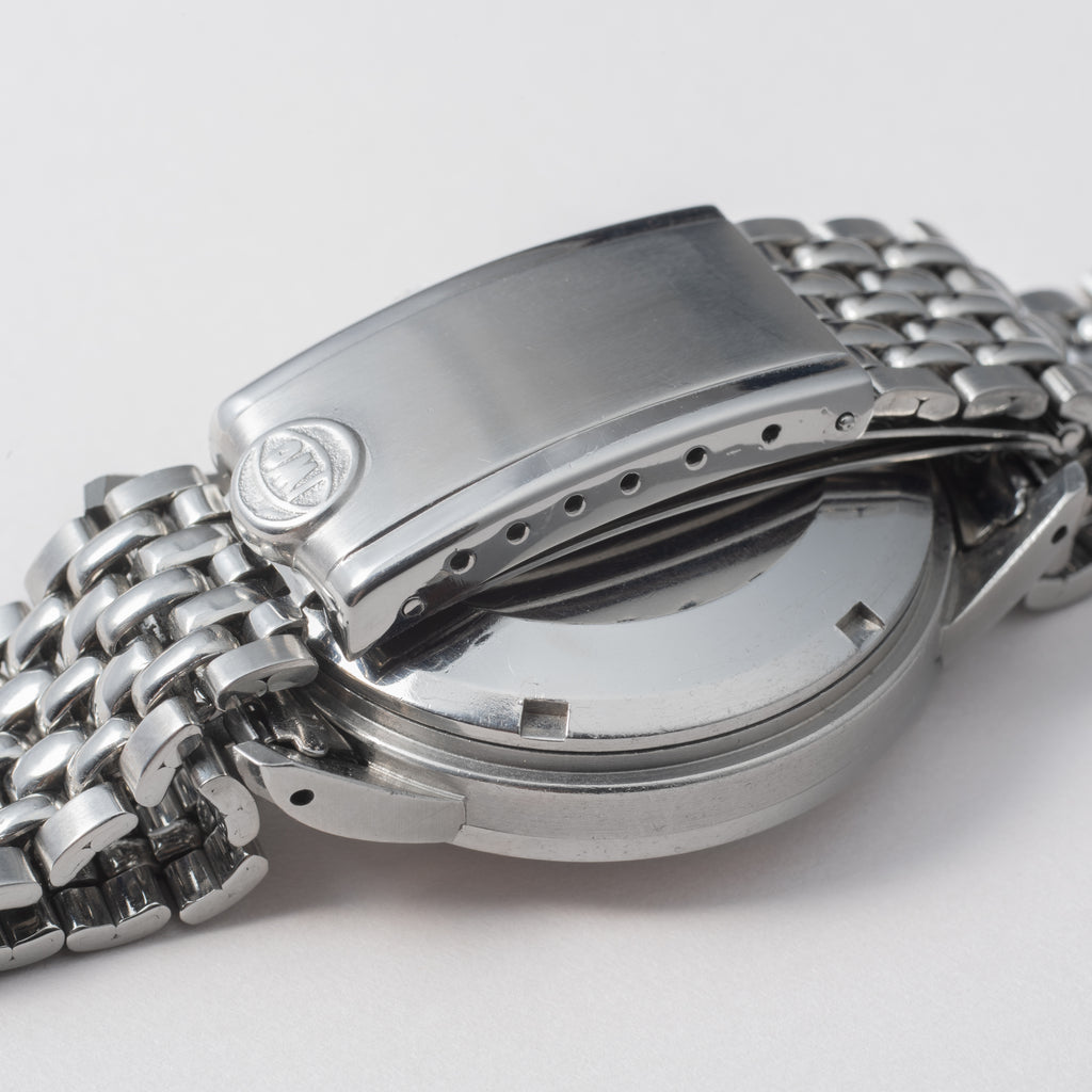 1963年製、IWCのインヂュニアRef.666AD純正ステンレスブレス付きです。ムーブメントを軟鉄製耐磁ケースで覆うことで耐磁性能を高めているモデルです。純正の風防が付いたダイヤルは全体的に強めの経年変化で飴色っぽくなっております。二重ケースになっていますので重量感、厚みがしっかりして腕に装着した時の存在感が違います。キャリバーはペラトン式自動巻きCal.8531で寄り目の日付が特徴です。ケースは小傷があるものの大きなダメージはなく、良いコンディションを保っております。ゲイフレアー社の純正ステンレスブレスが付いております。