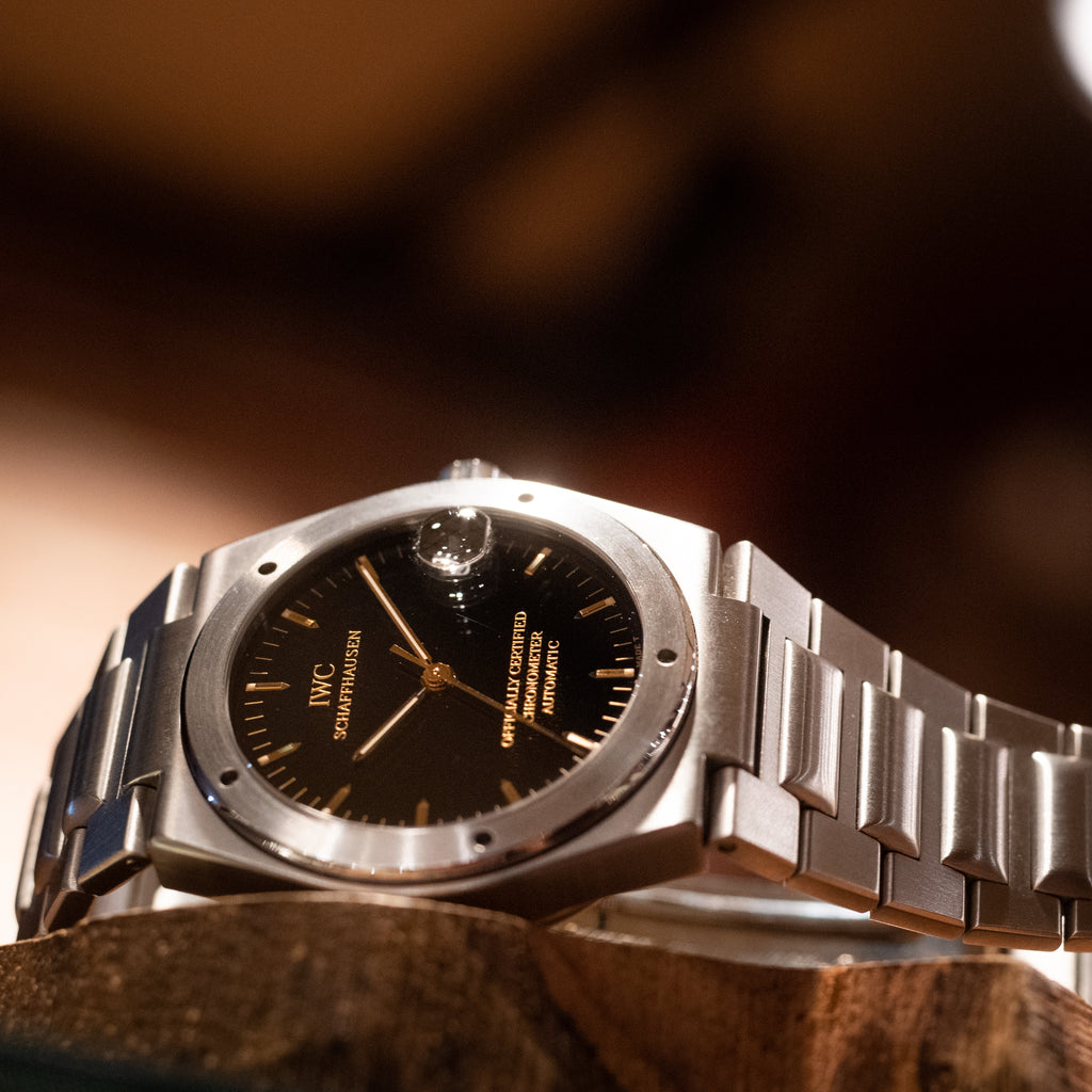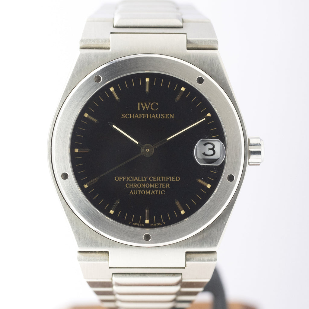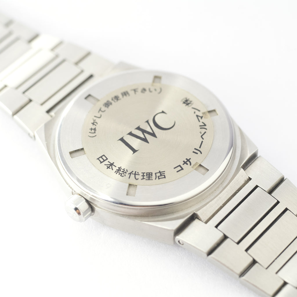 1995年製のIWCインヂュニアRef.3521ミントコンディションです。世界一の時計デザイナーと呼ばれるジェラルド・ジェンタ氏のデザインの代表作の一つで、インヂュニアは「エンジニア」を意味し、軟鉄製の内蓋が入ることで耐磁性能に優れたモデルです。武骨で重厚なデザインが魅力的で、ブラックの文字盤とゴールドレターの組み合わせが高級感と精悍な印象を兼ね備えた大人な一本です。同年代にデザインされたジェンタモデルのノーチラスやロイヤルオークとも共通する部分があり近年人気が高まり希少性が増しています。ムーブメントはCal.887/2を搭載。ケースは非常に状態の良いミントコンディションで裏ブタには当時の代理店『コサ リーベルマン(株)』のシールが綺麗に残ったままの状態になっております。手巻きや針回し、ねじ込みリューズの操作はスムースです。