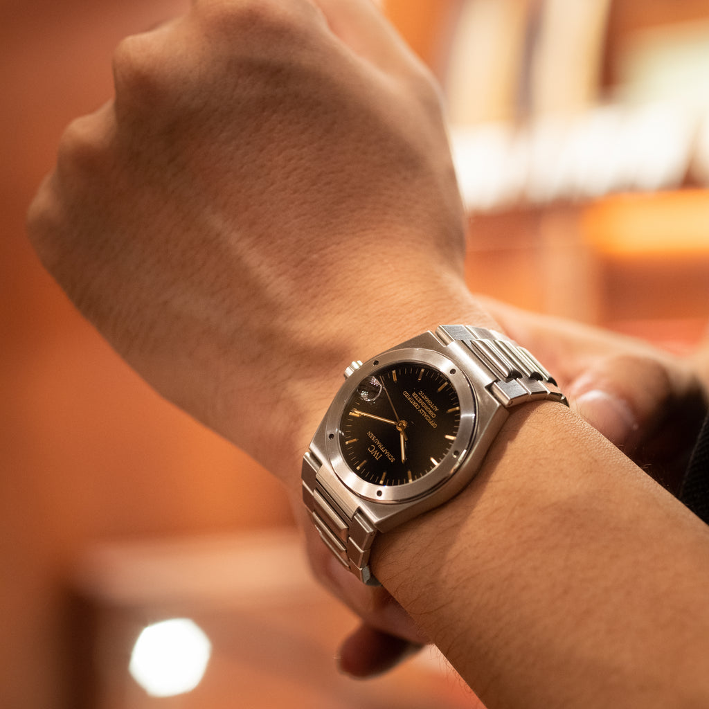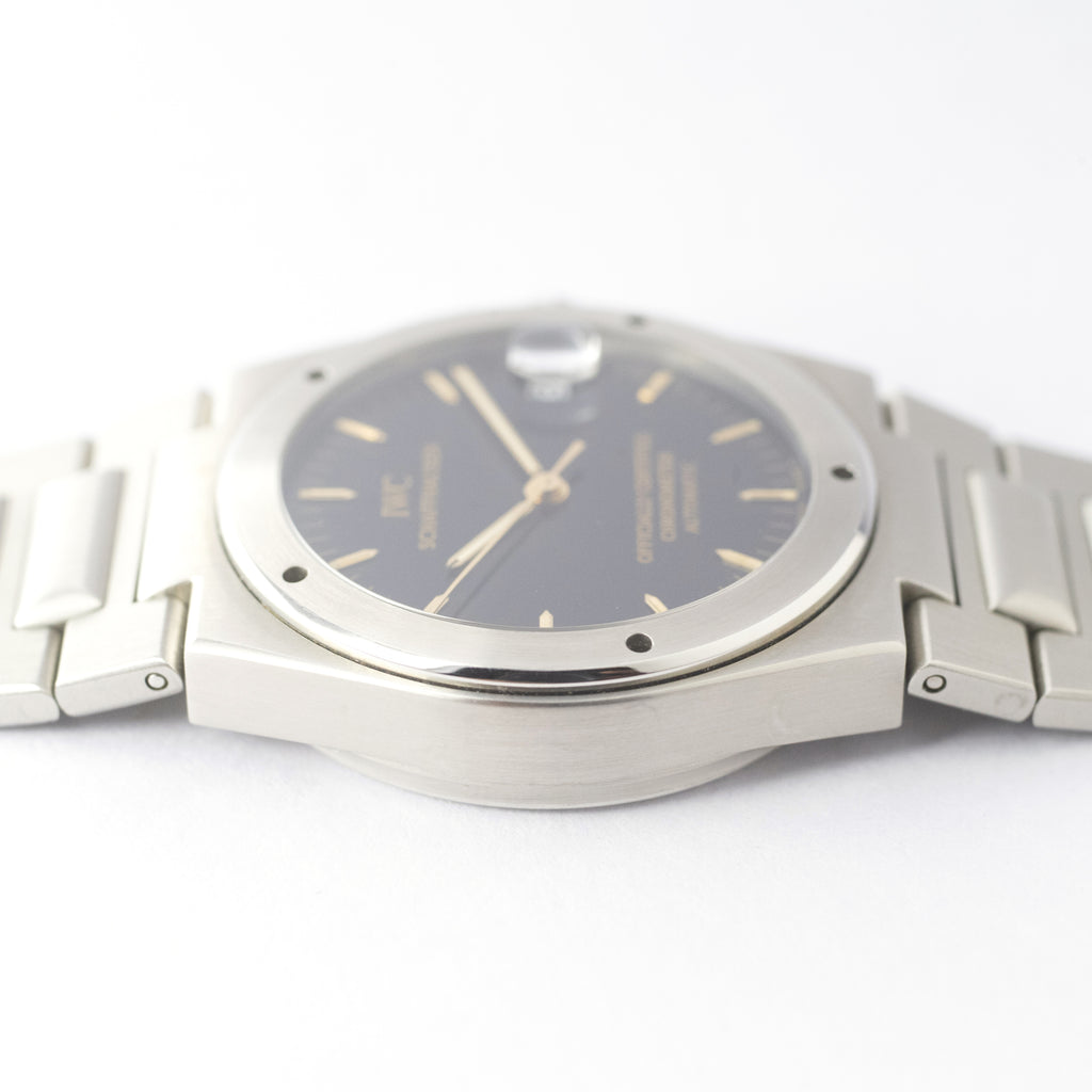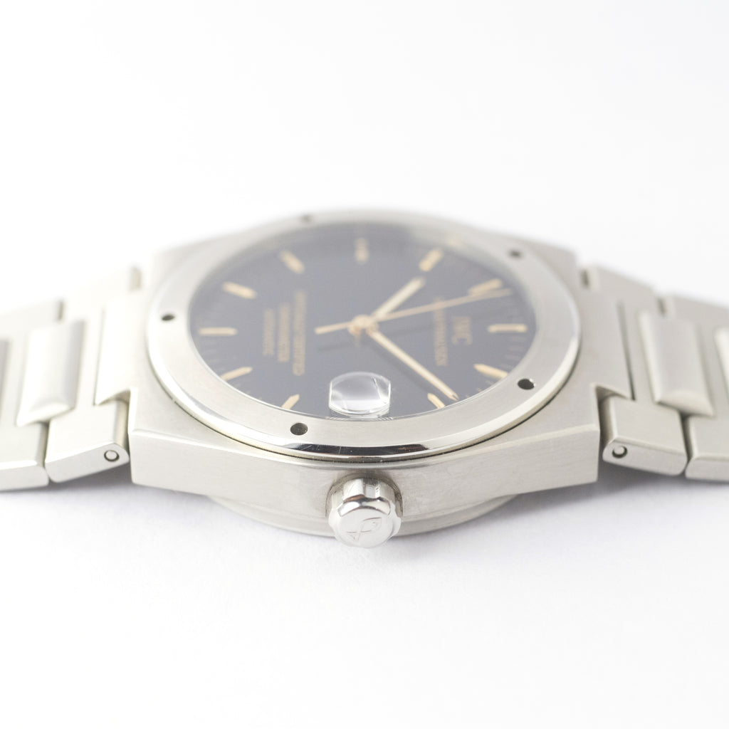 1995年製のIWCインヂュニアRef.3521ミントコンディションです。世界一の時計デザイナーと呼ばれるジェラルド・ジェンタ氏のデザインの代表作の一つで、インヂュニアは「エンジニア」を意味し、軟鉄製の内蓋が入ることで耐磁性能に優れたモデルです。武骨で重厚なデザインが魅力的で、ブラックの文字盤とゴールドレターの組み合わせが高級感と精悍な印象を兼ね備えた大人な一本です。同年代にデザインされたジェンタモデルのノーチラスやロイヤルオークとも共通する部分があり近年人気が高まり希少性が増しています。ムーブメントはCal.887/2を搭載。ケースは非常に状態の良いミントコンディションで裏ブタには当時の代理店『コサ リーベルマン(株)』のシールが綺麗に残ったままの状態になっております。手巻きや針回し、ねじ込みリューズの操作はスムースです。