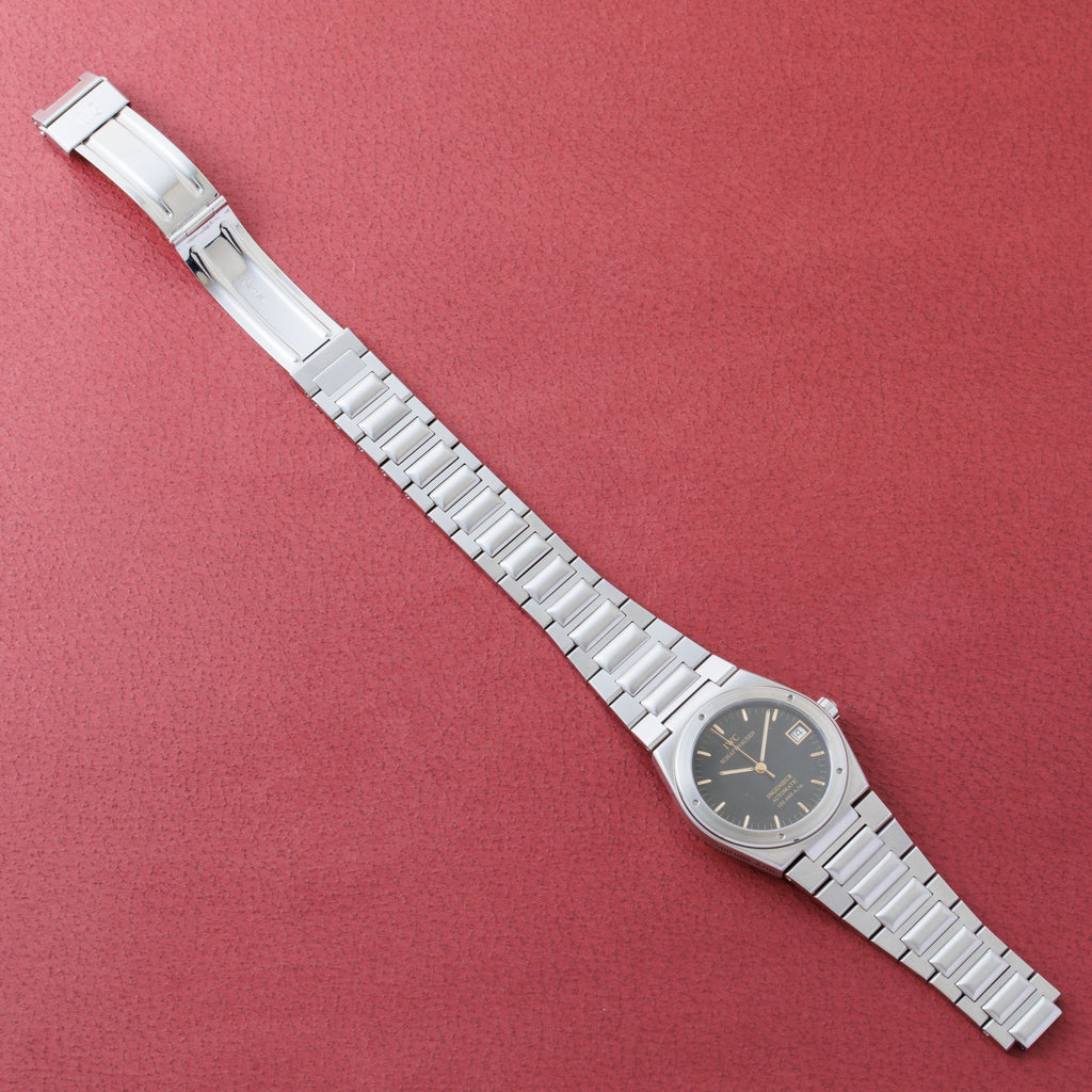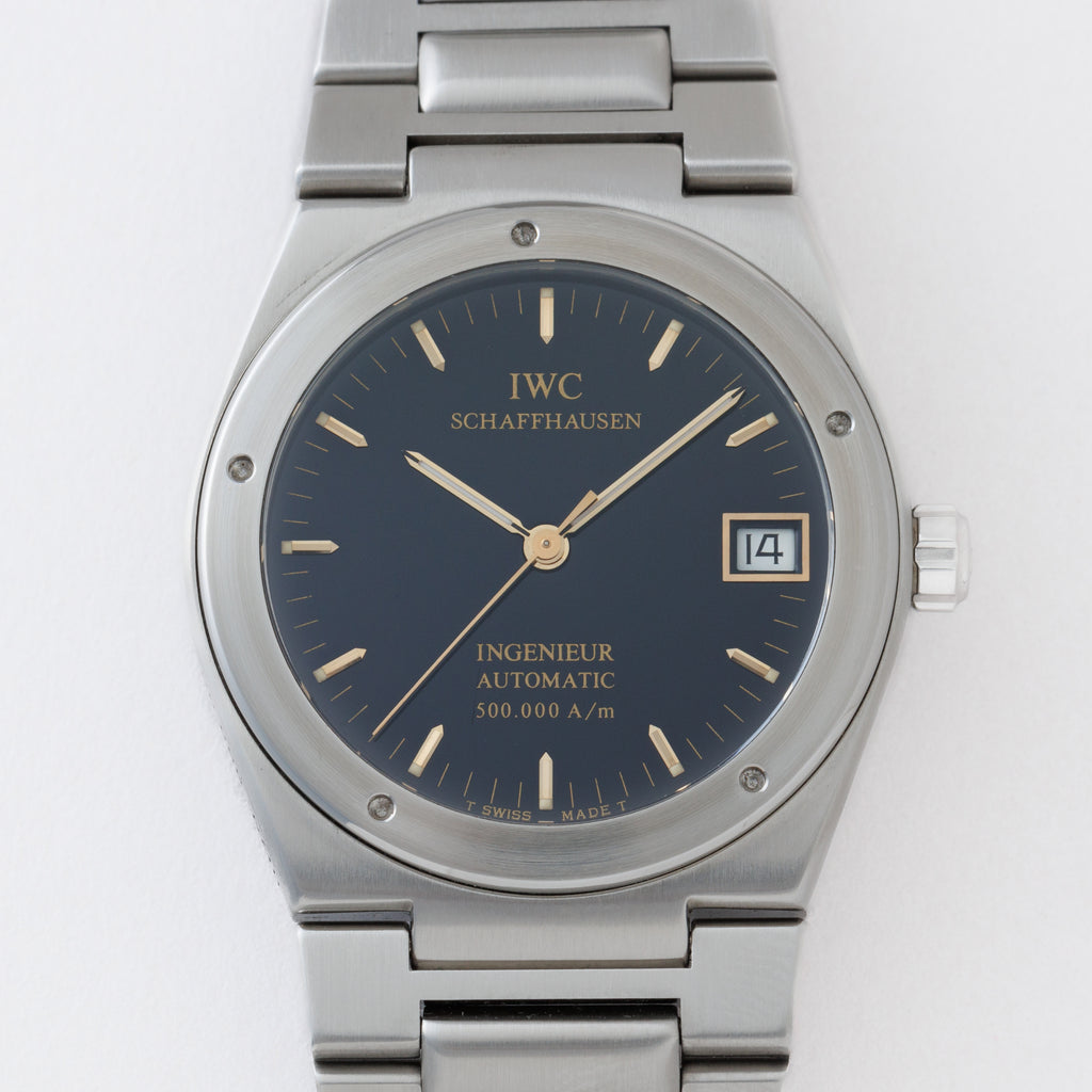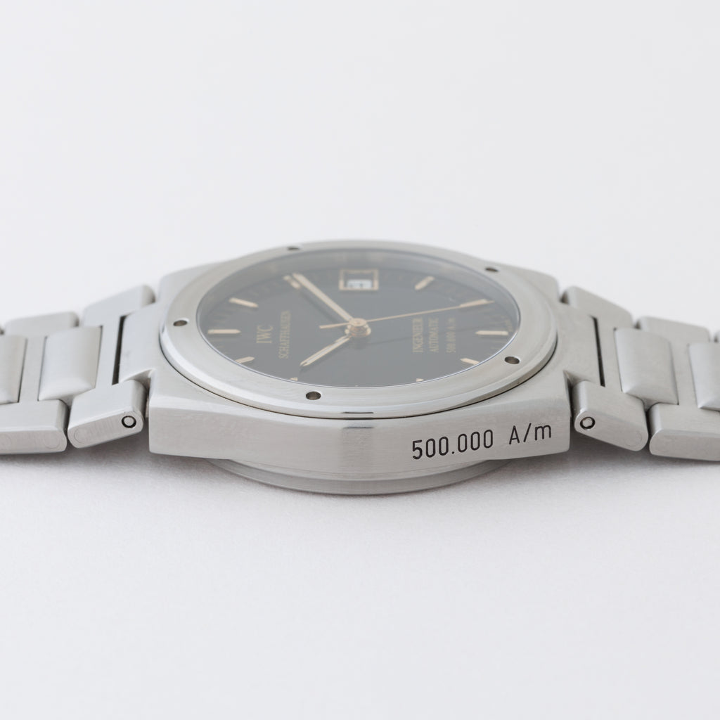 IWC インヂュニア 1989年製 Ref.3518-002 500.000A/m ジェラルド・ジェンタデザインです。復刻モデルも出たジェラルド・ジェンタデザインの耐磁時計インジュニアになります。新作インヂュニアは44000A/mの耐磁性能を誇りますが、こちらの時計は驚異の500,000A/mの耐磁性能になっています。人気のブラックダイヤルでミラーダイヤルの様なゴールドレターでオリジナルのトリチウム夜光でヴィンテージの雰囲気になっています。文字盤はシミ等無く綺麗な状態です。ケースもオリジナルのシェイプで磨きを感じさせない良い状態になっています。ブレスの伸びも感じられません。手巻きや針回しの操作はスムースです。