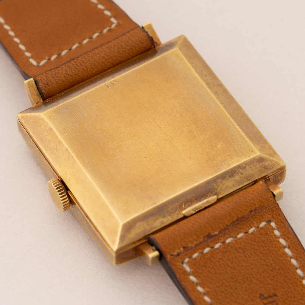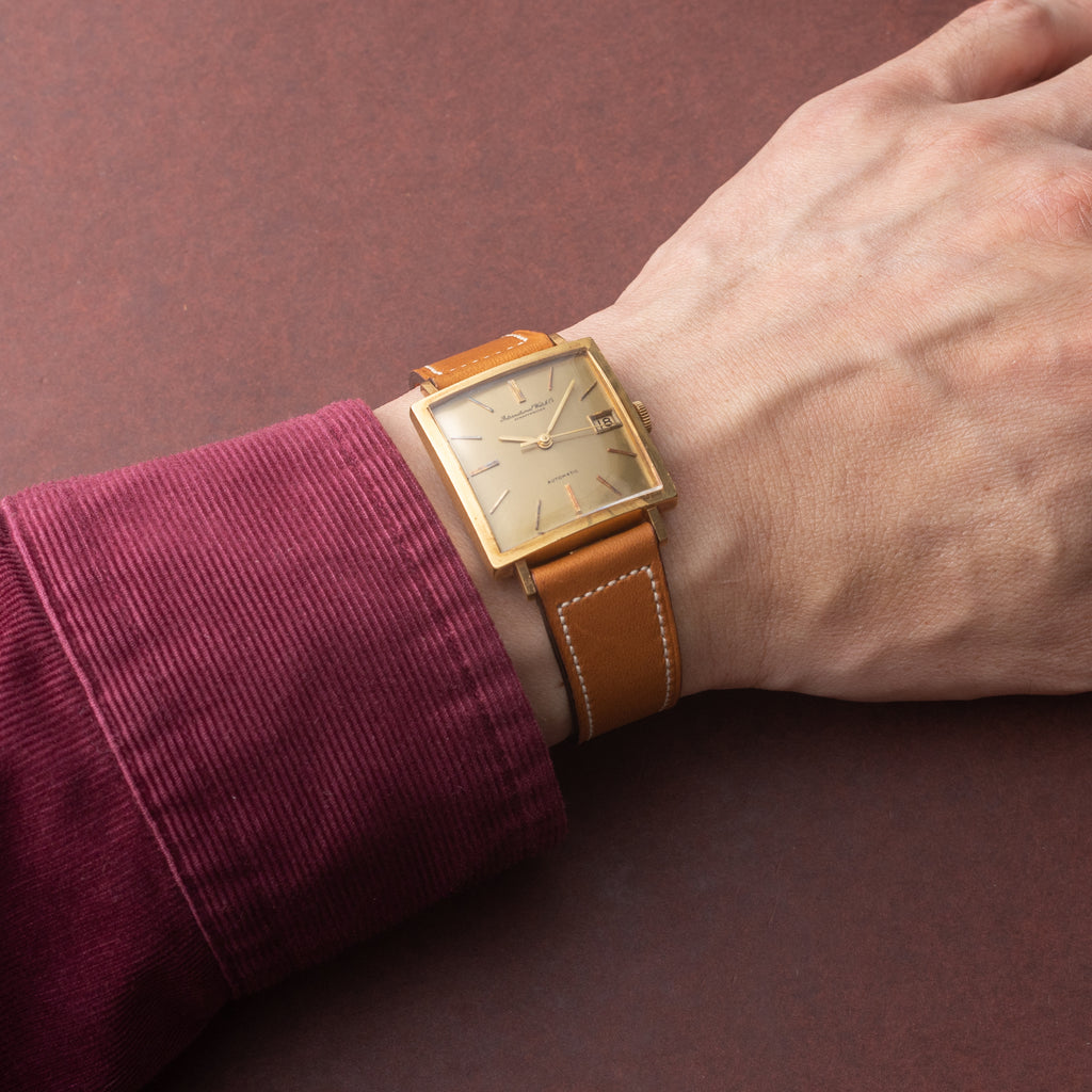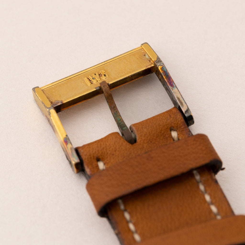 IWCの角型18金無垢ケース自動巻きです。やや大振りな角型ケースにペラトン式自動巻きCal.8541を搭載した自動巻きモデルです。文字盤は古いリダンと思われますが雰囲気が良い1本です。ケースは小傷が見られますが大きなダメージはありません。ベルトはジャン・クロード・ペランのカーフが取り付けられています。IWCの金張り尾錠が取り付けられています。こちらはオーバーホール済みです。