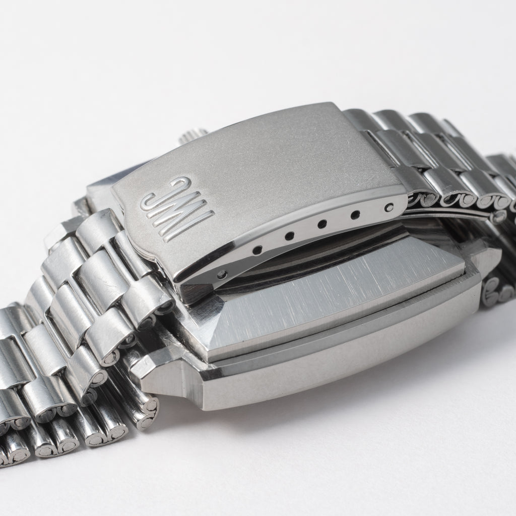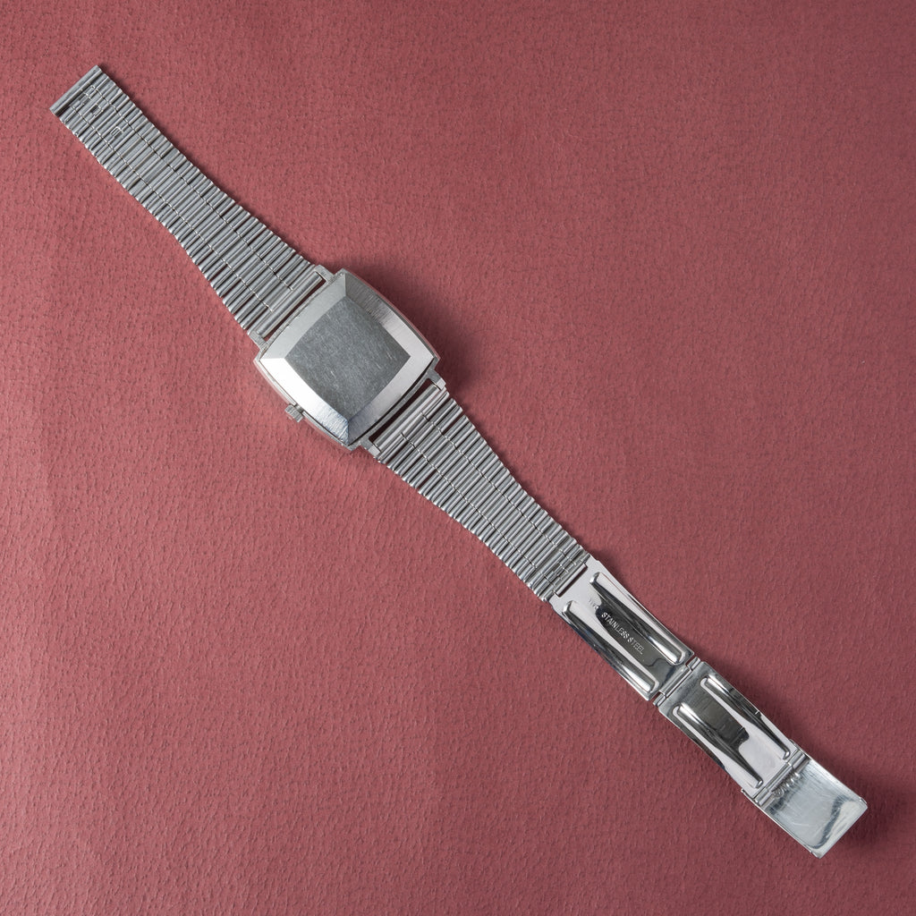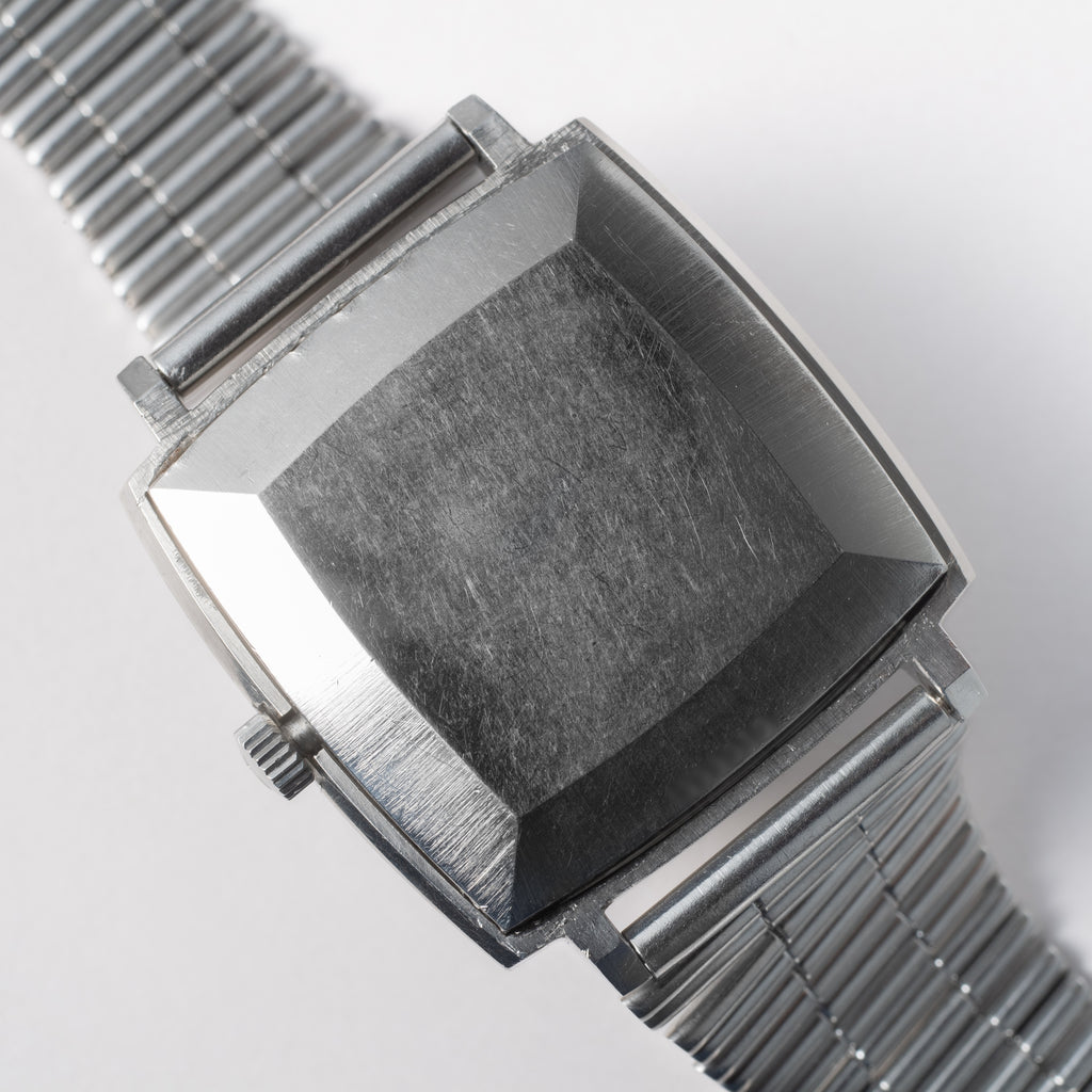 IWC スクエアオートマチック 1970年製(昭和45年製)Cal.8541B 純正ブレス付き です。珍しい角型自動巻きで1970年代らしい近未来的なデザインが目を惹きます。文字盤全体に表面の劣化が見られますが良い雰囲気になっています。ケースは小傷が見られますが大きなダメージはありません。手巻きや針回しの操作はスムースです。ムーブメントはペラトン式自動巻きの完成形Cal.8541Bを搭載しています。貴重な純正ステンレスブレスが取り付けられています。こちらの時計は分解掃除済みです。