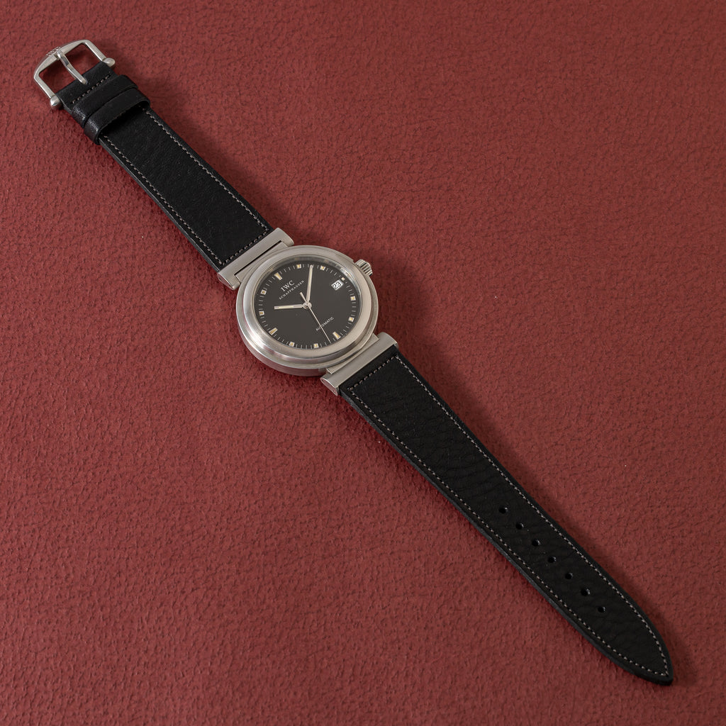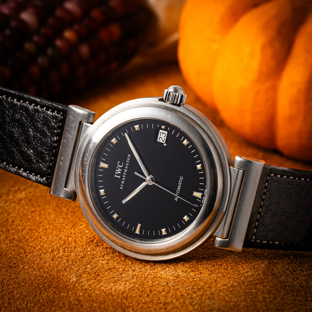 1998年製のIWCダ・ヴィンチ SL オートマチックモデルです。可動式のラグにIWCらしいシンプルでスッキリとしたデザインの実用性が高いモデルです。ケースは小傷はございますが大きなダメージはございません。手巻きや針回しの操作はスムーズです。ベルトはヴィンテージウォッチに相性抜群のアキュレイトフォルムに純正尾錠が取り付けられています。付属品として純正の箱(痛み有り)、タグ、冊子が付いてきます。