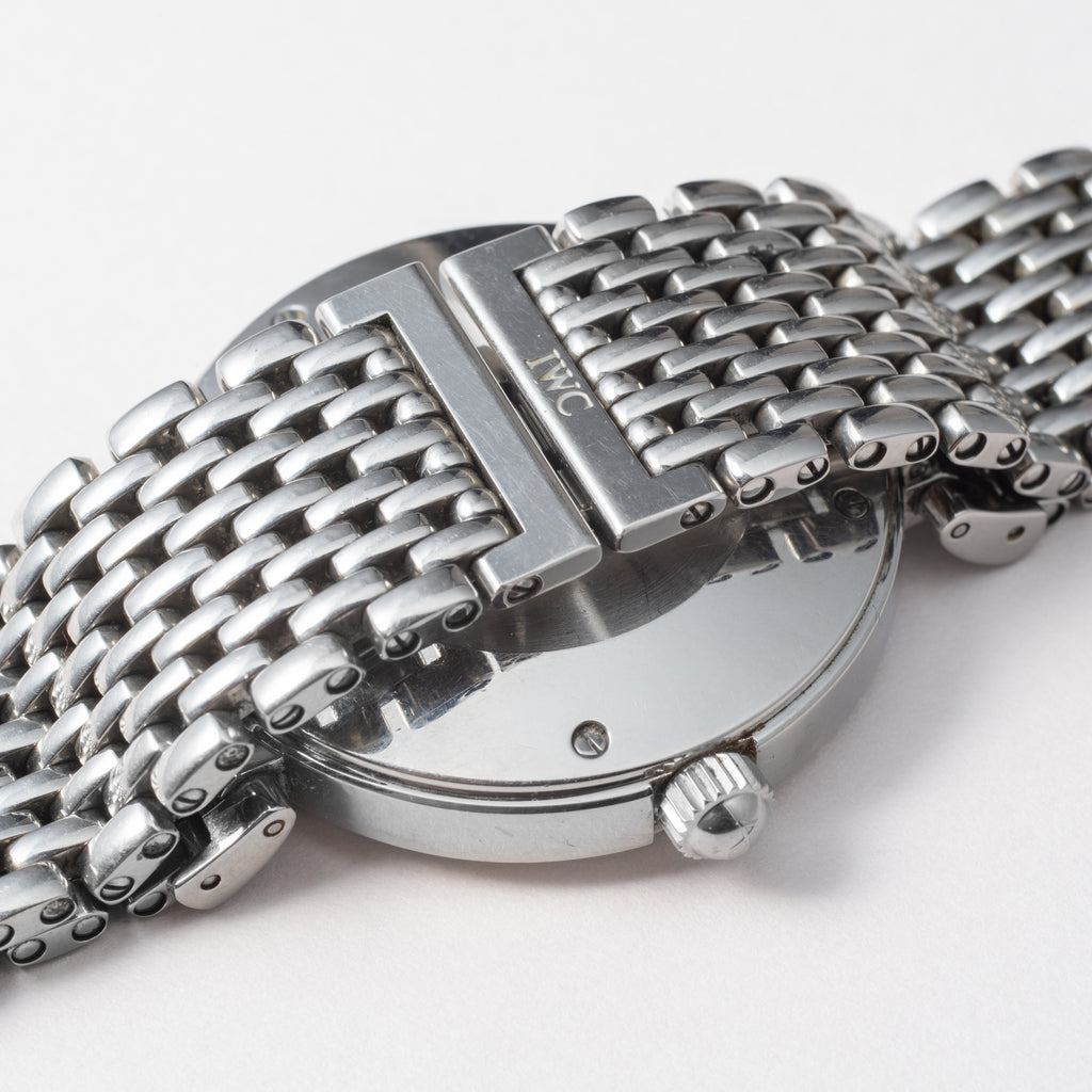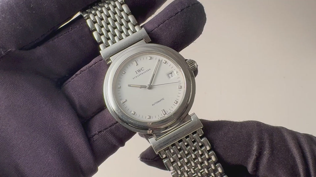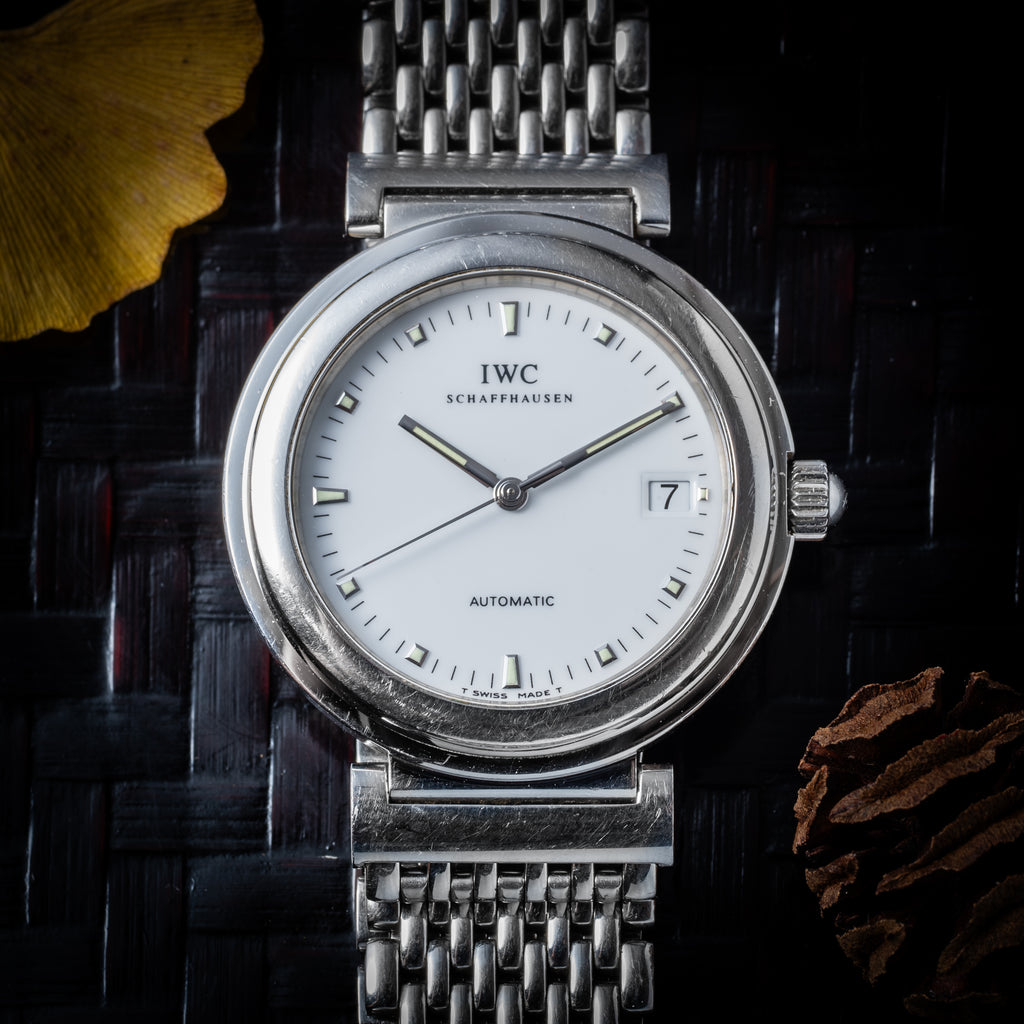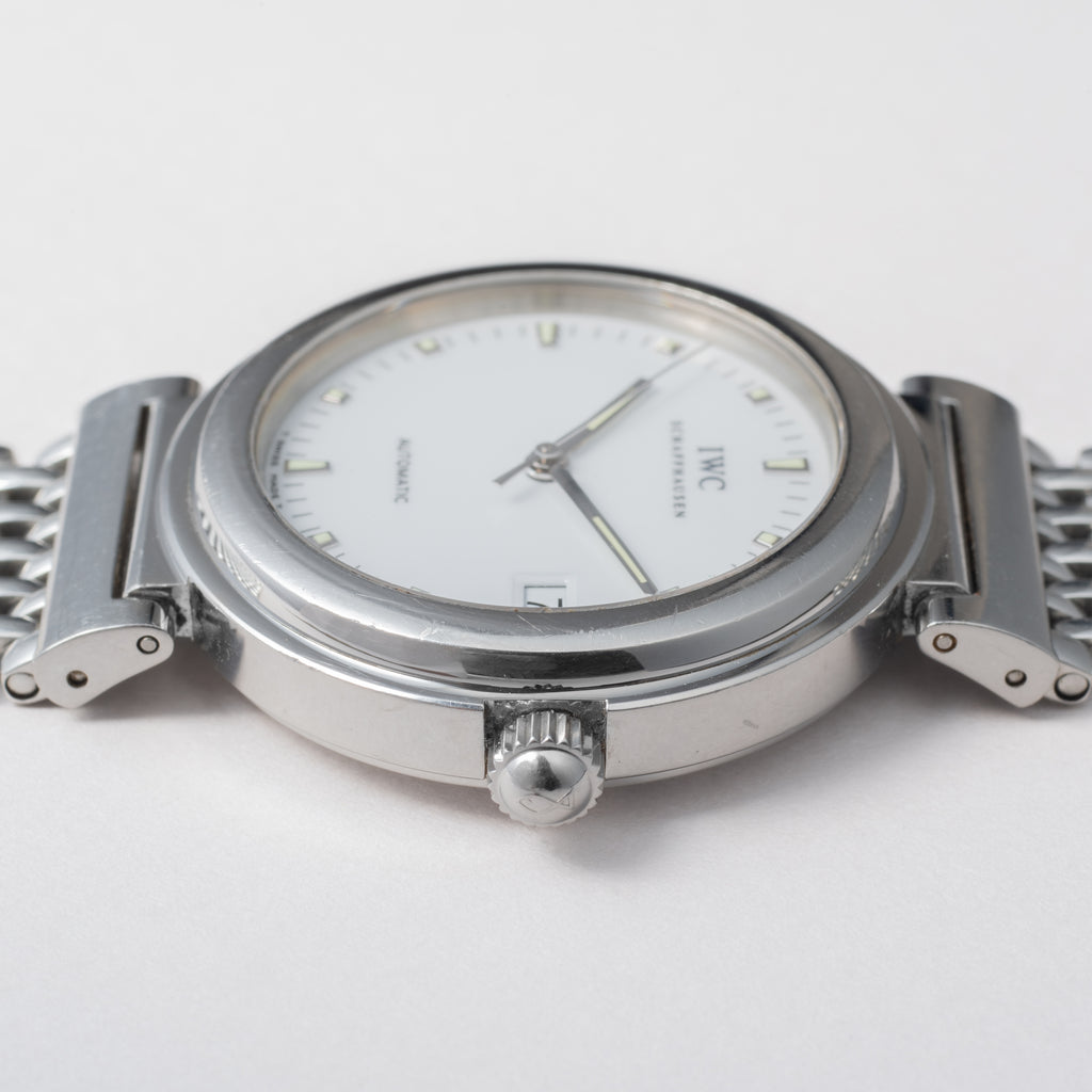 1998年製IWCのダ・ヴィンチです。透明感のあるエナメル調のホワイトダイヤルが美しく、デイト表示と自動巻きの機械は実用性も高めています。幅約37㎜とポートフィノより一回り大きく存在感があります。小傷等はありますが大きなダメージは少なく状態は良いです。手巻きや針回しファンクションは問題ありません。ベルトは純正のステンレスブレスが装着されています。