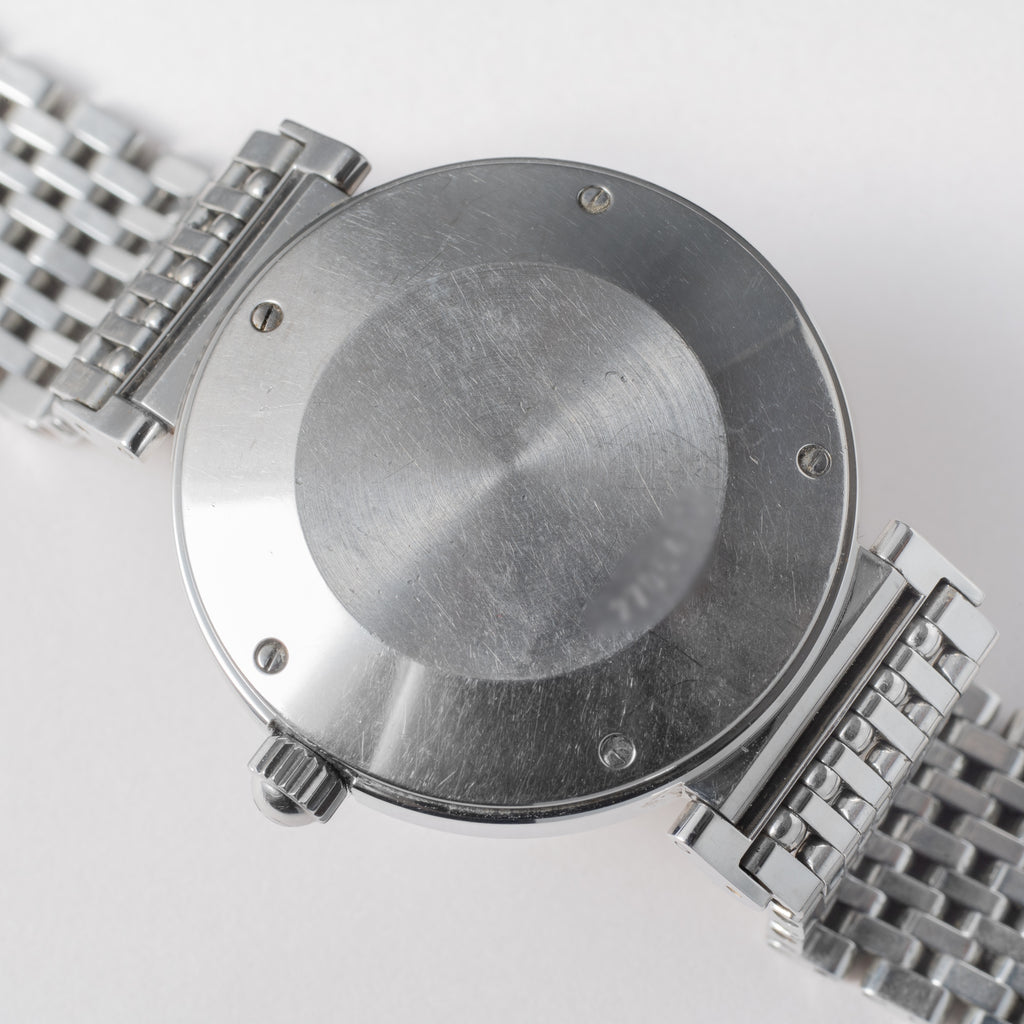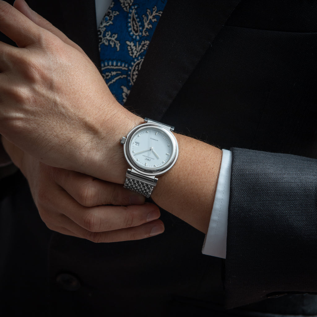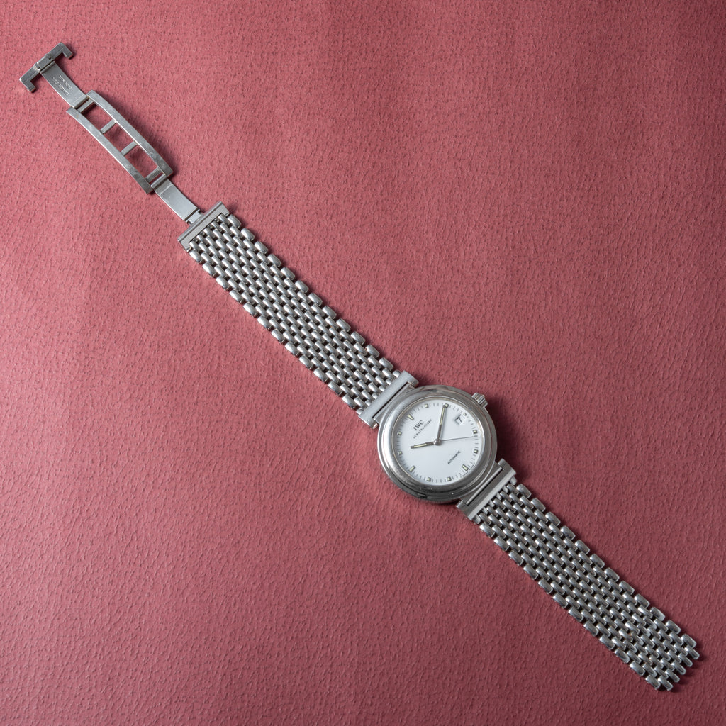 1998年製IWCのダ・ヴィンチです。透明感のあるエナメル調のホワイトダイヤルが美しく、デイト表示と自動巻きの機械は実用性も高めています。幅約37㎜とポートフィノより一回り大きく存在感があります。小傷等はありますが大きなダメージは少なく状態は良いです。手巻きや針回しファンクションは問題ありません。ベルトは純正のステンレスブレスが装着されています。