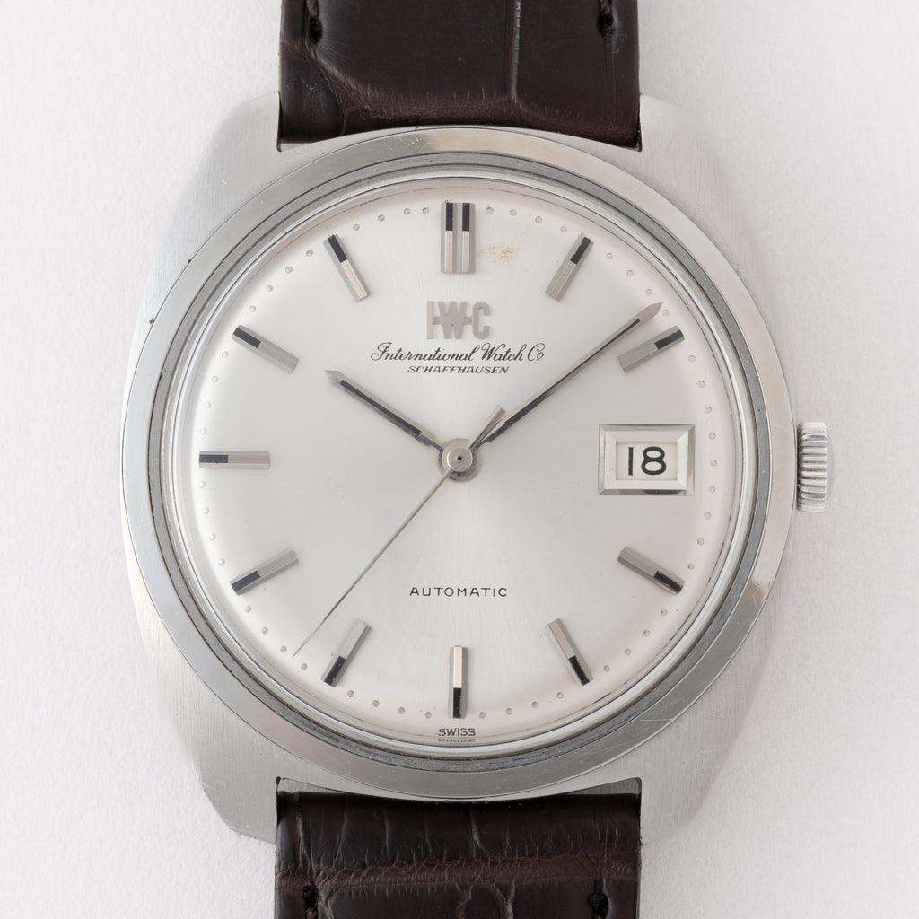 1969年製のIWCトノーケースオートマチックモデルです。IWCのアップライトのロゴと筆記体のレターが両方入るダイヤルは、12時横に経年変化が出ていますが、概ね良いコンディションです。どっしりとしたトノーケースで装着時の存在感も楽しめます。ムーブメントはペラトン式自動巻きのCal.8541搭載しております。ケースは小傷はございますが大きなダメージはございません。手巻きや針回しの操作はスムーズです。ベルトはファイアーキッズオリジナルのクロコダイルを合わせています。こちらはOH済みです。