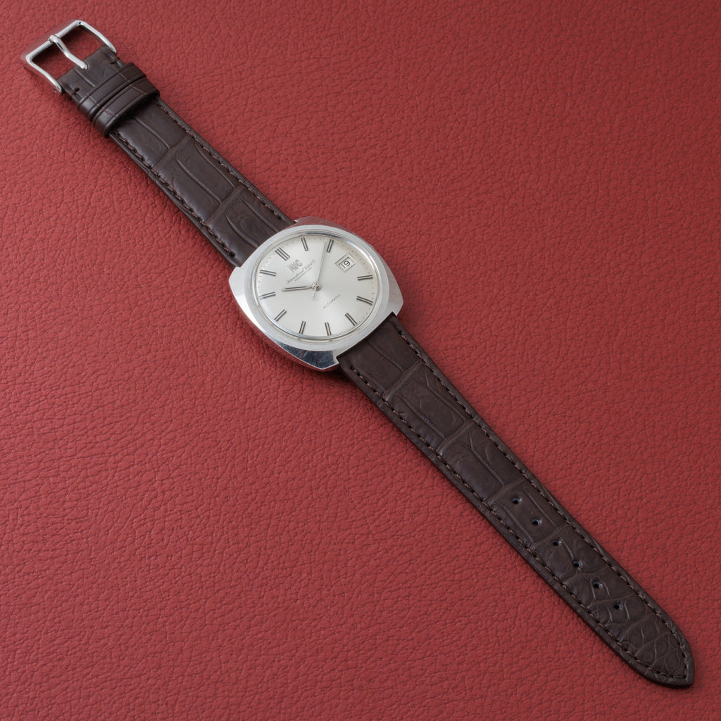 インターナショナルウォッチカンパニー トノーケース R814A 1967年製 ペラトン式自動巻き Cal.8541 防水ワンピースケース お魚リューズです。ラグが短く腕乗りの良い、先進的な防水ワンピースを採用したモデルですが、オールドインターらしいIWCと筆記体の両方表記でパールドットの文字盤が魅力的です。文字盤はシミ等無く綺麗です。ケースは小傷が見られますが大きなダメージはありません。手巻きや針回しの操作はスムースです。ベルトはファイアーキッズオリジナル革ベルトのクロコダイルが取り付けられています。こちらの時計は分解掃除済みです。