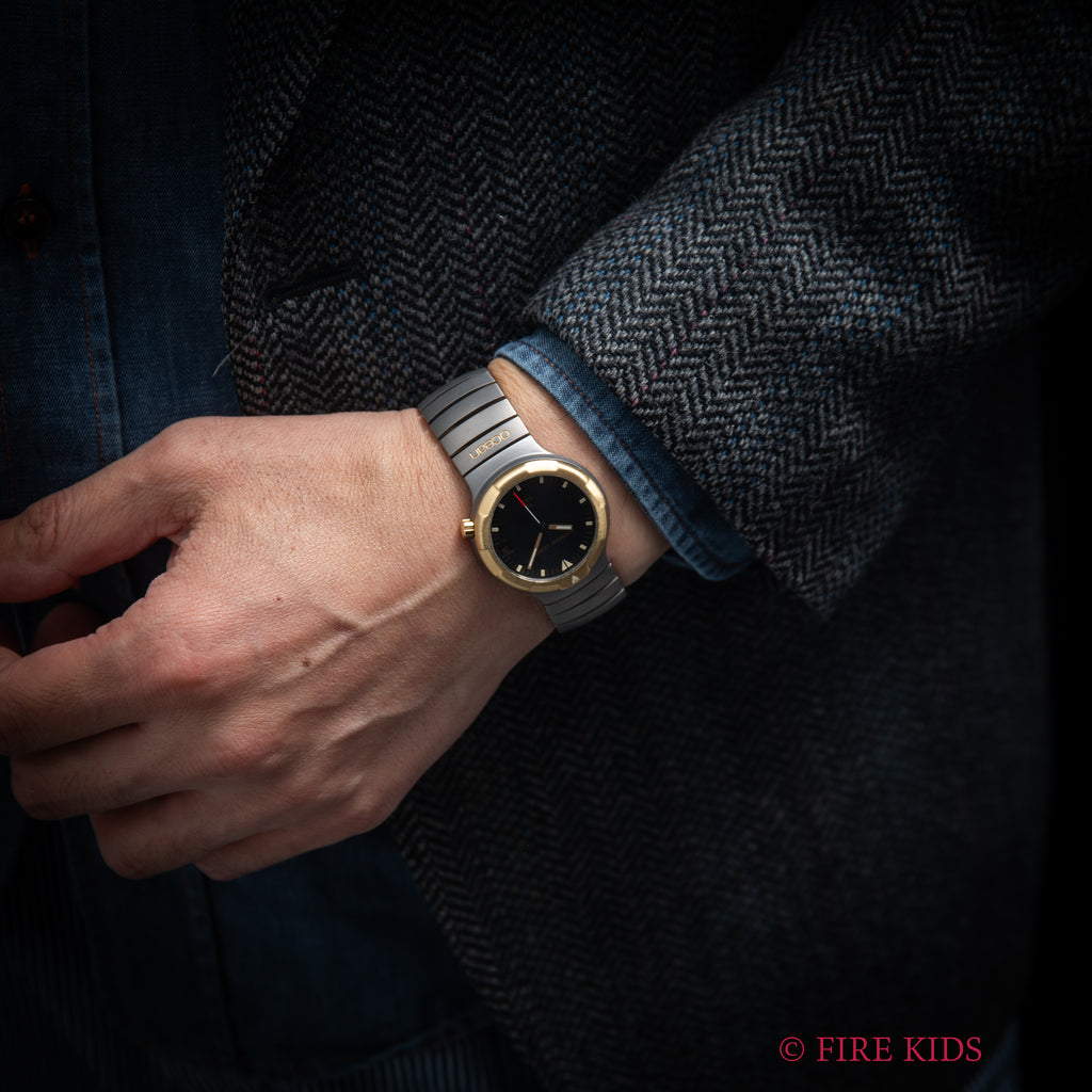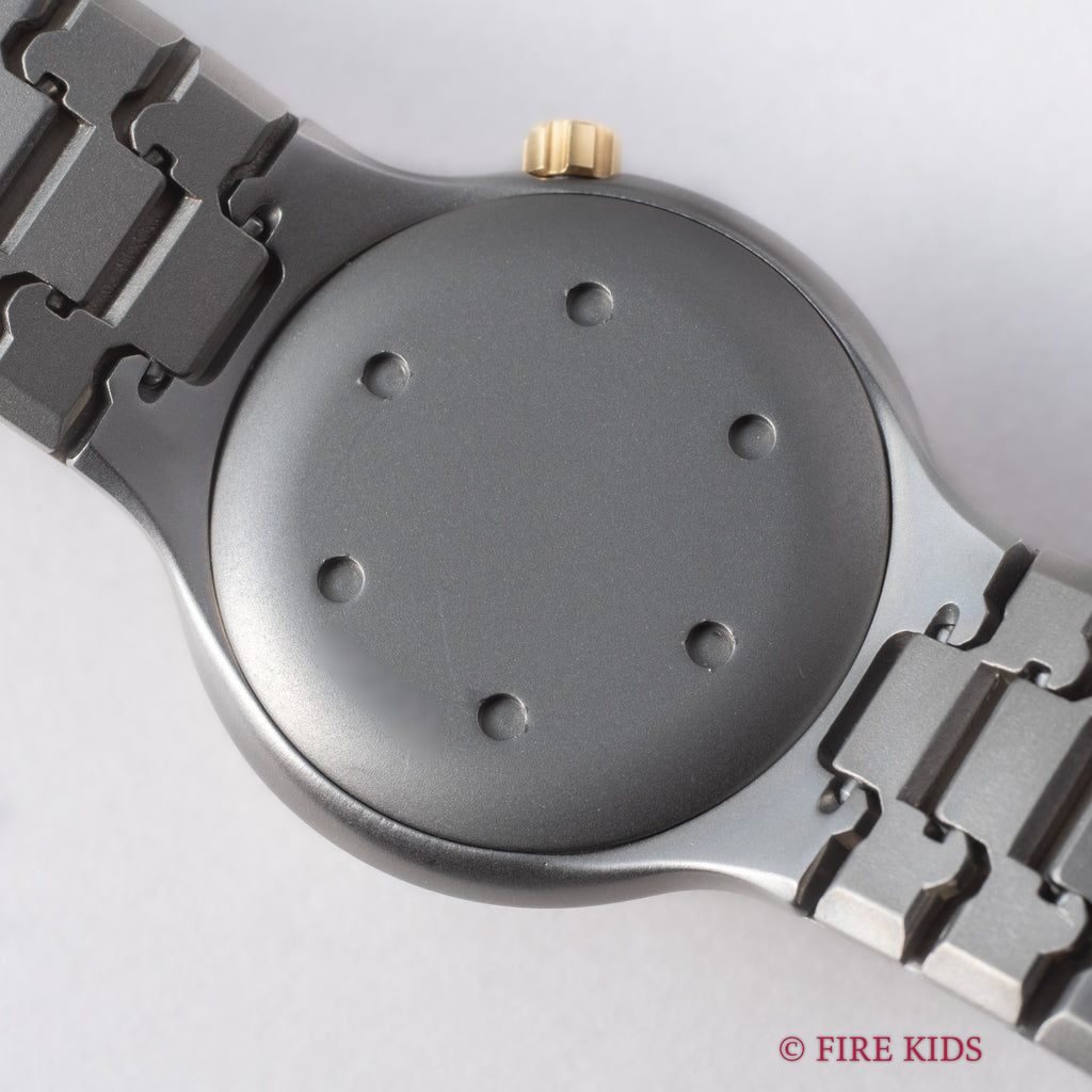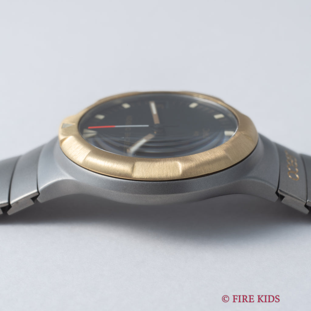 1987年製のポルシェデザイン by IWC オーシャン500 コンビモデルです。ポルシェデザインとIWCが共同開発した代表的なモデルで、本品は希少なイエローゴールドベゼルとチタンケース、チタンブレスのコンビモデルです。ケース径34mmの小振りなサイズが魅力的でモデル名の通り500m防水(当時)のハイスペックさと近未来感のあるデザインが唯一無二の存在感があります。ダイヤル、ケース、ブレスにいたっても若干の使用感はありますが良いコンディションです。手巻きや針回し、ねじ込み操作はスムーズです。