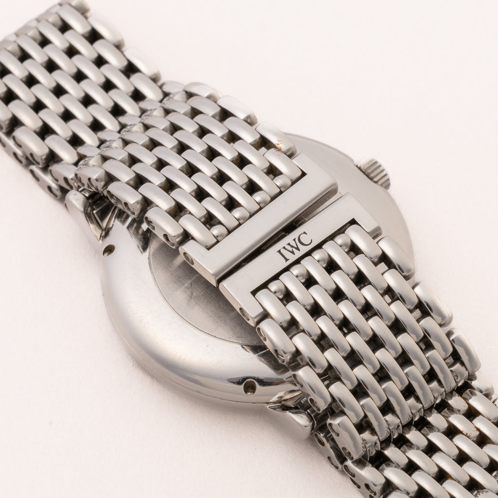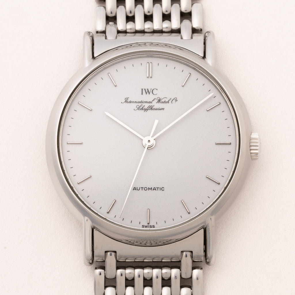 IWC ポートフィノ オートマチック 1990年代製 純正ブレス付きになります。クラシカルな優美さをもつポートフィノコレクションはエナメルホワイト文字盤に薄型のケースとメッシュ調のブレスレットが付きます。コンディションはダイヤルケース共に非常に良いコンディションです。手巻きや針回しの操作はスムースです。付属品としてIWCの純正中古革ベルトが付いてきます。