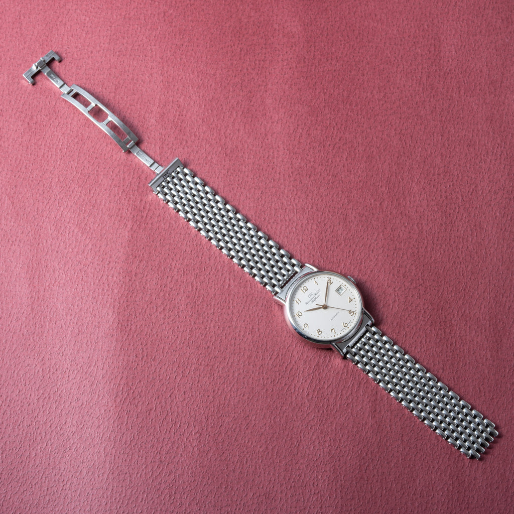 1991年製のIWCポートフィノ自動巻きモデルです。 代表的なモデルであるポートフィノ、ラウンド状のステンレスケースにゴールドインデックスが映えるホワイト文字盤の上品かつシンプルなデザインが魅力です。筆記体のインターナショナルウォッチカンパニー表記も抜群の雰囲気です。ケースは小傷はありますが、大きなダメージはありません。手巻きや針回しの操作はスムースです。ベルトは純正のステンレスブレスが取り付けてあります。