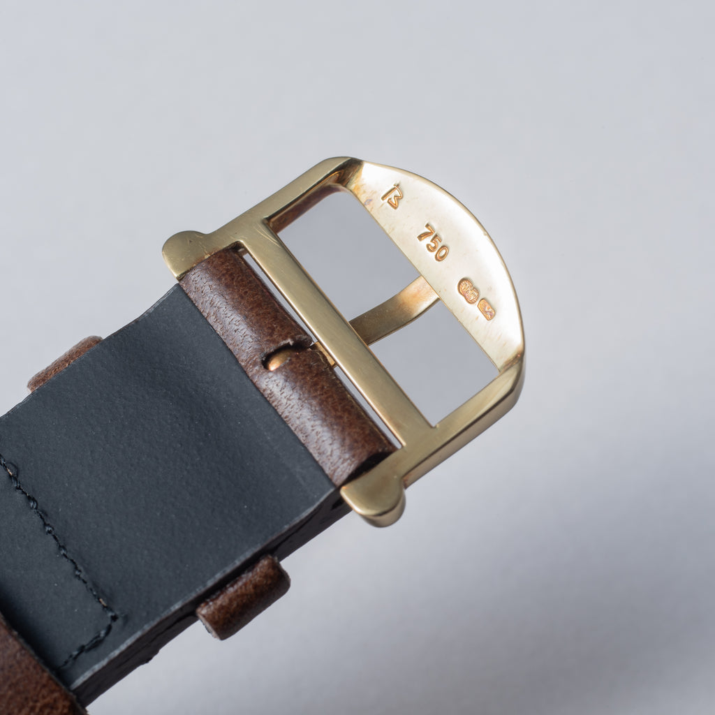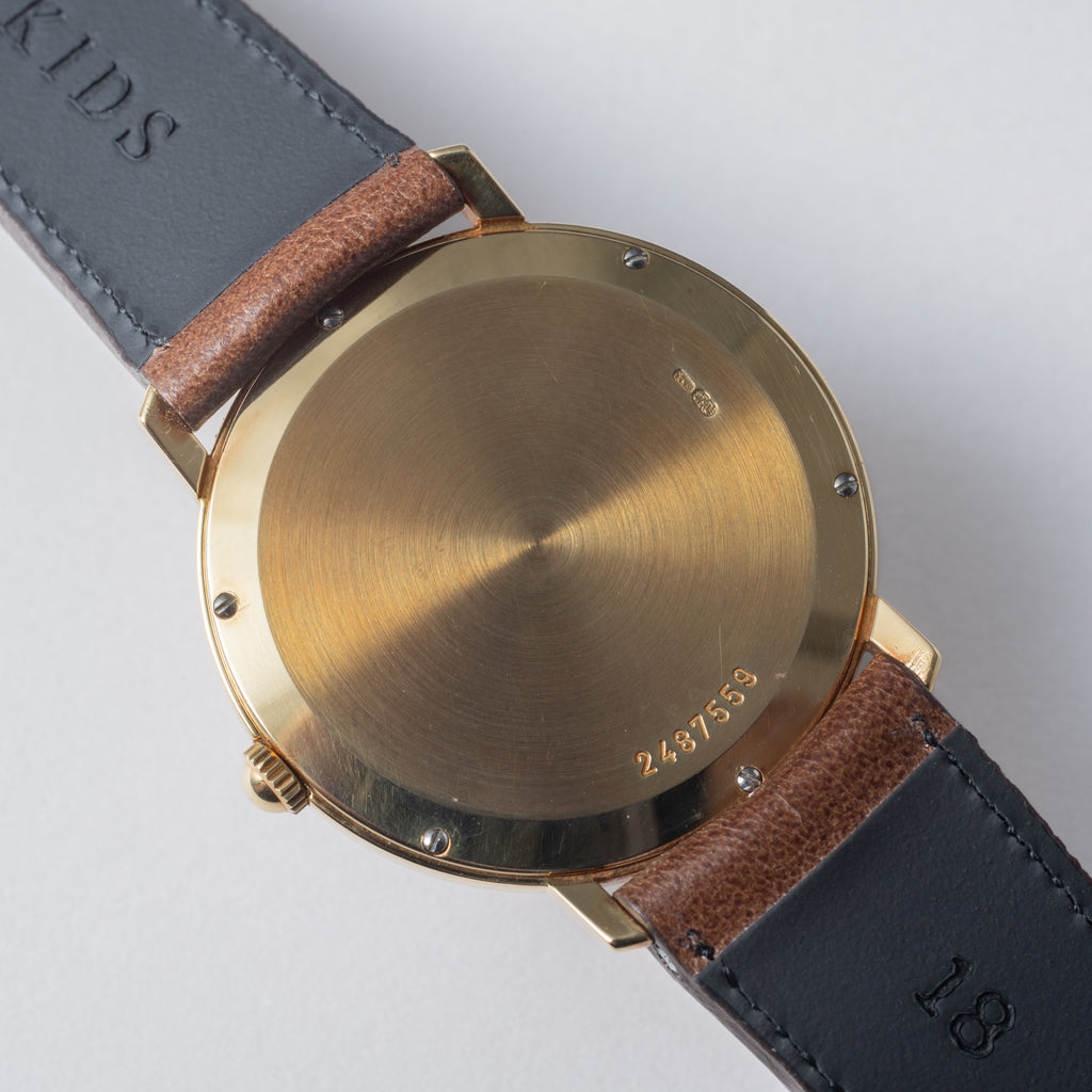 1991年製のIWCポートフィノ手巻きモデルです。18金無垢製のラウンドケースに2針、ローマンインデックスの2トーンシルバー文字盤の上品な組み合わせです。ケースの厚みは約5mmの薄型で装着時に袖に引っ掛かりません。ムーブメントは手巻きを搭載。手巻きや針回しの操作はスムースです。ベルトはファイアーキッズオリジナルの革ベルトに18KYGの純正尾錠が取り付けられています。