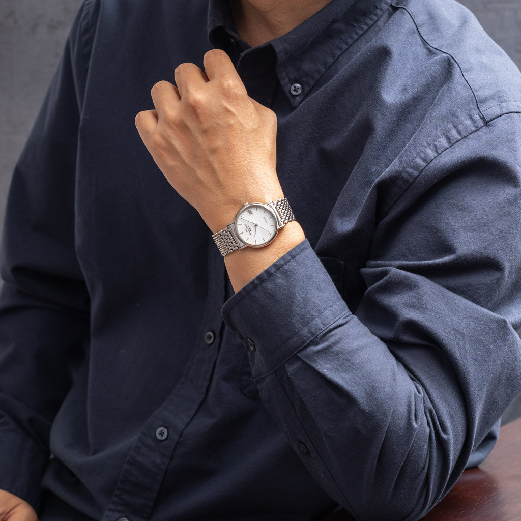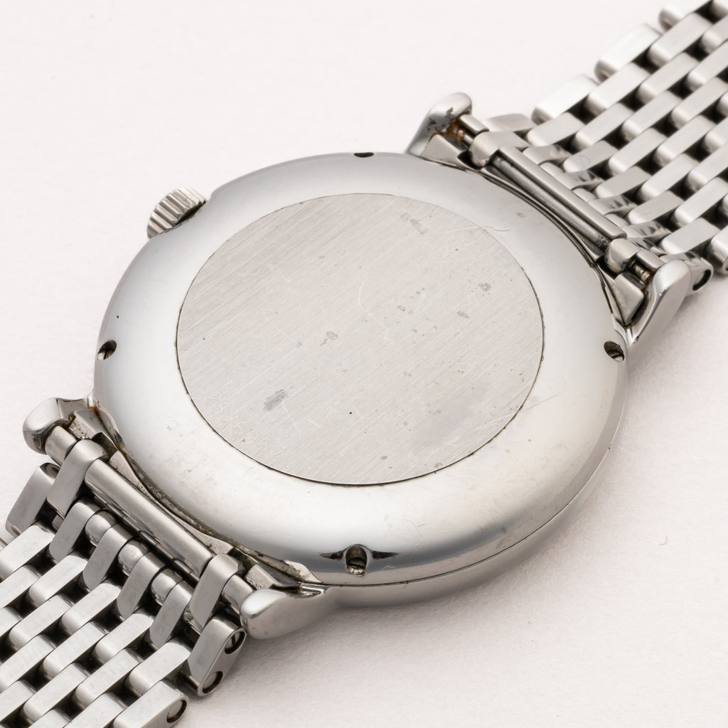 1994年製のIWCポートフィノ自動巻きモデルです。代表的なモデルであるポートフィノ、ラウンド状のステンレスケースに艶やかなエナメルホワイト文字盤が上品かつシンプルなデザインが魅力です。控え目なIWC表記に筆記体のインターナショナル ウオッチカンパニー表記も抜群の雰囲気です。ケースは小傷はございますが大きなダメージはございません。手巻きや針回しの操作はスムースです。ベルトは純正ステンレスブレスが取り付けてあります。
