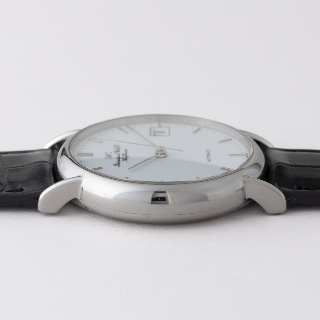 1994年製のIWCポートフィノ自動巻きモデルです。代表的なモデルであるポートフィノ、ラウンド状のステンレスケースに艶やかなエナメルホワイト文字盤が上品かつシンプルなデザインが魅力です。控え目なIWC表記に筆記体のインターナショナル ウオッチカンパニー表記も抜群の雰囲気です。丁度良い厚みのケースは小傷はございますが、大きなダメージはございません。手巻きや針回しの操作はスムースです。ベルトはファイアーキッズオリジナルのクロコダイルに純正の尾錠が取り付けてあります。