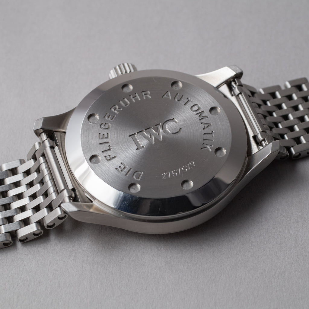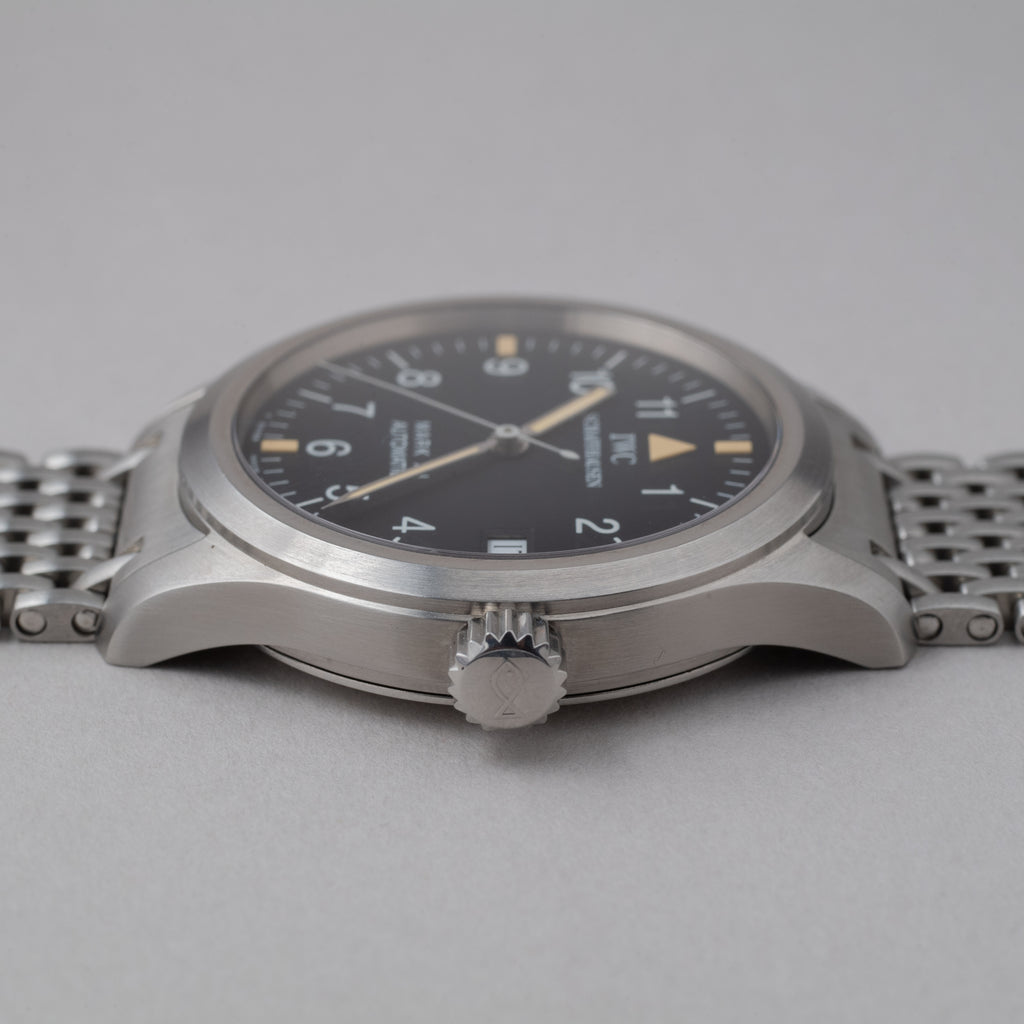 1999年製 インターナショナルウォッチカンパニー(IWC)の人気モデル マーク12です。ジャガールクルトベースの自動巻きムーブメントCal.884 / 2を搭載して36mmサイズという使いやすいサイズ感が魅力的な時計です。希少性の高い純正オリジナルステンレスブレス付きというのもポイントが高く、更にギャランティーが付属します。ケースは多少小傷はございますが、エッジも残っており抜群のコンディションと言って申し分ないです。
