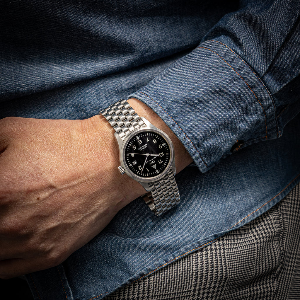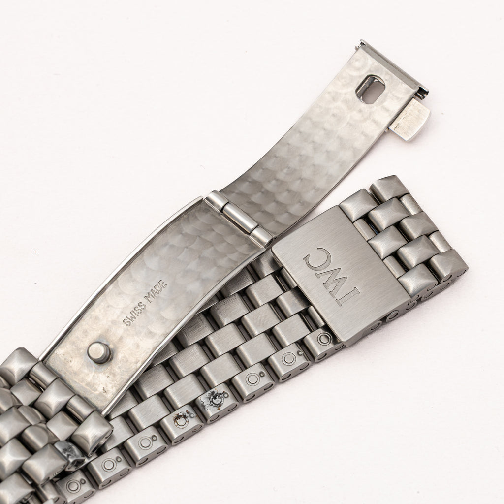 2001年製のIWC マーク15 ブレス付き 箱、ギャランティー付きが入荷しました。パイロットウォッチの軍用時計をルーツに持つマークシリーズです。全アラビア数字に夜光入りの針とミリタリーウォッチのデザインで、ケース径38mm(リューズ除く)の大きすぎず小さすぎずな良い塩梅のサイズ感です。ダイヤル、ケースともに大きなダメージはなく良好なコンディションです。手巻きや針回しはスムーズです。ブレスは純正ブレスが付いています。こちらは箱、ギャランティー、冊子、純正中古革ベルトが付属します。
