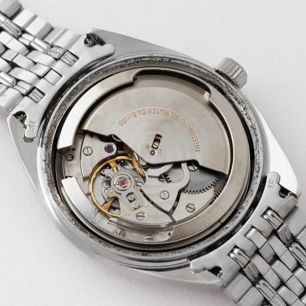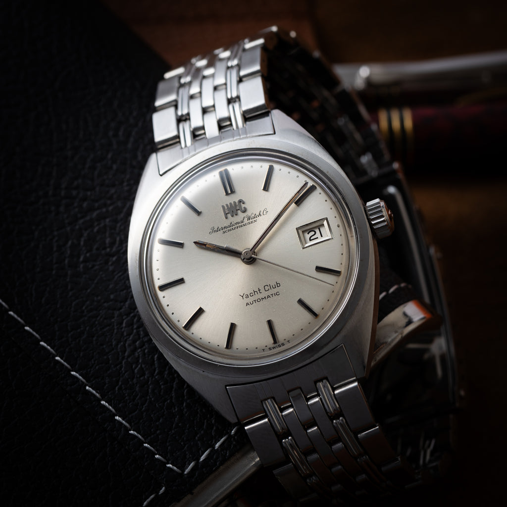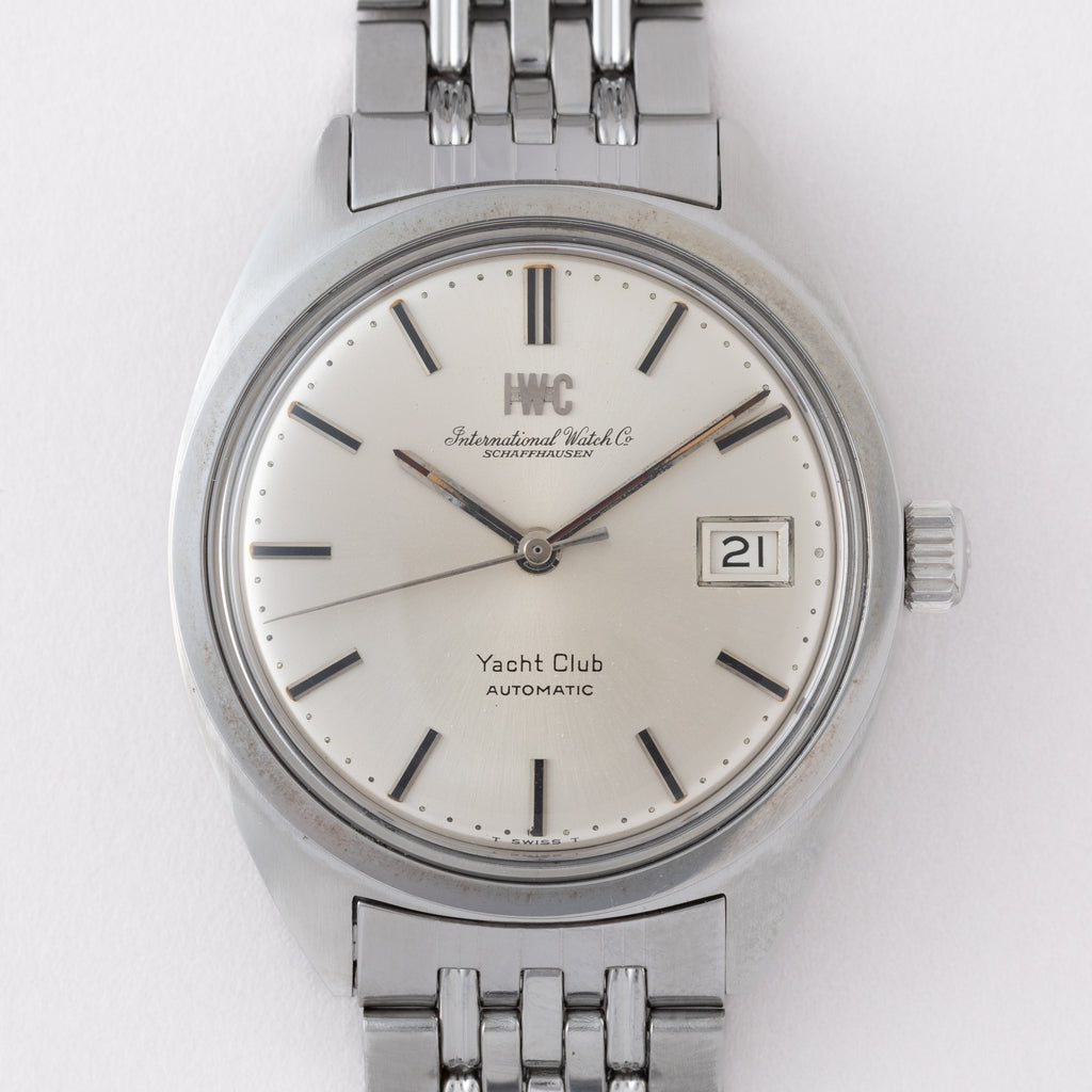 インターナショナルウォッチカンパニーのヨットクラブ1970年製です。シンプルながら防水構造のスポーツウォッチで、しっかりとした厚みがあり存在感があります。文字盤は非常に綺麗です。ケースは小キズが見られますが大きなダメージはありません。ムーブメントはペラトン式巻き上げのCal.8541Bで綺麗な状態です。手巻きや針回しの操作はスムースです。純正のGFブレス付きです。