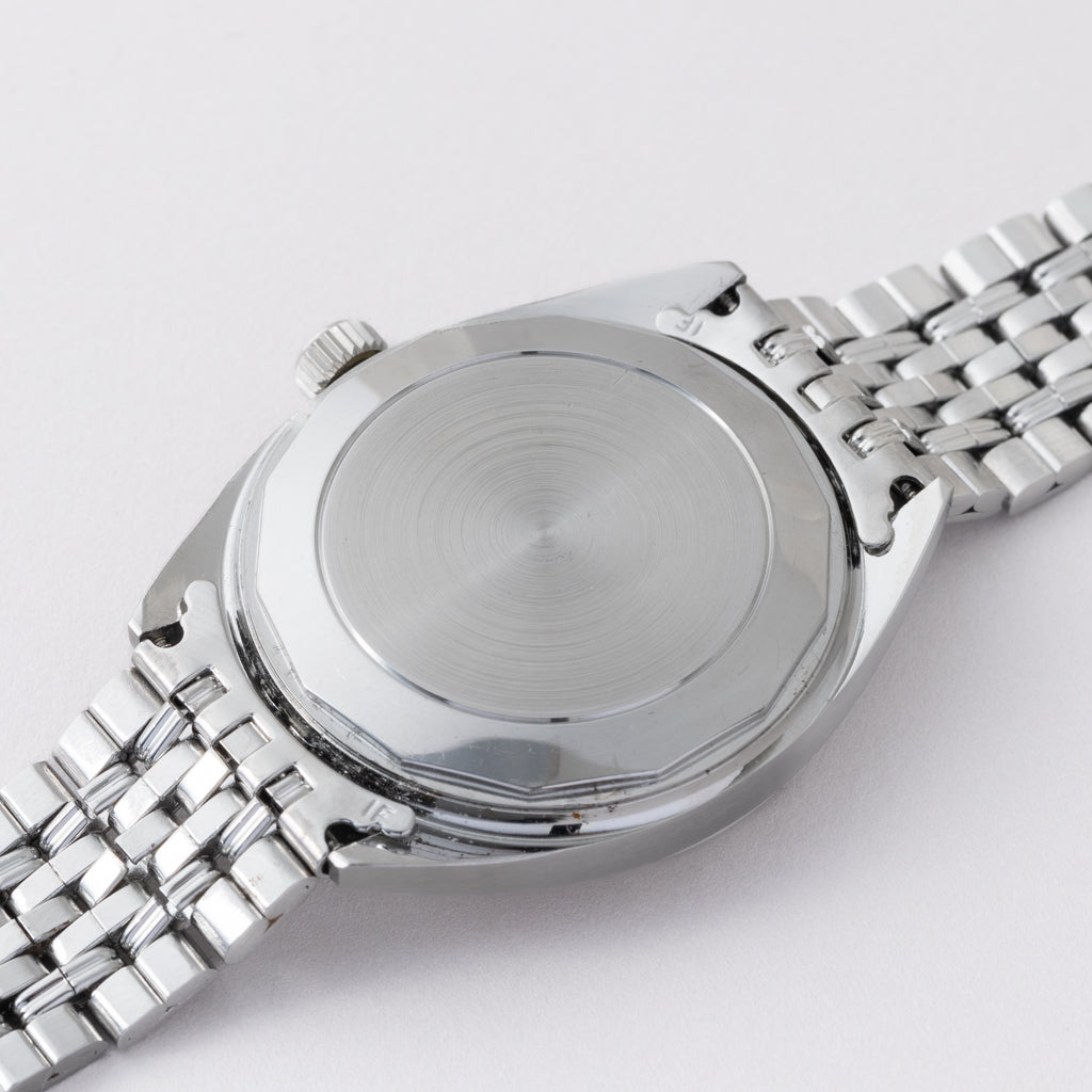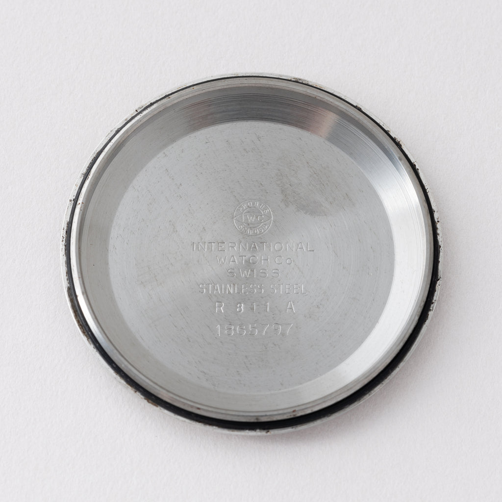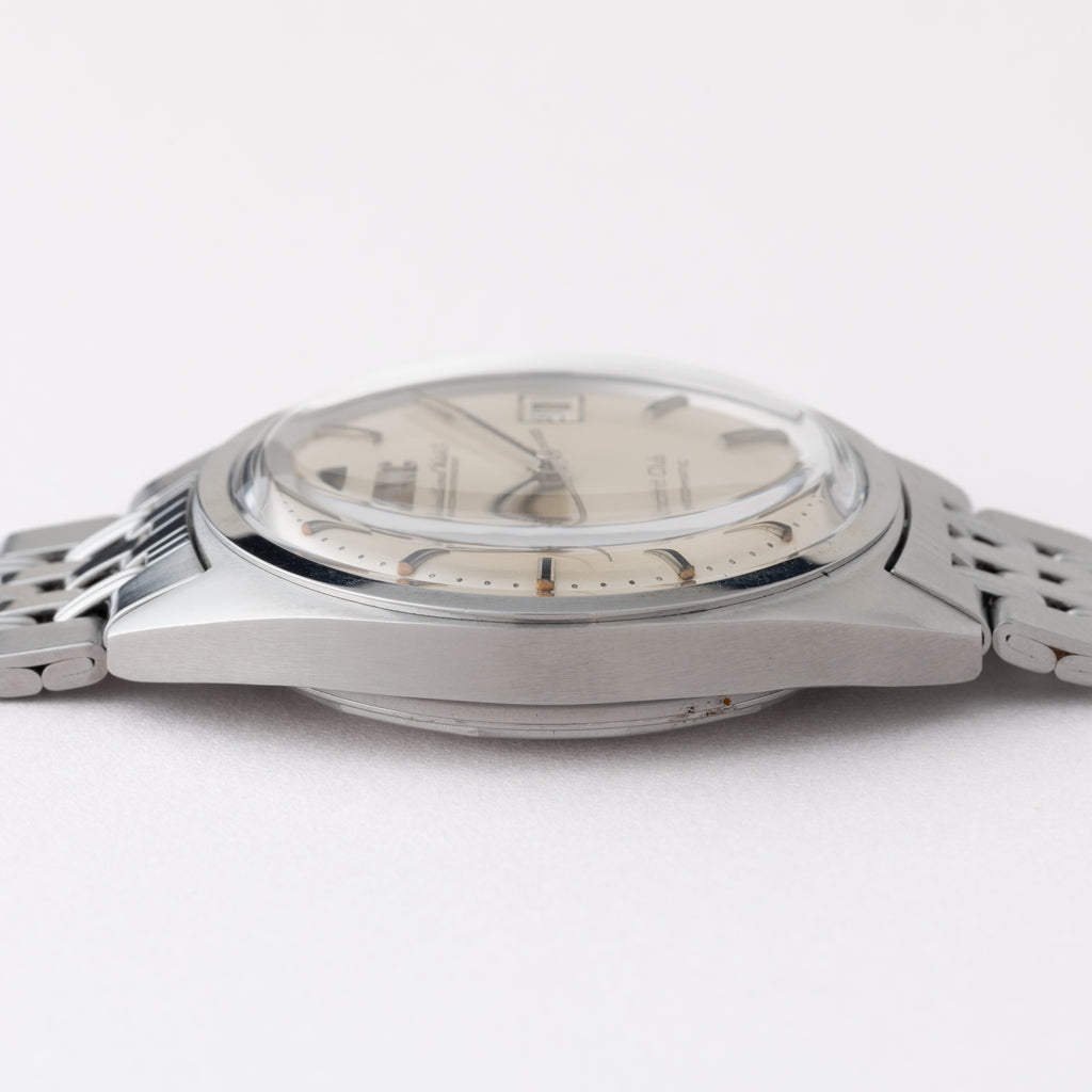 インターナショナルウォッチカンパニーのヨットクラブ1970年製です。シンプルながら防水構造のスポーツウォッチで、しっかりとした厚みがあり存在感があります。文字盤は非常に綺麗です。ケースは小キズが見られますが大きなダメージはありません。ムーブメントはペラトン式巻き上げのCal.8541Bで綺麗な状態です。手巻きや針回しの操作はスムースです。純正のGFブレス付きです。