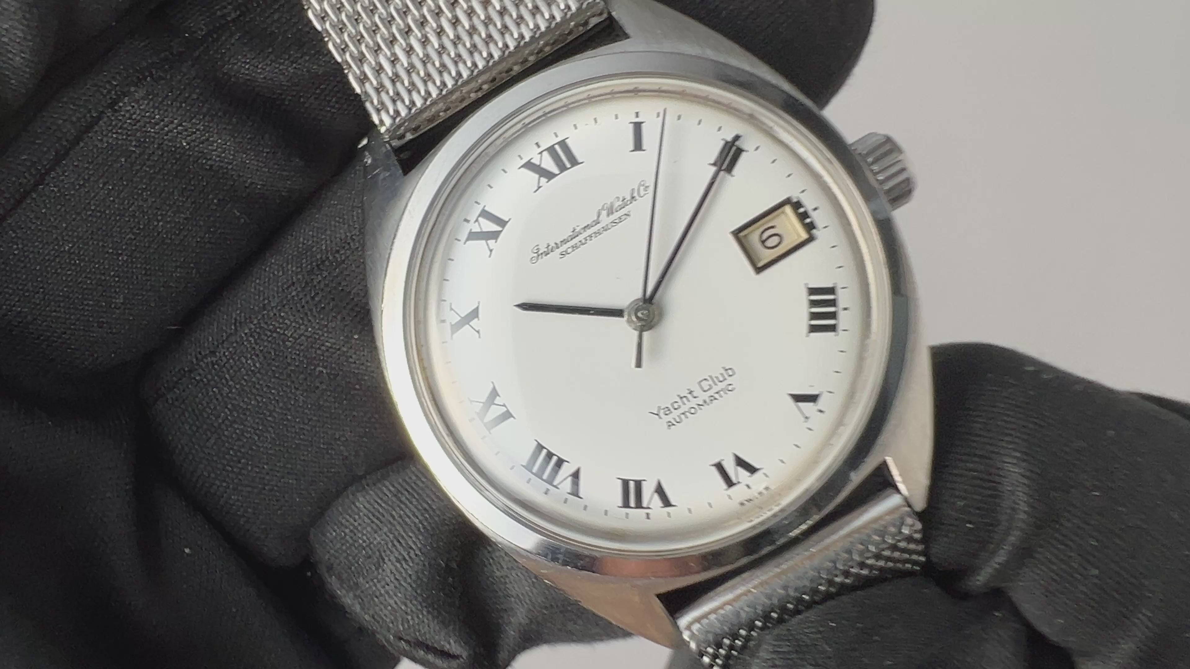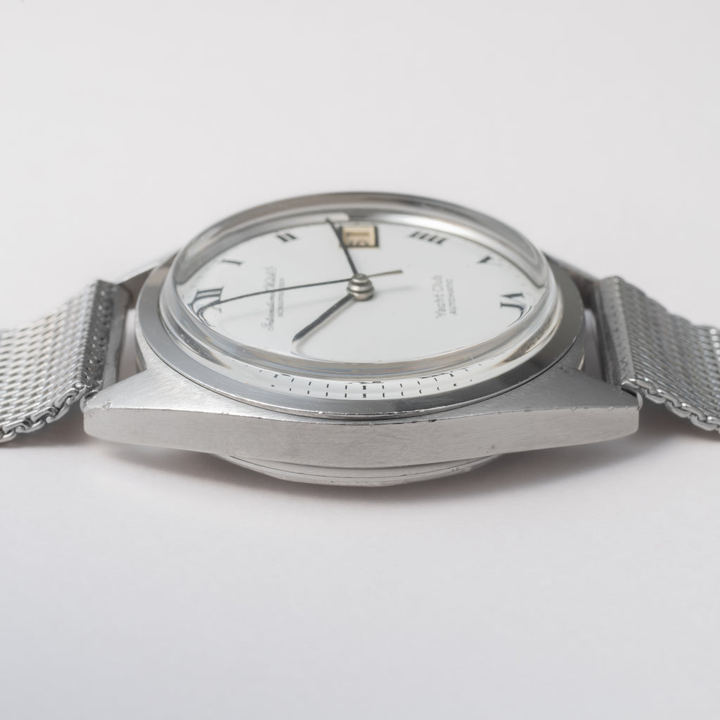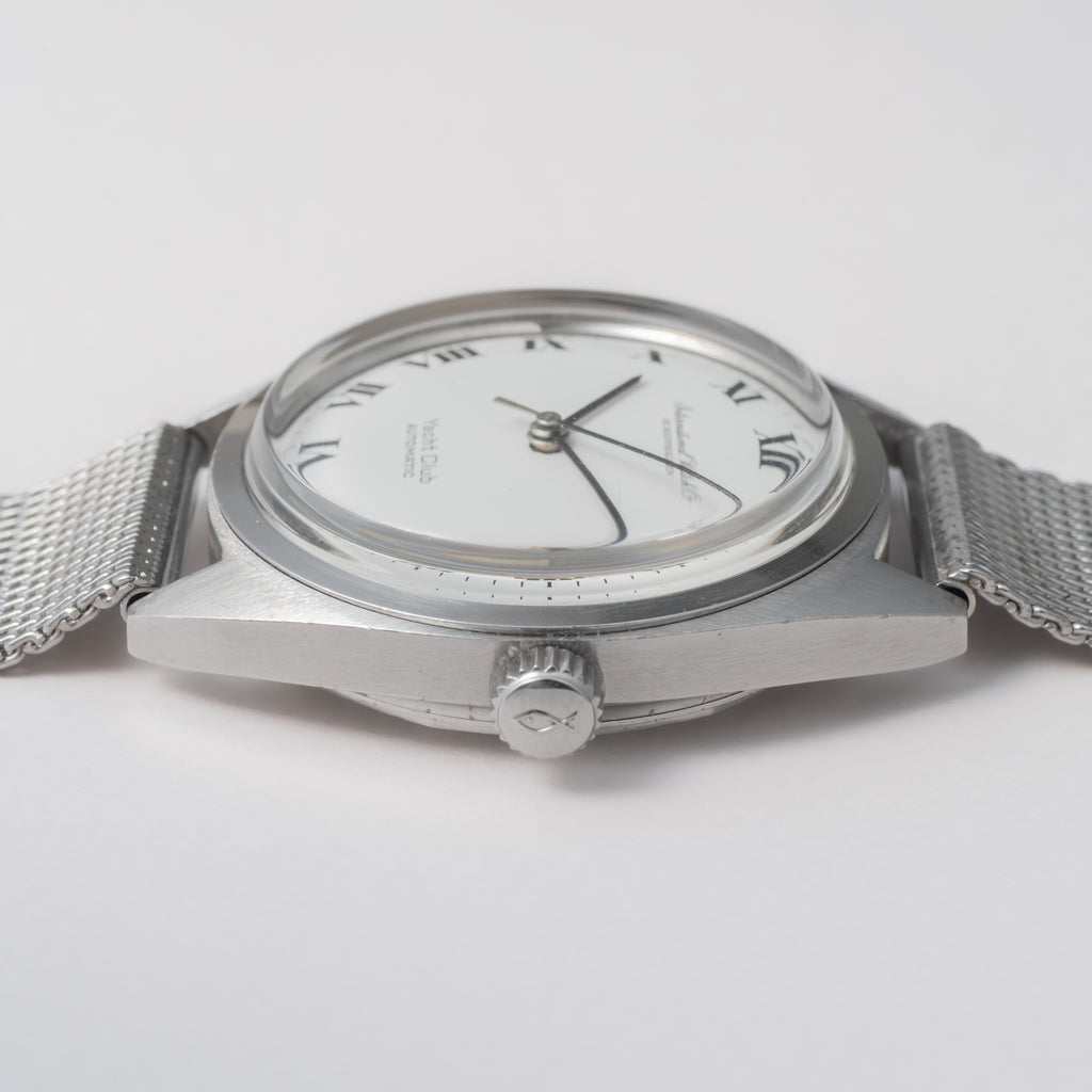 IWC ヨットクラブ  1971年製 Cal.8541B 純正メッシュブレス付き ホワイトローマンダイヤルです。シンプルながら防水構造のスポーツウォッチらしく、しっかりとした厚みがあり存在感があります。珍しいホワイトローマンダイヤルは肉眼で綺麗なコンディションを維持しています。ケースは小キズが見られますが大きなダメージはありません。ムーブメントはペラトン式巻き上げのCal.8541Bを搭載、手巻きや針回しの操作はスムースです。ベルトは純正メッシュブレスが付いています。こちらは分解掃除済みです。