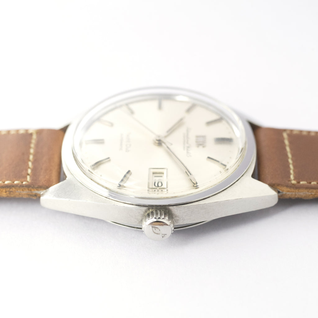 ヨットクラブはその名のとおりヨットマンの為に作られたモデルで、防水性を高める為のスクリューバックと防水リューズを搭載。機械とケースの間に特殊ラバーを配し、耐衝撃性を持たせた構造が特徴的です。ムーブメントは1964年に開発された『Cal.8541』で、IWC独自の巻き上げ方式『ペラトン式』の最晩期にあたる機械を搭載しています。ペラトン式のオートマチックムーブメントを搭載したモデルの中でも、常に人気の高いワンランク上のオールドインターです。リューズはお魚リューズです。ケースは小傷等ございますが大きなダメージはございません。革ベルトはヴィンテージモデルに相性抜群な「Accurate Form(アキュレイトフォルム)」のレザーベルトを装着しています。