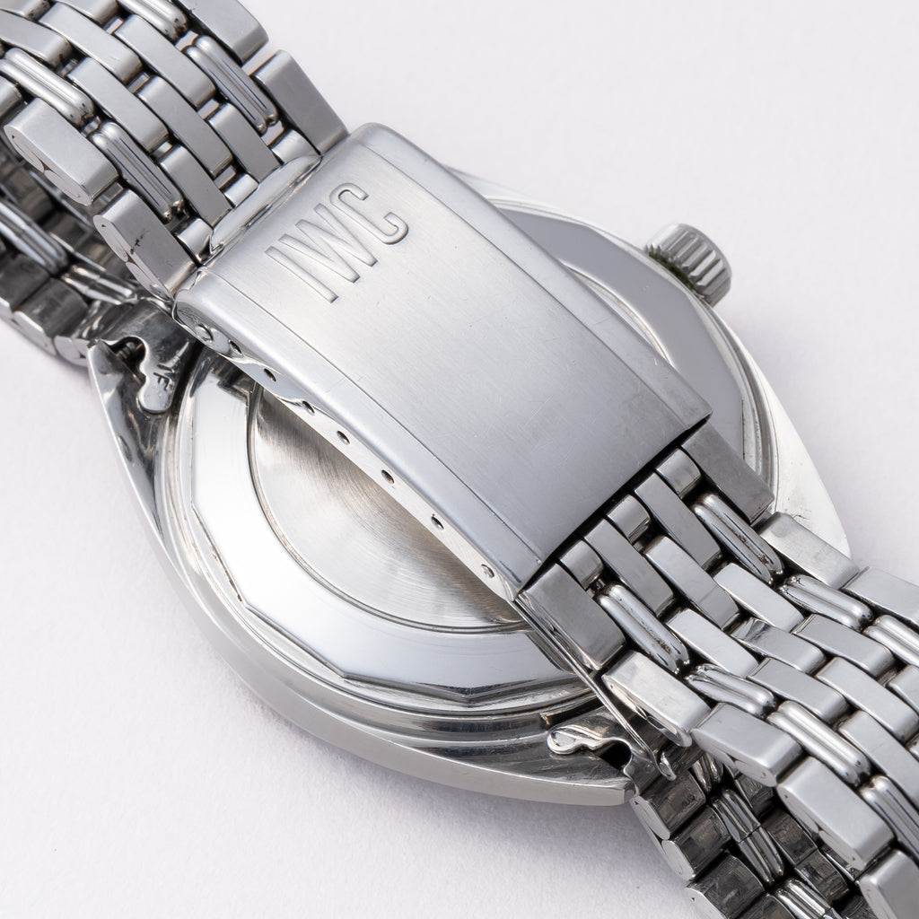 1970年製/昭和45年製のIWCヨットクラブです。ブルーマーブルの文字盤は大変希少で非常に状態も良いです。カレンダーも同じブルーマーブルなところも良いです。ヨットクラブはその名のとおりヨットマンの為に作られたモデルで、防水性を高める為のスクリューバックと防水リューズを搭載。機械とケースの間に特殊ラバーを配し、耐衝撃性を持たせた構造が特徴的です。ムーブメントは1964年に開発された『Cal.8541』で、IWC独自の巻き上げ方式『ペラトン式』の最晩期にあたる機械を搭載しています。ペラトン式のオートマチックムーブメントを搭載したモデルの中でも、常に人気の高いワンランク上のオールドインターです。リューズはお魚リューズです。ケースは小傷等ございますが大きなダメージはございません。ブレスは純正のゲイフレア―ブレスが装着されています。付属品として箱とギャランティーが付いています。